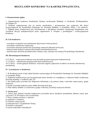 REGULAMIN KONKURSU NA KARTKĘ ŚWIĄTECZNĄ I. Postanowienia ogólne 1. Organizatorem konkursu Przedszkole Gminne im.Krasnala Hałabały w Grodzisku Wielkopolskim, ul.Chopina 24. 2. Konkurs organizowany jest na terenie przedszkola i przeznaczony jest wyłącznie dla dzieci uczęszczających do Przedszkola Gminnego im. Krasnala Hałabały w Grodzisku Wlkp. i ich rodziców. 3. Oddanie pracy konkursowej jest równoznaczne z akceptacją warunków niniejszego Regulaminu oraz wszelkich decyzji podejmowanych przez organizatora w związku z przebiegiem i rozstrzygnięciem Konkursu. II. Cele konkursu: - rozwijanie wyobraźni oraz pobudzanie aktywności twórczej dzieci, - rozwijanie wrażliwości estetycznej - stworzenie dzieciom możliwości prezentacji własnych dokonań twórczych, - kultywowanie tradycji wykonywania kartek bożonarodzeniowych, - umożliwienie dzieciom przedstawienia własnej wizji, nastroju oraz tradycji Świąt Bożego Narodzenia. III. Harmonogram Konkursu 9.12.2013r. - rozpoczęcie konkursu oraz początek przyjmowania prac konkursowych; 17.12.2013r. - zakończenie przyjmowania prac konkursowych 18.12.2013r. - rozstrzygnięcie konkursu, wręczenie nagród, ogłoszenie wyników na stronie internetowej przedszkola. IV. Uczestnictwo w Konkursie 1. W Konkursie może wziąć udział dziecko uczęszczające do Przedszkola Gminnego im. Krasnala Hałabały w Grodzisku Wlkp. 2. Zadaniem konkursowym jest przygotowanie przez dziecko we współpracy z rodzicem kartki świątecznej dowolną techniką, o wielkości max A5. 3. Do każdej pracy powinna być dołączona informacja o jej autorze (imię i nazwisko autora pracy, grupa wiekowa) 4. Każdy uczestnik konkursu może oddać dowolną ilość prac. 5. Prace należy składać u wychowawcy grupy wiekowej, do której uczęszcza dziecko. V. Ocena prac. 1. Oceny prac dokona komisja konkursowa powołana przez dyrektora przedszkola dokona oceny prac i przyzna I, II, III miejsce oraz wyróżnienia. 2. Prace zostaną ocenione w zakresie: a) zgodności z tematem, b) walorów estetycznych, c) pomysłowości i oryginalności formy, d) estetyki wykonania, e) użycia materiałów naturalnych. VI. Rozstrzygnięcie Konkursu 1. Jury oceni wartość artystyczną prac, wkład pracy włożonej w ich wykonanie, pomysłowość autora oraz zgodność tematu pracy z tematem przewodnim konkursu. 2. Wyniki konkursu ogłoszone zostaną na stronie internetowej przedszkola: www.przedszkole-grodzisk.pl; tego samego dnia nastąpi oficjalne wręczenie nagród i wyróżnień. 3. Prace biorące udział w konkursie zostaną wyeksponowane w holu przedszkola. 4. Prace konkursowe pozostają własnością organizatora konkursu. VIII. Postanowienia końcowe 1. Organizator zastrzega sobie prawo dokonywania zmian w Regulaminie w czasie trwania Konkursu. 2. Organizator zastrzega sobie prawo do nieodpłatnego wykorzystania wizerunku uczestników konkursu, a także fotografii ich prac do celów promocyjnych i reklamowych. 3. zgadzając się z warunkami regulaminu każdy uczestnik wyraża zgodę na przetwarzanie swoich danych osobowych przez organizatora w związku z organizowanym konkursem. 4. W kwestiach nieuregulowanych niniejszym Regulaminem stosuje się w szczególności przepisy Kodeksu Cywilnego oraz przepisy ustawy o prawie autorskim. 5. W trakcie trwania Konkursu treść Regulaminu Konkursu będzie dostępna na stronie internetowej pod adresem www.przedszkole-grodzisk.pl.