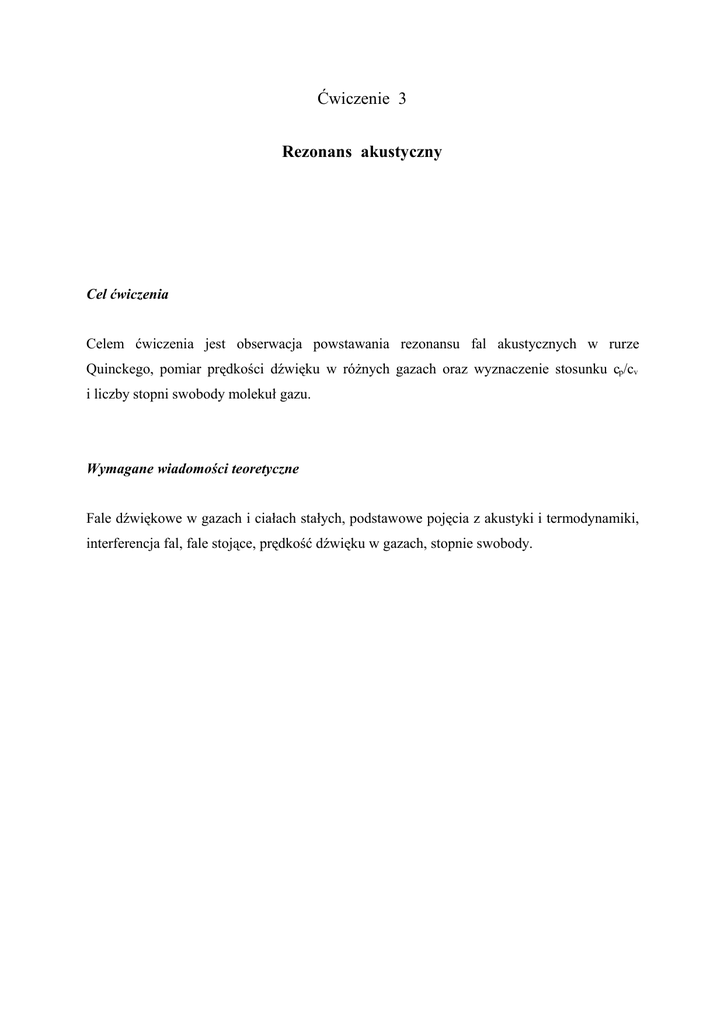 Ćwiczenie 3 Rezonans akustyczny Cel ćwiczenia Celem ćwiczenia jest obserwacja powstawania rezonansu fal akustycznych w rurze Quinckego, pomiar prędkości dźwięku w różnych gazach oraz wyznaczenie stosunku cp/cv i liczby stopni swobody molekuł gazu. Wymagane wiadomości teoretyczne Fale dźwiękowe w gazach i ciałach stałych, podstawowe pojęcia z akustyki i termodynamiki, interferencja fal, fale stojące, prędkość dźwięku w gazach, stopnie swobody. 2 Aparatura W skład zestawu do wykonania ćwiczenia wchodzi pionowa rura napełniana wodą, wraz z równoległą doń rurką szklaną o małej średnicy, służącą do obserwacji i pomiaru poziomu wody. Generator akustyczny zasila głośnik wytwarzający falę dźwiękową, który jest umieszczony na szczycie rury. Schemat układu doświadczalnego przedstawiony jest na rysunku. Wykonanie ćwiczenia Pomiar dla powietrza. 1. Opuścić głośnik do wylotu rury, włączyć generator i ustawić częstotliwość zadaną przez prowadzącego ćwiczenia. Głośność ustawić tak, by nie wywoływać przykrych wrażeń słuchowych, a jednocześnie dobrze słyszeć różnice w natężeniu dźwięku podczas pomiaru. 2. Sprawdzić, czy zawór wylotowy wody jest zakręcony i powoli napełniać rurę wodą. UWAGA: maksymalny poziom wody jest zaznaczony kolorową taśmą i NIE WOLNO go przekraczać!! Podczas napełniania wodą zaznaczać wysokość słupa wody, w momencie pojawienia się węzła fali stojącej – maksymalnego wyciszenia sygnału dźwiękowego. Po napełnieniu rury wodą i zakręceniu zaworu, ponownie zaznaczamy położenia węzłów podczas powolnego wylewania wody przez zawór wylotowy. 3. Pomiar powtórzyć dla innych, zadanych przez prowadzącego ćwiczenia częstotliwości, z zakresu 400 1600 Hz. Pomiar dla innego gazu 1. Napełnić rurę maksymalnie wodą, zakręcić zawór, podnieść głośnik i zatkać rurę korkiem. Otworzyć zawór gazu przy napełnionym zbiorniku z gazem oraz drugi zawór, z lewej strony rury Quinckego. Podczas wypuszczania wody gaz zostanie zassany do rury. Po napełnieniu rury gazem zakręcić oba zawory gazowe, odetkać rurę oraz opuścić głośnik i włączyć generator ustawiony na zadaną częstotliwość. 3 2. Powoli napełniać rurę wodą i podczas napełniania zaznaczać wysokość słupa wody w momencie pojawienia się węzła fali stojącej – maksymalnego wyciszenia sygnału dźwiękowego. 3. Po wykonaniu pomiaru i napełnieniu rury wodą powtórzyć czynności z punktu 1. dla tej samej częstotliwości dźwięku. 4. Pomiar powtórzyć dla innych zadanych częstotliwości z zakresu 400 1600 Hz. 5. Zanotować temperaturę powietrza. Wyniki wszystkich pomiarów zapisać w podanej niżej tabeli: f [Hz] 1/f [s] Położenie słupa wody w rezonansie /2 [m] sr/2 [ m] śr [m] Opracowanie wyników 1. Na podstawie pomiarów obliczyć dla każdej częstotliwości średnią długość fali. 2. Wykonać wykres w funkcji 1/f z zaznaczeniem niepewności pomiarowych – dopasować prostą do punktów eksperymentalnych. 3. Ponieważ uzyskana zależność jest prostoliniowa, więc ze współczynnika nachylenia prostej obliczyć prędkość dźwięku. 4. Prędkość dźwięku na podstawie praw gazowych opisana jest wzorem: V RT . Dla danego gazu jego skład, a zatem masa molowa , jest znana, więc znając temperaturę T można na obliczyć współczynnik =cp/cv. 5. Wartość współczynnika zależy jedynie od liczby stopni swobody molekuł gazu – i, która jest liczbą naturalną: i2 . i Z tego wzoru można wyznaczyć liczbę stopni swobody i. 6. Określić niepewności pomiarowe wyznaczania: a) długości fali, b) częstotliwości. 7. Obliczyć metodą najmniejszych kwadratów niepewności pomiarowe prędkości dźwięku. 8. Porównać liczbę stopni swobody z wielkością teoretyczną dla danego gazu. 4 9. Wyniki dla innych gazów opracować w podobny sposób. Literatura 1. M.A. Herman, A. Kalestyński i L. Widomski, Podstawy fizyki. Rozdz.6, § 2, PWN 1997. 2. D. Halliday i R. Resnick, Fizyka. Tom 1, PWN 1999. 3. Pracownia Fizyczna Wydziału Fizyki i Techniki Jądrowej AGH. Część I, wydanie drugie, pod redakcją Andrzeja Zięby, Kraków 1999. Skrypty uczelniane SU 1642, str. 146.