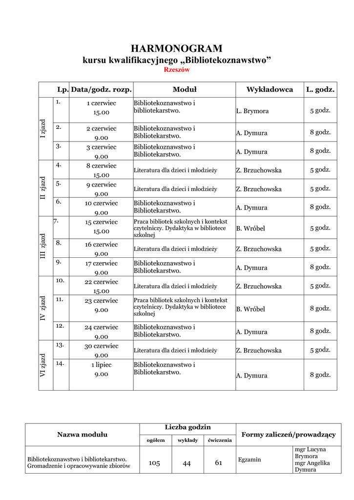 HARMONOGRAM kursu kwalifikacyjnego „Bibliotekoznawstwo” Rzeszów Lp. Data/godz. rozp. I zjazd 1. 2. 3. II zjazd 4. 5. 6. III zjazd 7. 8. 9. IV zjazd 10. 11. 12. VI zjazd 13. 14. Moduł Wykładowca L. godz. 1 czerwiec 15.00 Bibliotekoznawstwo i bibliotekarstwo. L. Brymora 5 godz. 2 czerwiec 9.00 3 czerwiec 9.00 8 czerwiec 15.00 9 czerwiec 9.00 10 czerwiec 9.00 15 czerwiec 15.00 Bibliotekoznawstwo i Bibliotekarstwo. A. Dymura 8 godz. Bibliotekoznawstwo i Bibliotekarstwo. A. Dymura 8 godz. Literatura dla dzieci i młodzieży Z. Brzuchowska 5 godz. Literatura dla dzieci i młodzieży Z. Brzuchowska 5 godz. Bibliotekoznawstwo i Bibliotekarstwo. A. Dymura 8 godz. Praca bibliotek szkolnych i kontekst czytelniczy. Dydaktyka w bibliotece szkolnej B. Wróbel 5 godz. Literatura dla dzieci i młodzieży Z. Brzuchowska 5 godz. Bibliotekoznawstwo i Bibliotekarstwo. A. Dymura 8 godz. Literatura dla dzieci i młodzieży Z. Brzuchowska 5 godz. Praca bibliotek szkolnych i kontekst czytelniczy. Dydaktyka w bibliotece szkolnej B. Wróbel 8 godz. Bibliotekoznawstwo i Bibliotekarstwo. A. Dymura 8 godz. Literatura dla dzieci i młodzieży Z. Brzuchowska 5 godz. A. Dymura 8 godz. 16 czerwiec 9.00 17 czerwiec 9.00 22 czerwiec 15.00 23 czerwiec 9.00 24 czerwiec 9.00 30 czerwiec 9.00 1 lipiec 9.00 Nazwa modułu Bibliotekoznawstwo i bibliotekarstwo. Gromadzenie i opracowywanie zbiorów Bibliotekoznawstwo i Bibliotekarstwo. Liczba godzin ogółem 105 wykłady 44 ćwiczenia 61 Formy zaliczeń/prowadzący Egzamin mgr Lucyna Brymora mgr Angelika Dymura Praca bibliotek szkolnych i kontekst czytelniczy. Dydaktyka w bibliotece szkolnej 90 47 43 Egzamin mgr Barbara Wróbel Literatura dla dzieci i młodzieży 25 10 15 Egzamin dr Zofia Brzuchowska Pedagogika twórczości 26 8 18 Praca kontrolna mgr Bożena Litwin 30 12 18 Egzamin mgr Lucyna Brymora 276 113 137 Egzamin mgr Barbara Wróbel Informacja naukowa. Internet w pracy bibliotekarza Razem Technika pracy umysłowej Godziny do dyspozycji kierownika kursu – Komputer w pracy bibliotekarza Razem Rozkład godzinowy: Piątek 15.00 – 15.20 przerwa obiadowa 15.20 – 16.05 I godz. 16.05 – 16.50 II godz. 16.50 – 17.00 przerwa 17.00 – 17.45 III godz. 17.45 – 18.30 IV godz. 18.30 – 18.40 przerwa 18.40 – 19.25 V godz. Sobota, niedziela 9.00 – 9.45 I godz. 9.45 – 10.30 II godz. 10.30 – 10.20 przerwa 10.20 – 11.05 III godz. 11.05 – 11.50 IV godz. 11.50 – 12.30 przerwa obiadowa 12.30 – 13.15 V godz. 13.15 – 14.00 VI godz. 14.00 – 14.10 przerwa 14.10 – 14.55 VII godz. 14.55 – 15.40 VIII godz. 12 12 8 8 296 mgr Lucyna Brymora HARMONOGRAM kursu kwalifikacyjnego „Bibliotekoznawstwo” Krosno Lp. Data/godz. rozp. I zjazd 15. 16. II zjazd 17. 18. 19. III zjazd 20. Wykładowca L. godz. 19 maja 9.00 20 maja 9.00 Bibliotekoznawstwo i Bibliotekarstwo. A. Dymura 8 godz. Bibliotekoznawstwo i Bibliotekarstwo. A. Dymura 8 godz. 8 czerwiec 15.00 Bibliotekoznawstwo i Bibliotekarstwo. L. Brymora 5 godz. 9 czerwiec 9.00 10 czerwiec 9.00 Bibliotekoznawstwo i Bibliotekarstwo. L. Brymora 8 godz. Literatura dla dzieci i młodzieży Z. Brzuchowska 8 godz. 15 czerwiec 15.00 Bibliotekoznawstwo i Bibliotekarstwo. L. Brymora 5 godz. 16 czerwiec 9.00 Bibliotekoznawstwo i Bibliotekarstwo. A. Dymura 8 godz. 17 czerwiec 9.00 Bibliotekoznawstwo i Bibliotekarstwo. L. Brymora 8 godz. Literatura dla dzieci i młodzieży Z. Brzuchowska 8 godz. Literatura dla dzieci i młodzieży Z. Brzuchowska 9 godz. 21. 22. IV zjazd Moduł 23. 24. 2 lipiec 9.00 3 lipiec 9.00 25. 4 lipiec 9.00 Bibliotekoznawstwo i Bibliotekarstwo. Informacja naukowa. Internet w 2 godz. L. Brymora 6 godz. pracy bibliotekarza 26. 27. 5 lipiec 9.00 Informacja naukowa. Internet w 6 lipiec 9.00 Bibliotekoznawstwo i Bibliotekarstwo. pracy bibliotekarza L. Brymora 8 godz. A. Dymura 8 godz. Liczba godzin Nazwa modułu ogółem Bibliotekoznawstwo i bibliotekarstwo. Gromadzenie i opracowywanie zbiorów Praca bibliotek szkolnych i kontekst czytelniczy. Dydaktyka w bibliotece szkolnej wykłady ćwiczenia Formy zaliczeń/prowadzący 105 44 61 Egzamin mgr Lucyna Brymora mgr Angelika Dymura 90 47 43 Egzamin mgr Barbara Wróbel dr Zofia Brzuchowska Literatura dla dzieci i młodzieży 25 10 15 Egzamin Pedagogika twórczości 26 8 18 Praca kontrolna mgr Bożena Litwin 30 12 18 Egzamin mgr Lucyna Brymora 276 113 137 Egzamin mgr Barbara Wróbel Informacja naukowa. Internet w pracy bibliotekarza Razem Technika pracy umysłowej Godziny do dyspozycji kierownika kursu – Komputer w pracy bibliotekarza Razem Rozkład godzinowy: Piątek 15.00 – 15.20 przerwa obiadowa 15.20 – 16.05 I godz. 16.05 – 16.50 II godz. 16.50 – 17.00 przerwa 17.00 – 17.45 III godz. 17.45 – 18.30 IV godz. 18.30 – 18.40 przerwa 18.40 – 19.25 V godz. 19.25 – 20.10 VI godz. Sobota, niedziela 9.00 – 9.45 I godz. 9.45 – 10.30 II godz. 10.30 – 10.20 przerwa 10.20 – 11.05 III godz. 11.05 – 11.50 IV godz. 11.50 – 12.30 przerwa obiadowa 12.30 – 13.15 V godz. 13.15 – 14.00 VI godz. 14.00 – 14.10 przerwa 14.10 – 14.55 VII godz. 14.55 – 15.40 VIII godz. 15.40 – 16. 25 IX godz. 12 12 8 8 296 mgr Lucyna Brymora