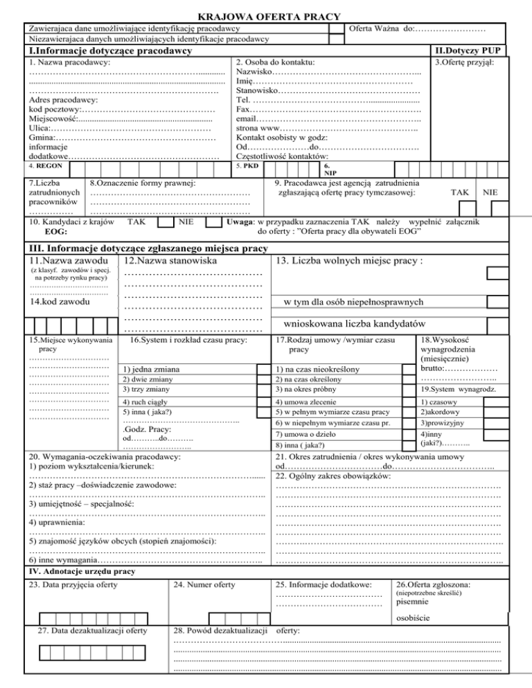 KRAJOWA OFERTA PRACY Zawierajaca dane umożliwiające identyfikację pracodawcy Niezawierajaca danych umożliwiających identyfikacje pracodawcy Oferta Ważna do:…………………… I.Informacje dotyczące pracodawcy II.Dotyczy PUP 1. Nazwa pracodawcy: …………………………………………………............ ........................................................................................ ………………………………………………………. Adres pracodawcy: kod pocztowy:……………………………………… Miejscowość:............................................................ Ulica:……………………………………………… Gmina:……………………………………………… informacje dodatkowe…………………………………………… 2. Osoba do kontaktu: Nazwisko…………………………………………... Imię……………………………………………… Stanowisko………………………………………… Tel. …………………………………....................... Fax…………………………………………………. email……………………………………………….. strona www……………………………………….. Kontakt osobisty w godz: Od…………………do……………………………. Częstotliwość kontaktów: 4. REGON 5. PKD 3.Ofertę przyjął: 6. NIP 7.Liczba 8.Oznaczenie formy prawnej: 9. Pracodawca jest agencją zatrudnienia zatrudnionych ……………………………………………… zgłaszającą ofertę pracy tymczasowej: TAK NIE pracowników ……………………………………………… …………… ……………………………………………… 10. Kandydaci z krajów TAK NIE Uwaga: w przypadku zaznaczenia TAK należy wypełnić załącznik do oferty : ”Oferta pracy dla obywateli EOG” EOG: III. Informacje dotyczące zgłaszanego miejsca pracy 11.Nazwa zawodu 12.Nazwa stanowiska 13. Liczba wolnych miejsc pracy : (z klasyf. zawodów i specj. ………………………………… na potrzeby rynku pracy) ………………………………… …………………………… …………………………… ………………………………… 14.kod zawodu w tym dla osób niepełnosprawnych ………………………………… ………………………………… wnioskowana liczba kandydatów ………………………………… 15.Miejsce wykonywania pracy ………………………… ………………………… ………………………… ………………………… ………………………… ………………………… ………………………… ………………………… 16.System i rozkład czasu pracy: 17.Rodzaj umowy /wymiar czasu pracy 18.Wysokosć wynagrodzenia (miesięcznie) brutto:……………… …………………….. 1) jedna zmiana 1) na czas nieokreślony 2) dwie zmiany 3) trzy zmiany 2) na czas określony 3) na okres próbny 4) ruch ciągły 5) inna ( jaka?) …………………………………….. .Godz. Pracy: od………..do………. …………………….. 4) umowa zlecenie 5) w pełnym wymiarze czasu pracy 1) czasowy 2)akordowy 6) w niepełnym wymiarze czasu pr. 3)prowizyjny 7) umowa o dzieło 8) inna ( jaka?) 4)inny (jaki?)……….. 19.System wynagrodz. 20. Wymagania-oczekiwania pracodawcy: 1) poziom wykształcenia/kierunek: …………………………………………………………………...... 2) staż pracy –doświadczenie zawodowe: …………………………………………………………………….. 3) umiejętność – specjalność: …………………………………………………………………….. 4) uprawnienia: …………………………………………………………………….. 5) znajomość języków obcych (stopień znajomości): …………………………………………………………………….. 6) inne wymagania……………………………………………….. IV. Adnotacje urzędu pracy 21. Okres zatrudnienia / okres wykonywania umowy od……………………………do…………………………….. 22. Ogólny zakres obowiązków: …………………………………………………………………. …………………………………………………………………. …………………………………………………………………. …………………………………………………………………. …………………………………………………………………. …………………………………………………………………. ……….…………………………………………………………. …………………………………………………………………. ………………………………………………………………….. 23. Data przyjęcia oferty 25. Informacje dodatkowe: ……………………………… ……………………………… 24. Numer oferty 26.Oferta zgłoszona: (niepotrzebne skreślić) pisemnie osobiście 27. Data dezaktualizacji oferty 28. Powód dezaktualizacji oferty: .……………………………….................................................................................................. ................................................................................................................................................... ................................................................................................................................................... ................................................................................................................................................... OŚWIADCZENIE PRACODAWCY: Art. 36 ust.5a i 5f ustawy z dnia 20 kwietnia 2004 roku o promocji zatrudnienia i instytucjach rynku pracy ( Dz.U. z 2016 r. poz. 645 z