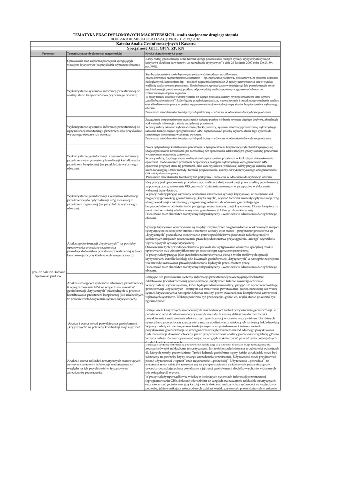 TEMATYKA PRAC DYPLOMOWYCH MAGISTERSKICH- studia stacjonarne drugiego stopnia ROK AKADEMICKI REALIZACJI PRACY 2015/2016 Katedra Analiz Geoinformacyjnych i Katastru Specjalność: GITI, GPIN, ZP, KN Promotor Tematyka pracy dyplomowej magisterskiej Krótka charakterystyka pracy Opracowanie map zagrożeń (potencjału) sprzyjających sytuacjom kryzysowym (na przykładzie wybranego obszaru). Każdy rodzaj geoinformacji (cech terenu) sprzyja powstawaniu różnych sytuacji kryzysowych (sytuacje kryzysowe określone są w ustawie „o zarządzaniu kryzysowym” z dnia 26 kwietnia 2007 roku (Dz.U. 89; poz.590)). Wykorzystanie systemów informacji przestrzennej do analizy stanu bezpieczeństwa (wybranego obszaru). Stan bezpieczeństwa może być rozpatrywany w różnorodnym uprofilowaniu. Można rozważać bezpieczeństwo „codzienne” – np. zagrożenia pożarowe, powodziowe, za-grożenia klęskami ekologicznymi, katastrofami itp. – również zagrożenia kryminalne. Z reguły generowane są one w wyniku wadliwie zapla-nowanej przestrzeni. Geoinformacje zgroma-dzone w istniejących lub postulowanych systemach informacji przestrzennej, poddane odpo-wiedniej analizie powinny wygenerować obsza-ry o zróżnicowanym stopniu zagrożeń. W pracy należy dokonać wyboru systemu bę-dącego podstawą analizy, wyboru obszaru ba-dań, wyboru „profilu bezpieczeństwa”, który będzie przedmiotem analizy, wyboru technik i metod przeprowadzenia analizy oraz sfinalizo-wanie pracy w postaci wygenerowania odpo-wiedniej mapy stanów bezpieczeństwa wybra-nego obszaru. Praca może mieć charakter teoretyczny lub praktyczny – wówczas w odniesieniu do wy-branego obszaru. Wykorzystanie systemów informacji przestrzennej do optymalizacji monitoringu przestrzeni (na przykładzie wybranego obszaru lub obiektu) Wykorzystanie geoinformacji i systemów informacji przestrzennej w procesie optymalizacji kształtowania przestrzeni bezpiecznej (na przykładzie wybranego obszaru). Wykorzystanie geoinformacji i systemów informacji przestrzennej do optymalizacji dróg ewakuacji z przestrzeni zagrożonej (na przykładzie wybranego obszaru). prof. dr hab inż. Tomasz Bajerowski prof. zw. Zarządzanie bezpieczeństwem przestrzeni z każdego punktu wi-dzenia wymaga ciągłego dopływu, aktualnych i adekwatnych informacji o stanie zarządzanej przestrzeni. W pracy należy dokonać wyboru obszaru (obiektu) analizy, sys-temu informacji przestrzennej wykorzystując aktualnie funkcjo-nujące oprogramowanie GIS i zaproponować sposoby wykorzy-stania tego systemu do skutecznego monitoringu wybranego ob-szaru. Praca może mieć charakter teoretyczny lub praktyczny – wów-czas w odniesieniu do wybranego obszaru. Proces optymalizacji kształtowania przestrzeni, w tym przestrze-ni bezpiecznej czyli charakteryzującej się specjalnymi uwarun-kowaniami, jest niemożliwy bez opracowania adekwatnej pro-gnozy stanu tej przestrzeni w użytecznym horyzoncie czasowym. W pracy należy, decydując się na analizę stanu bezpieczeństwa przestrzeni w konkretnym ukierunkowaniu opracować model-wzorzec przestrzeni bezpiecznej a następnie wykorzystując opro-gramowanie GIS opracować prognozę stanu tej przestrzeni. Jako dane wyjściowe (wejściowe) należy przyjąć aktualny stan inwen-taryzacyjny. Dobór metody i techniki prognozowania, zależny od wykorzystywanego oprogramowania GIS należy do autora pracy. Praca może mieć charakter teoretyczny lub praktyczny – wów-czas w odniesieniu do wybranego obszaru. Ideą pracy jest opracowanie procedury optymalizacji dróg ewa-kuacji przez analizę geoinformacji za pomocą oprogramowania GIS „na wzór” działania automapy w przypadku wykluczenia wybranej trasy dojazdu. W pracy należy przyjąć określony scenariusz zaistnienia sytuacji kryzysowej, w zależności od niego przyjąć kolekcję geoinforma-cji „krytycznych”, wybrać techniki i metody optymalizacji dróg (drogi) ewakuacji z określonego, zagrożonego obszaru do obsza-ru gwarantującego bezpieczeństwo w odniesieniu do przyjętego scenariusza sytuacji kryzysowej. Obszar bezpieczny musi mieć wcześniej zdefiniowany stan geoinformacji, które go charaktery-zują. Praca może mieć charakter teoretyczny lub praktyczny – wów-czas w odniesieniu do wybranego obszaru. Sytuacje kryzysowe wywoływane są między innymi przez na-gromadzenie w określonym miejscu sprzyjających im cech prze-strzeni. Powzięcie wiedzy o ich stanie – pozyskanie geoinforma-cji „krytycznych” pozwala na oszacowanie prawdopodobieństwa powstania takich sytuacji w konkretnych miejscach (oszacowanie prawdopodobieństwa przyciągnięcia „uwagi” czynników wywo-łujących sytuacje kryzysowe). Analiza geoin-formacji „krytycznych” na potrzeby Oszacowanie tych prawdopodobieństw pozwala na wytypowanie obszarów specjalnej troski i opracowania procedury szacowania prawdopodobieństwa powstania przestrzennej sytuacji opracowanie map zintensyfikowane-go monitoringu zagrożonej przestrzeni. W pracy należy przyjąć jako przedmiot zainteresowania jedną z wielu możliwych sytuacji kryzysowej (na przykładzie wybranego obszaru). kryzysowych, określić kolekcję ade-kwatnych geoinformacji „krytycznych” a następnie zaproponować metodę szacowania prawdopodobieństw będących przed-miotem pracy. Praca może mieć charakter teoretyczny lub praktyczny – wów-czas w odniesieniu do wybranego obszaru. Analiza istniejących systemów informacji przestrzennej (i oprogramowania GIS) ze względu na zawartość geoinformacji „krytycznych” niezbędnych w procesie kształtowania przestrzeni bezpiecznej (lub niezbędnych w procesie rozładowywania sytuacji kryzysowych). Analiza i ocena metod pozyskiwania geoinformacji „krytycznych” na potrzeby konstrukcji map zagrożeń Analiza i ocena nakładek tematycznych stanowiących zawartość systemów informacji przestrzennej ze względu na ich przydatność w kryzysowym zarządzaniu przestrzenią. Istniejące