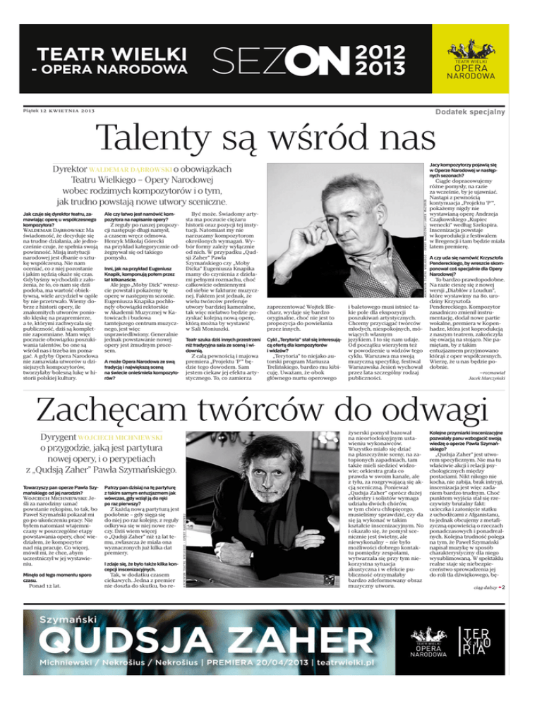 Piątek 12 kwietnia 2013 Dodatek specjalny Talenty są wśród nas Jak czuje się dyrektor teatru, zamawiając operę u współczesnego kompozytora? Waldemar Dąbrowski: Ma świadomość, że decyduje się na trudne działania, ale jednocześnie czuje, że spełnia swoją powinność. Misją instytucji narodowej jest dbanie o sztukę współczesną. Nie nam oceniać, co z niej pozostanie i jakim sędzią okaże się czas. Gdybyśmy wychodzili z założenia, że to, co nam się dziś podoba, ma wartość obiektywną, wiele arcydzieł w ogóle by nie przetrwało. Wiemy dobrze z historii opery, ile znakomitych utworów poniosło klęskę na prapremierze, a te, którymi zachwycała się publiczność, dziś są kompletnie zapomniane. Mam więc poczucie obowiązku poszukiwania talentów, bo one są wśród nas i trzeba im pomagać. A gdyby Opera Narodowa nie zamawiała utworów u dzisiejszych kompozytorów, tworzyłaby bolesną lukę w historii polskiej kultury. Ale czy łatwo jest namówić kompozytora na napisanie opery? Z reguły po naszej propozycji następuje długi namysł, a czasem wręcz odmowa. Henryk Mikołaj Górecki na przykład kategorycznie odżegnywał się od takiego pomysłu. Inni, jak na przykład Eugeniusz Knapik, komponują potem przez lat kilkanaście. Ale jego „Moby Dick” wreszcie powstał i pokażemy tę operę w następnym sezonie. Eugeniusza Knapika pochłonęły obowiązki rektorskie w Akademii Muzycznej w Katowicach i budowa tamtejszego centrum muzycznego, jest więc usprawiedliwiony. Generalnie jednak powstawanie nowej opery jest żmudnym procesem. A może Opera Narodowa ze swą tradycją i największą sceną na świecie onieśmiela kompozytorów? ARCHIWUM TEATRU WIELKIEGO – OPERY NARODOWEJ/JAREK MAZUREK Dyrektor WALDEMAR DĄBROWSKI o obowiązkach Teatru Wielkiego – Opery Narodowej wobec rodzimych kompozytorów i o tym, jak trudno powstają nowe utwory sceniczne. Być może. Świadomy artysta ma poczucie ciężaru historii oraz pozycji tej instytucji. Natomiast my nie narzucamy kompozytorom określonych wymagań. Wybór formy zależy wyłącznie od nich. W przypadku „Qudsji Zaher” Pawła Szymańskiego czy „Moby Dicka” Eugeniusza Knapika mamy do czynienia z dziełami pełnymi rozmachu, choć całkowicie odmiennymi od siebie w fakturze muzycznej. Faktem jest jednak, że wielu twórców preferuje utwory bardziej kameralne, tak więc niełatwo będzie pozyskać kolejną nową operę, którą można by wystawić w Sali Moniuszki. zaprezentować Wojtek Blecharz, wydaje się bardzo oryginalne, choć nie jest to propozycja do powielania przez innych. Teatr szuka dziś innych przestrzeni niż tradycyjna sala ze sceną i widownią. Z całą pewnością i majowa premiera „Projektu 'P'” będzie tego dowodem. Sam jestem ciekaw jej efektu artystycznego. To, co zamierza Cykl „Terytoria” stał się interesującą ofertą dla kompozytorów i widzów? „Terytoria” to niejako autorski program Mariusza Trelińskiego, bardzo mu kibicuję. Uważam, że obok głównego nurtu operowego i baletowego musi istnieć takie pole dla ekspozycji poszukiwań artystycznych. Chcemy przyciągać twórców młodych, niespokojnych, mówiących własnym językiem. I to się nam udaje. Od początku wierzyłem też w powodzenie u widzów tego cyklu. Warszawa ma swoją muzyczną specyfikę, festiwal Warszawska Jesień wychował przez lata szczególny rodzaj publiczności. Jacy kompozytorzy pojawią się w Operze Narodowej w następnych sezonach? Ciągle dopracowujemy różne pomysły, na razie za wcześnie, by je ujawniać. Nastąpi z pewnością kontynuacja „Projektu 'P'”, pokażemy nigdy nie wystawianą operę Andrzeja Czajkowskiego „Kupiec wenecki” według Szekspira. Inscenizacja powstaje w koprodukcji z festiwalem w Bregencji i tam będzie miała latem premierę. A czy uda się namówić Krzysztofa Pendereckiego, by wreszcie skomponował coś specjalnie dla Opery Narodowej? To bardzo prawdopodobne. Na razie cieszę się z nowej wersji „Diabłów z Loudun”, które wystawimy na 80. urodziny Krzysztofa Pendereckiego. Kompozytor zasadniczo zmienił instrumentację, dodał nowe partie wokalne, premiera w Kopenhadze, która jest koprodukcją z naszym teatrem, zakończyła się owacją na stojąco. Nie pamiętam, by z takim entuzjazmem przyjmowano którąś z oper współczesnych. Wierzę, że u nas będzie podobnie. —rozmawiał Jacek Marczyński Zachęcam twórców do odwagi Towarzyszy pan operze Pawła Szymańskiego od jej narodzin? Wojciech Michniewski: Jeśli za narodziny uznać powstanie rękopisu, to tak, bo Paweł Szymański pokazał mi go po ukończeniu pracy. Nie byłem natomiast wtajemniczany w poszczególne etapy powstawania opery, choć wiedziałem, że kompozytor nad nią pracuje. Co więcej, mówił mi, że chce, abym uczestniczył w jej wystawieniu. Minęło od tego momentu sporo czasu. Ponad 12 lat. Patrzy pan dzisiaj na tę partyturę z takim samym entuzjazmem jak wówczas, gdy wziął ją do ręki po raz pierwszy? Z każdą nową partyturą jest podobnie – gdy sięga się do niej po raz kolejny, z reguły odkrywa się w niej nowe rzeczy. Dziś wiem więcej o „Qudsji Zaher” niż 12 lat temu, zwłaszcza że miała ona wyznaczonych już kilka dat premiery. I zdaje się, że było także kilka koncepcji inscenizacyjnych. Tak, w dodatku czasem ciekawych. Jedna z premier nie doszła do skutku, bo re- ARCHIWUM TEATRU WIELKIEGO – OPERY NARODOWEJ Dyrygent WOJCIECH MICHNIEWSKI o przygodzie, jaką jest partytura nowej opery, i o perypetiach z „Qudsją Zaher” Pawła Szymańskiego. żyserski pomysł bazował na nieortodoksyjnym ustawieniu wykonawców. Wszystko miało się dziać na płaszczyźnie sceny, na zatopionych zapadniach, tam także mieli siedzieć widzowie; orkiestra grała co prawda w swoim kanale, ale z tyłu, za rozgrywającą się akcją sceniczną. Ponieważ „Qudsja Zaher” oprócz dużej orkiestry i solistów wymaga udziału dwóch c