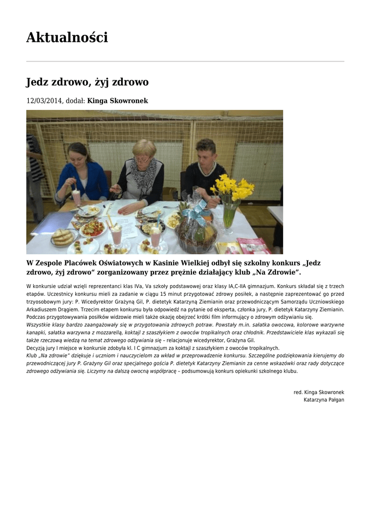 Aktualności Jedz zdrowo, żyj zdrowo 12/03/2014, dodał: Kinga Skowronek W Zespole Placówek Oświatowych w Kasinie Wielkiej odbył się szkolny konkurs „Jedz zdrowo, żyj zdrowo“ zorganizowany przez prężnie działający klub „Na Zdrowie”. W konkursie udział wzięli reprezentanci klas IVa, Va szkoły podstawowej oraz klasy IA,C-IIA gimnazjum. Konkurs składał się z trzech etapów. Uczestnicy konkursu mieli za zadanie w ciągu 15 minut przygotować zdrowy posiłek, a następnie zaprezentować go przed trzyosobowym jury: P. Wicedyrektor Grażyną Gil, P. dietetyk Katarzyną Ziemianin oraz przewodniczącym Samorządu Uczniowskiego Arkadiuszem Drągiem. Trzecim etapem konkursu była odpowiedź na pytanie od eksperta, członka jury, P. dietetyk Katarzyny Ziemianin. Podczas przygotowywania posiłków widzowie mieli także okazję obejrzeć krótki film informujący o zdrowym odżywianiu się. Wszystkie klasy bardzo zaangażowały się w przygotowania zdrowych potraw. Powstały m.in. sałatka owocowa, kolorowe warzywne kanapki, sałatka warzywna z mozzarellą, koktajl z szaszłykiem z owoców tropikalnych oraz chłodnik. Przedstawiciele klas wykazali się także rzeczową wiedzą na temat zdrowego odżywiania się – relacjonuje wicedyrektor, Grażyna Gil. Decyzją jury I miejsce w konkursie zdobyła kl. I C gimnazjum za koktajl z szaszłykiem z owoców tropikalnych. Klub „Na zdrowie” dziękuje i uczniom i nauczycielom za wkład w przeprowadzenie konkursu. Szczególne podziękowania kierujemy do przewodniczącej jury P. Grażyny Gil oraz specjalnego gościa P. dietetyk Katarzyny Ziemianin za cenne wskazówki oraz rady dotyczące zdrowego odżywiania się. Liczymy na dalszą owocną współpracę – podsumowują konkurs opiekunki szkolnego klubu. red. Kinga Skowronek Katarzyna Pałgan