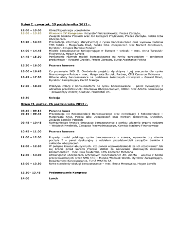 Dzień I, czwartek, 25 października 2012 r. 12.00 – 13.00 13.00 – 13.20 13.20 – 14:00 14.00 – 14.45 14.45 – 15.30 Obiad/Rejestracja uczestników Otwarcie IV Kongresu– Krzysztof Pietraszkiewicz, Prezes Zarządu, Związek Banków Polskich oraz Jan Grzegorz Prądzyński, Prezes Zarządu, Polska Izba Ubezpieczeń Prezentacja informacji statystycznej o rynku bancassurance oraz wyników badania TNS Polska – Małgorzata Knut, Polska Izba Ubezpieczeń oraz Norbert Jeziolowicz, Dyrektor, Związek Banków Polskich Modele bancassurance funkcjonujące w Europie – wnioski – mec. Anna TarasiukFlodrowska, Hogan Lovells Porównanie różnych modeli bancassistance na rynku europejskim – tendencje produktowe – Ryszard Grzelak, Prezes Zarządu, Europ Assistance Polska 15.30 – 16.00 Przerwa kawowa 16.00 – 16.45 Co przyniesie IMD II. Omówienie projektu dyrektywy i jej znaczenia dla rynku finansowego w Polsce – mec. Małgorzata Surdek, Partner, CMS Cameron McKenna Główne atuty bancassurance na podstawie światowych rozwiązań – Gerard Binet, Dyrektor Zarządzający Cardif Francja 16.45 – 17.30 17.30 – 18.00 Praktyka relacji z konsumentami na rynku bancassurance – panel dyskusyjny z udziałem przedstawicieli: Rzecznika Ubezpieczonych, UOKiK oraz Arbitra Bankowego – prowadzący Andrzej Gładysz, Prudential UK. 19.30 Kolacja Dzień II, piątek, 26 października 2012 r. 08.45 – 09.15 09.15 – 09.45 09.45 – 10:45 Poranna kawa Prezentacja III Rekomendacji Bancassurance oraz nowelizacji I Rekomendacji – Małgorzata Knut, Polska Izba Ubezpieczeń oraz Norbert Jeziolowicz, Dyrektor, Związek Banków Polskich Najważniejsze kwestie dotyczące bancassurance z punktu widzenia organu nadzoru – Wojciech Kwaśniak, Zastępca Przewodniczącego, Komisja Nadzoru Finansowego 10.45 – 11.00 Przerwa kawowa 11.00 – 12.00 13.00 – 13.30 Przyszły model polskiego rynku bancassurance – szansa, wyzwanie czy równia pochyła ? – panel dyskusyjny z udziałem przedstawicieli zarządów banków i zakładów ubezpieczeń W pułapce klauzul abuzywnych. Kto ponosi odpowiedzialność za ich stosowanie? Jak się bronić przed karami Prezesa UOKiK za naruszanie zbiorowych interesów konsumentów? - mec. Ewa Świderska, CMS Cameron McKenna Atrakcyjność ubezpieczeń ochronnych bancassurance dla klienta – wnioski z badań przeprowadzonych przez SMG KRC – Monika Woźniak-Wołek, Dyrektor Zarządzający, Departament Bancassurance, TUnŻ WARTA SA Nowe standardy obsługi bancassurance – mec. Beata Mrozowska, Hogan Lovells 13.30– 13.45 Podsumowanie Kongresu 14.00 Lunch 12.00 – 12.30 12.30 – 13.00