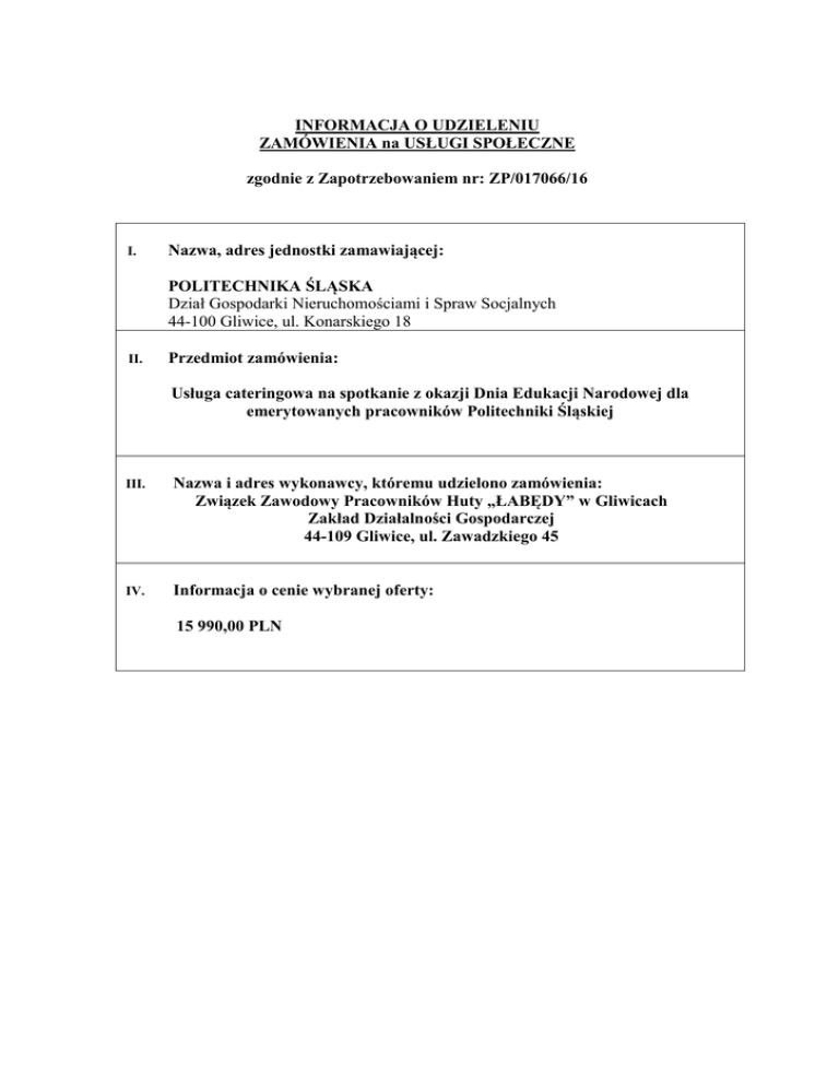 INFORMACJA O UDZIELENIU ZAMÓWIENIA na USŁUGI SPOŁECZNE zgodnie z Zapotrzebowaniem nr: ZP/017066/16 I. Nazwa, adres jednostki zamawiającej: POLITECHNIKA ŚLĄSKA Dział Gospodarki Nieruchomościami i Spraw Socjalnych 44-100 Gliwice, ul. Konarskiego 18 II. Przedmiot zamówienia: Usługa cateringowa na spotkanie z okazji Dnia Edukacji Narodowej dla emerytowanych pracowników Politechniki Śląskiej III. Nazwa i adres wykonawcy, któremu udzielono zamówienia: Związek Zawodowy Pracowników Huty „ŁABĘDY” w Gliwicach Zakład Działalności Gospodarczej 44-109 Gliwice, ul. Zawadzkiego 45 IV. Informacja o cenie wybranej oferty: 15 990,00 PLN