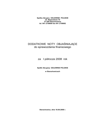 Spółka Akcyjna ODLEWNIE POLSKIE Al. Wyzwolenia 70 27-200 Starachowice tel. 041 2758600 fax 041 2758682 DODATKOWE NOTY OBJAŚNIAJĄCE do sprawozdania finansowego za I półrocze 2008 rok Spółki Akcyjnej ODLEWNIE POLSKIE w Starachowicach Starachowice, dnia 18.09.2008 r. Spółka Akcyjna ODLEWNIE POLSKIE z siedzibą w Starachowicach ZARZĄD SPÓŁKI AKCYJNEJ ODLEWNIE POLSKIE z siedzibą w Starachowicach PREZES ZARZĄDU …………………………………. Zbigniew Ronduda WICEPREZES ZARZĄDU ………………………………….. Leszek Walczyk WICEPREZES ZARZĄDU …………………………………… Ryszard Pisarski Dodatkowe noty objaśniające do sprawozdania finansowego za I półrocze 2008 roku 2 Spółka Akcyjna ODLEWNIE POLSKIE z siedzibą w Starachowicach 1. Instrumenty finansowe Działalność Spółki Akcyjnej Odlewnie Polskie w I półroczu 2007 r. finansowana była głównie środkami własnymi oraz obcymi źródłami finansowania w postaci zobowiązań handlowych i pozostałych oraz kredytów bankowych. Bankami finansującymi działalność bieŜącą Spółki były: Bank Pekao SA z siedzibą w Warszawie działający jako następca prawny Banku BPH SA z siedzibą w Krakowie, a takŜe Fortis Bank Polska S.A. z siedzibą w Warszawie , Bank Millennium SA z siedzibą w Warszawie, Deutsche Bank Frankfurt/ M. Spółka korzystała teŜ z kredytu w Fortis Bank Polska S.A. z siedzibą w Warszawie zaciągniętego w 2007r. na finansowanie projektu inwestycyjnego : „WdroŜenie Zintegrowanego Systemu Topienia i Obróbki Pozapiecowej Stopów śelaza”, kredytu w Volkswagen Bank Polska S.A. z siedzibą w Warszawie zaciągniętego w 2005 r. na zakup dwóch samochodów Passat Limousin i w 2007 r. na zakup dwóch samochodów Volkswagen Passat Limousin. W latach 2005 – I półrocze 2008 Spółka podpisała z Fortis Bankiem S.A. w Warszawie, Millennium Bankiem S.A. w Warszawie, Bankiem DnB NORD Polska S.A. w Warszawie, Citibankiem S.A. w Warszawie, Raiffeisen Bankiem S.A. w Warszawie, BGś S.A. w Warszawie, PKO BP S.A. w Warszawie oraz Bankiem Pekao S.A. w Warszawie umowy ramowe dotyczące Transakcji Opcji. Odlewnie Polskie SA stosują instrumenty finansowe zabezpieczające przed ryzykiem kursowym. 2. Zobowiązania warunkowe Spółki na koniec I półrocza 2008 r. nie wystąpiły. 3. Zobowiązania wobec budŜetów miast i gmin z tytułu uzyskania prawa własności budynków i budowli na koniec miesiąca czerwca 2008 r. nie wystąpiły i nie figurują w ewidencji pozabilansowej . 4. W I półroczu 2008 roku nie wystąpiły zjawiska: zaniechania produkcji, cykliczności i sezonowości działalności. Nie miały miejsca emisja akcji, wykup i spłata dłuŜnych i kapitałowych papierów wartościowych innych podmiotów. Spółka w I półroczu 2008r. nabyła 125.000 szt. akcji własnych, które w ramach programu opcji menedŜerskich będą zaoferowane kluczowym pracownikom Spółki. Nie wypłacano teŜ w bieŜącym roku dywidendy. Uchwałą Nr 7 /2008 Zwyczajnego Walnego Zgromadzenia Akcjonariuszy zysk netto Spółki Akcyjnej Odlewnie Polskie za rok 2007 został przeznaczony na pokrycie strat z lat ubiegłych w kwocie 2.804.612,36 zł., na kapitał zapasowy w kwocie 623.239,55 zł. i na kapitał rezerwowy, z którego Spółka finansować będzie zakup akcji własnych w celu ich zaoferowania uprawnionym pracownikom w ramach programu opcji menedŜerskich w kwocie 1.140.000,00 zł. 5. W Odlewnie Polskie S.A. nie wystąpił własne potrzeby. w I półroczu 2008 roku koszt wytworzenia świadczeń na 6. Poniesione nakłady inwestycyjne do końca miesiąca czerwca 2008 roku wyniosły 3.386 tys. zł. W kwocie poniesionych nakładów, nakłady na ochronę środowiska naturalnego stanowiły 562 tys. zł. Planowane nakłady inwestycyjne w okresie 12 miesięcy po dniu bilansowym szacuje się na wartość 9.015 tys. zł. Z kwoty planowanych nakładów na ochronę środowiska planuje się przeznaczyć 180 tys. zł. 7. W okresie od stycznia do czerwca 2008r. nie wystąpiły zmiany w strukturze organizacyjnej Spółki w wyniku połączenia jednostek gospodarczych, przejęcia lub sprzedaŜy jednostek, podziału, restrukturyzacji i zaniechania działalności. 8. W okresie od stycznia do czerwca 2008 r. Spółka dwukrotnie otrzymała informację o zmianie w stanie posiadania akcji przez Wiceprezesa Zarządu Pana Leszka Walczyka. W dniu 25 czerwca 2008 r. Wiceprezes Zarządu Pan Leszek Walczyk zakupił w obrocie giełdowym 5.000 szt. akcji Odlewni Polskich S.A. w Starachowicach po cenie 3,40 zł za akcję oraz w dniu 26 czerwca 2008 r. 5.000 szt. akcji po cenie 3,40 PLN za akcję . Przed nabyciem Wiceprezes Zarządu Dodatkowe noty objaśniające do sprawozdania finansowego za I półrocze 2008 roku 3 Spółka Akcyjna ODLEWNIE POLSKIE z siedzibą w Starachowicach Pan Leszek Walczyk posiadał 482.683 akcje, co stanowiło 3,80 % ogólnej liczby akcji i dawało tyle samo głosów na zgromadzeniu Spółki, po nabyciu posiada 492.683 akcje co stanowi 3,88 % akcji w kapitale zakładowym tejŜe Spółki i daje tyle samo głosów na zgromadzeniu Spółki. Spółka nie otrzymała informacji o zmianach w stanie posiadania akcji przez inne osoby zarządzające i nadzorujące. Wykonując postanowienia Uchwały Nr 2/2004 NWZA Odlewnie Polskie S.A. z dnia 05.08.2004 r. w sprawie przyjęcia zasad programu opcji menadŜerskich Spółka zawarła w dniu 28.01.2005 r. umowy opcji z Członkami Zarządu. Zgodnie z zawartymi umowami Spółka złoŜy do dnia 31 grudnia 2011 r. nieodwołalną ofertę nabycia akcji Spółki zakupionych przez Spółkę w ramach programu opcji menedŜerskich : Panu Prezesowi Zarządu Zbigniewowi Rondudzie 50.000 akcji, Panu Wiceprezesowi Zarządu Leszkowi Walczykowi 50.000 akcji, Panu Wiceprezesowi Zarządu Ryszardowi Pisarskiemu 50.000 akcji. 9. Na koniec czerwca 2008 r. nie toczyły się przed sądami, organami właściwymi dla postępowania arbitraŜowego lub organami administracji publiczn