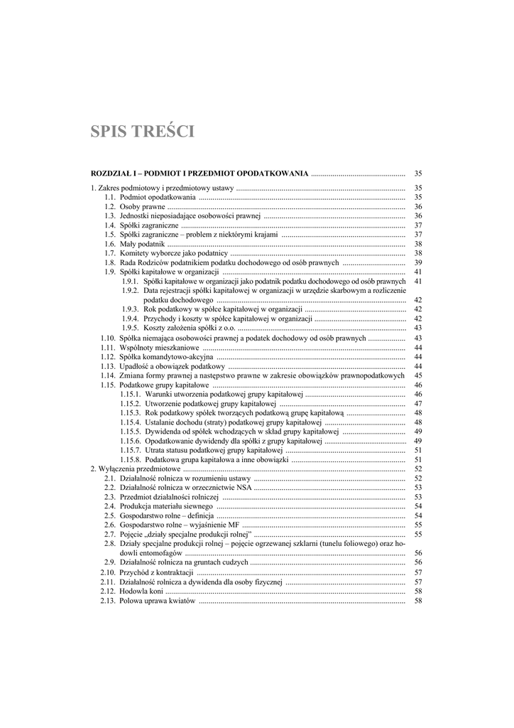 SPIS TREŚCI ROZDZIAŁ I – PODMIOT I PRZEDMIOT OPODATKOWANIA ................................................ 35 1. Zakres podmiotowy i przedmiotowy ustawy ...................................................................................... 1.1. Podmiot opodatkowania ......................................................................................................... 1.2. Osoby prawne ......................................................................................................................... 1.3. Jednostki nieposiadające osobowości prawnej ........................................................................ 1.4. Spółki zagraniczne .................................................................................................................. 1.5. Spółki zagraniczne – problem z niektórymi krajami ............................................................... 1.6. Mały podatnik ......................................................................................................................... 1.7. Komitety wyborcze jako podatnicy ......................................................................................... 1.8. Rada Rodziców podatnikiem podatku dochodowego od osób prawnych ................................ 1.9. Spółki kapitałowe w organizacji ............................................................................................. 1.9.1. Spółki kapitałowe w organizacji jako podatnik podatku dochodowego od osób prawnych 1.9.2. Data rejestracji spółki kapitałowej w organizacji w urzędzie skarbowym a rozliczenie podatku dochodowego ................................................................................................... 1.9.3. Rok podatkowy w spółce kapitałowej w organizacji ..................................................... 1.9.4. Przychody i koszty w spółce kapitałowej w organizacji ................................................ 1.9.5. Koszty założenia spółki z o.o. ........................................................................................ 1.10. Spółka niemająca osobowości prawnej a podatek dochodowy od osób prawnych ................... 1.11. Wspólnoty mieszkaniowe ....................................................................................................... 1.12. Spółka komandytowo-akcyjna ................................................................................................ 1.13. Upadłość a obowiązek podatkowy .......................................................................................... 1.14. Zmiana formy prawnej a następstwo prawne w zakresie obowiązków prawnopodatkowych 1.15. Podatkowe grupy kapitałowe .................................................................................................. 1.15.1. Warunki utworzenia podatkowej grupy kapitałowej ................................................... 1.15.2. Utworzenie podatkowej grupy kapitałowej ................................................................ 1.15.3. Rok podatkowy spółek tworzących podatkową grupę kapitałową .............................. 1.15.4. Ustalanie dochodu (straty) podatkowej grupy kapitałowej ......................................... 1.15.5. Dywidenda od spółek wchodzących w skład grupy kapitałowej ................................ 1.15.6. Opodatkowanie dywidendy dla spółki z grupy kapitałowej ............................................ 1.15.7. Utrata statusu podatkowej grupy kapitałowej ............................................................. 1.15.8. Podatkowa grupa kapitałowa a inne obowiązki .......................................................... 2. Wyłączenia przedmiotowe ................................................................................................................. 2.1. Działalność rolnicza w rozumieniu ustawy ............................................................................. 2.2. Działalność rolnicza w orzecznictwie NSA ............................................................................. 2.3. Przedmiot działalności rolniczej ............................................................................................. 2.4. Produkcja materiału siewnego ................................................................................................ 2.5. Gospodarstwo rolne – definicja ................................................................................................ 2.6. Gospodarstwo rolne – wyjaśnienie MF ................................................................................... 2.7. Pojęcie „działy specjalne produkcji rolnej” ............................................................................. 2.8. Działy specjalne produkcji rolnej – pojęcie ogrzewanej szklarni (tunelu foliowego) oraz hodowli entomofagów ................................................................................................................ 2.9. Działalność rolnicza na gruntach cudzych ............................................................................... 2.10. Przychód z kontraktacji .......................................................................................................... 2.11. Działalność rolnicza a dywidenda dla osoby fizycznej ............................................................. 2.12. Hodowla koni .......................................................................................................................... 2.13. Polowa uprawa kwiatów ......................................................................................................... 35 35 36 36 37 37 38 38 39 41 41 42 42 42 43 43 44 44 44 45 46 46 47 48 48 49 49 51 51 52 52 53 53 54 54 55 55 56 56 57 57 58 58 6 2.14. 2.15. 2.16. 2.17. 2.18. 2.19. 2.20. 2.21. 2.22. 2.23. 2.24. 2.25. Łuskanie cebulek kwiatowych a działalność rolnicza .............................................................. Przychody i koszty uzyskania przychod