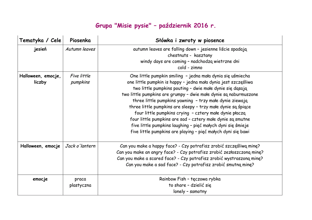 Grupa "Misie pysie" – październik 2016 r. Tematyka / Cele Piosenka Słówka i zwroty w piosence jesień Autumn leaves autumn leaves are falling down – jesienne liście spadają chestnuts - kasztany windy days are coming – nadchodzą wietrzne dni cold - zimno Halloween, emocje, liczby Five little pumpkins One little pumpkin smiling – jedna mała dynia się uśmiecha one little pumpkin is happy – jedna mała dynia jest szczęśliwa two little pumpkins pouting – dwie małe dynie się dąsają two little pumpkins are grumpy – dwie małe dynie są naburmuszone three little pumpkins yawning – trzy małe dynie ziewają three little pumpkins are sleepy – trzy małe dynie są śpiące four little pumpkins crying – cztery małe dynie płaczą four little pumpkins are sad – cztery małe dynie są smutne five little pumpkins laughing – pięć małych dyni się śmieje five little pumpkins are playing – pięć małych dyni się bawi Halloween, emocje Jack o'lantern Can you make a happy face? - Czy potrafisz zrobić szczęśliwą minę? Can you make an angry face? - Czy potrafisz zrobić zezłoszczoną minę? Can you make a scared face? - Czy potrafisz zrobić wystraszoną minę? Can you make a sad face? - Czy potrafisz zrobić smutną minę? emocje praca plastyczna Rainbow Fish – tęczowa rybka to share – dzielić się lonely – samotny sad – smutny upset – zmartwiony selfish – samolubny a scale - łuska Książeczka wyd. Usborne "The clever rabbit and wolves''