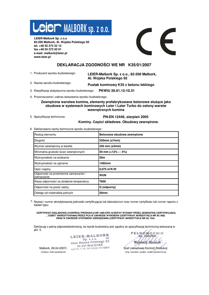 LEIER-Malbork Sp. z o.o 82-200 Malbork, Al. Wojska Polskiego 92 tel. +48 55 272 32 12 fax +48 55 272 50 01 e-mail: [email protected] www.leier.pl DEKLARACJA ZGODNOŚCI WE NR K35/01/2007 1. Producent wyrobu budowlanego: LEIER-Malbork Sp. z o.o., 82-200 Malbork, Al. Wojska Polskiego 92 2. Nazwa wyrobu budowlanego: Pustak kominowy K35 z betonu lekkiego 3. Klasyfikacja statystyczna wyrobu budowlanego: PKWiU 26.61.12-10.31 4. Przeznaczenie i zakres stosowania wyrobu budowlanego: Zewnętrzna warstwa komina, elementy prefabrykowane betonowe słuŜące jako obudowa w systemach kominowych Leier i Leier Turbo do osłony warstw wewnętrznych komina 5. Specyfikacja techniczna: PN-EN 12446, sierpień 2005 Kominy. Części składowe. Obudowy zewnętrzne. 6. Deklarowane cechy techniczne wyrobu budowlanego: Rodzaj elementu Betonowa obudowa zewnętrzna Długość 330mm (±7mm) Wymiar wewnętrzny w świetle 250 mm (±3mm) Minimalna grubość ścian zewnętrznych: 50 mm (+12% ; - 5%) Wytrzymałość na ściskanie 20m Wytrzymałość na zginanie 1485mm Opór cieplny 0,075 m2K/W Odporność na przemienne zamarzanie i odmarzanie WUN Klasa odporności na działanie temperatury T600 Odporność na poŜar sadzy G (odporny) Odstęp od materiałów palnych 20mm 7. Nazwa i numer akredytowanej jednostki certyfikującej lub laboratorium oraz numer certyfikatu lub numer raportu z badań typu: CERTYFIKAT ZAKŁADOWEJ KONTROLI PRODUKCJI NR 1489-CPD-10/ZKP/07 WYDANY PRZEZ JEDNOSTKĘ CERTYFIKUJĄCĄ „ CEBET”AKREDYTOWANĄ PRZEZ PCA W ZAKRESIE WYROBÓW (CERTYFIKAT AKREDYTACJI NR AC 008) ORAZ W ZAKRESIE SYSTEMÓW ZARZĄDZANIA (CERTYFIKAT AKREDYTACJI NR AC 104). Deklaruję z pełną odpowiedzialnością, Ŝe wyrób budowlany jest zgodny ze specyfikacją techniczną wskazaną w pkt. 5. Malbork, 26.04.2007r. Szef zakładowej Kontroli Produkcji (miejsce i data wystawienia) (imię, nazwisko i podpis osoby upowaŜnionej) LEIER-Malbork Sp. z o.o 82-200 Malbork, Al. Wojska Polskiego 92 tel. +48 55 272 32 12 fax +48 55 272 50 01 e-mail: [email protected] www.leier.pl DEKLARACJA ZGODNOŚCI WE NR K35L/02/2007 1. Producent wyrobu budowlanego: LEIER-Malbork Sp. z o.o., 82-200 Malbork, Al. Wojska Polskiego 92 2. Nazwa wyrobu budowlanego: Pustak kominowy K35L z betonu lekkiego 3. Klasyfikacja statystyczna wyrobu budowlanego: PKWiU 26.61.12-10.31 4. Przeznaczenie i zakres stosowania wyrobu budowlanego: Zewnętrzna warstwa komina, elementy prefabrykowane betonowe słuŜące jako obudowa w systemach kominowych Leier i Leier Turbo do osłony warstw wewnętrznych komina 5. Specyfikacja techniczna: PN-EN 12446, sierpień 2005 Kominy. Części składowe. Obudowy zewnętrzne. 6. Deklarowane cechy techniczne wyrobu budowlanego: Rodzaj elementu Betonowa obudowa zewnętrzna Długość 330mm (±7mm) Wymiar wewnętrzny w świetle 250 mm (±3mm) Minimalna grubość ścian zewnętrznych: 50 mm (+12% ; - 5%) Wytrzymałość na ściskanie 20m Wytrzymałość na zginanie 1485mm Opór cieplny 0,077 m2K/W Odporność na przemienne zamarzanie i odmarzanie WUN Klasa odporności na działanie temperatury T600 Odporność na poŜar sadzy G (odporny) Odstęp od materiałów palnych 20mm 7. Nazwa i numer akredytowanej jednostki certyfikującej lub laboratorium oraz numer certyfikatu lub numer raportu z badań typu: CERTYFIKAT ZAKŁADOWEJ KONTROLI PRODUKCJI NR 1489-CPD-10/ZKP/07 WYDANY PRZEZ JEDNOSTKĘ CERTYFIKUJĄCĄ „ CEBET”AKREDYTOWANĄ PRZEZ PCA W ZAKRESIE WYROBÓW (CERTYFIKAT AKREDYTACJI NR AC 008) ORAZ W ZAKRESIE SYSTEMÓW ZARZĄDZANIA (CERTYFIKAT AKREDYTACJI NR AC 104). Deklaruję z pełną odpowiedzialnością, Ŝe wyrób budowlany jest zgodny ze specyfikacją techniczną wskazaną w pkt. 5. Malbork, 26.04.2007r. Szef zakładowej Kontroli Produkcji (miejsce i data wystawienia) (imię, nazwisko i podpis osoby upowaŜnionej) LEIER-Malbork Sp. z o.o 82-200 Malbork, Al. Wojska Polskiego 92 tel. +48 55 272 32 12 fax +48 55 272 50 01 e-mail: [email protected] www.leier.pl DEKLARACJA ZGODNOŚCI WE NR K40/03/2007 1. Producent wyrobu budowlanego: LEIER-Malbork Sp. z o.o., 82-200 Malbork, Al. Wojska Polskiego 92 2. Nazwa wyrobu budowlanego: Pustak kominowy K40 z betonu lekkiego 3. Klasyfikacja statystyczna wyrobu budowlanego: PKWiU 26.61.12-10.31 4. Przeznaczenie i zakres stosowania wyrobu budowlanego: Zewnętrzna warstwa komina, elementy prefabrykowane betonowe słuŜące jako obudowa w systemach kominowych Leier i Leier Turbo do osłony warstw wewnętrznych komina 5. Specyfikacja techniczna: PN-EN 12446, sierpień 2005 Kominy. Części składowe. Obudowy zewnętrzne. 6. Deklarowane cechy techniczne wyrobu budowlanego: Rodzaj elementu Betonowa obudowa zewnętrzna Długość 330mm (±7mm) Wymiar wewnętrzny w świetle 300 mm (±3mm) Minimalna grubość ścian zewnętrznych: 50 mm (+12% ; - 5%) Wytrzymałość na ściskanie 20m Wytrzymałość na zginanie 1485mm Opór cieplny 0,073 m2K/W Odporność na przemienne zamarzanie i odmarzanie WUN Klasa odporności na działanie temperatury T600 Odporność na poŜar sadzy G (odporny) Odstęp od materiałów palnych 20mm 7. Nazwa i numer akredytowanej jednostki certyfikującej lub laboratorium oraz numer certyfikatu lub numer raportu z badań typu: CERTYFIKAT ZAKŁADOWEJ KONTROLI PRODUKCJI NR 1489-CPD-10/ZKP/07 WYDANY PRZEZ JEDNOSTKĘ CERTYFIKUJĄCĄ „ CEBET”AKREDYTOWANĄ PRZEZ PCA W ZAKRESIE WYROBÓW (CERTYFIKAT AKREDYTACJI NR AC 008) ORAZ W ZAKRESIE SYSTEMÓW ZARZĄDZANIA (CERTYFIKAT AKREDYTACJI NR AC 104). Deklaruję z pełną odpowiedzialnością, Ŝe wyrób budowlany jest zgodny ze specyfikacją techniczną wskazaną w pkt. 5. Malbork, 26.04.2007r. Szef zakładowej Kontroli Produkcji (miejsce i data wystawienia) (imię, nazwisko i podpis osoby upowaŜnionej) LEIER-Malbork Sp. z o.o 82-200 Malbork, Al. Wojska Polskiego 92 tel. +48 55 272 32 12 fax +48 55 272 50 01 e-mail: [email protected] www.leier.pl DEKLARACJA ZGODNOŚCI WE NR K40L/04/2007 1. Producent wyrobu budowlanego: LEIER-Malbork Sp. z o.o., 82-200 Mal