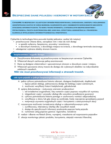 Bezpieczne dane pojazdu i kierowcy w motoryzacji CipherMe to bezpieczny i elastyczny sposób przechowywania, zarzadzania, dostepu i wzajemnego udostepniania danych w coraz bardziej zagrozonym lecz i niezbednym nowoczesnym sieciowym otoczeniu informatycznym. To nowa twarz Internetu, z integralnymi bezpieczenstwem i prywatnoscia, poczta elektroniczna bez junk mail, efektywna administracja i prawdziwa eliminacja wykluczenia informatycznego dla wszystkich. CipherMe to technologia która pozwala kaŜdej jednostce: osobie lub instytucji przechowywać własne dane, zarządzać nimi i mieć do nich dostęp w sposób wyłączny, bezpieczny, prywatny i anonimowy, w dowolnym momencie, z dowolnego miejsca na świecie, z dowolnego terminala sieciowego udostępniać wybrane obiekty stronom trzecim. bezpieczeństwo i wygoda dostępu A B C D Zaszyfrowane dokumenty są przechowywane na bezpiecznym serwerze CipherMe. Właściciel danych zachowuje pełną anonimowość. Dane są dostępne właścicielowi i upowaŜnionym stronom w dowolnym czasie i miejscu. Właściciel upowaŜnia strony trzecie do dostępu do wybranych obiektów na indywidualnie ustalonych zasadach. Nikt nie musi przechowywać informacji o stronach trzecich. całe Ŝycie pojazdu w jednym bezpiecznym miejscu dostępnym przez kartę pojazdu A pełna cyfrowo potwierdzona historia zdarzeń, dostępna kiedykolwiek, skądkolwiek i. lepsza jakość obsługi, jednoznaczny dostęp do katalogu części zamiennych, ii. moŜliwość weryfikacji historii kiedykolwiek, gdziekolwiek B spójna dokumentacja – motywacja wierności producentowi i. od świadectwa oryginalność, listy numerów części poprzez wszystkie ich wymiany ii. integralność części i procedur obsługi dla warunków przedłuŜenia gwarancji iii. cyfrowo potwierdzona historia pomaga w zachowaniu wartości odsprzedaŜnej iv. weryfikacja w domu lub gdy stacje są zamknięte, kiedy najczęściej sprzedajemy pojazd v. motywacja uŜywania oryginalnych części i korzystania z autoryzowanych stacji C rozszerzone moŜliwości świadczenia obsługi w zdecentralizowanym rynku i. zunifikowany, Internetowy interfejs dla wszystkich marek ii. dostęp do specyficznych informacji producenta poprzez kartę pojazdu iii. ruchomość usług poprzez granice: regionalne, narodowe D nadzór i dbanie we flotach (firma, wynajem), niezaleŜnie od rozproszenia pojazdów E okazja monitoringu jakości produktu, korzystania, statystyk wierności klienckiej e-Ja Sp. z o.o. 02-592 Warszawa, ul. Pulawska 54/56 lok. 93 Tel: +48 501 320801, e-mail: [email protected] www.e-ja.pl szybkie, efektywne i szczelne procedury odwołań A korespondencja “z pojazdem”, niezaleŜnie od zmian właściciela i. ostrzeŜenie podczas najbliŜszej wizyty w kaŜdym autoryzowanym punkcie obsługi ii. rejestracja w przestrzeni pojazdu dla eliminacji tłumaczenia się brakiem wiedzy B certyfikacja/weryfikacja dokonanych procedur w razie litygacji C uniknięcie spadku poczucia jakości marki na rynku poprzez uniknięcie potrzeby ogłaszania w mediach – jak w problemach hamulcowych Volvo XC90 podwyŜszone bezpieczeństwo własności pojazdu A cyfrowo potwierdzone dokumenty zabezpieczone kartą B uproszczone wspólne uŜywanie, łącznie z zarządzaniem flotą i wynajmem nowa platforma usług finansowych A przestrzeganie umów rabatowych n.p. producent/leasingodawca, dystrybutor/klient B automatyczny nadzór nad pojazdem w leasingu, w zarządzanej flocie i. eksploatacja: przebiegi, zakup paliw, obsługa techniczna ii. autoryzacja napraw z moŜliwym wglądem w uzasadniającą diagnozę C ogólnoflotowy system kredytów/rabatów paliwowych D gwarancje i ubezpieczenia: bezpieczeństwo, wydajność, hermetyczność, weryfikacja E globalna platforma brokeringu usług finansowych dla uŜytkownika F ciągłość: utrzymanie kontaktu z pojazdem pomimo nawet wielokrotnych zmian właściciela minimalne koszty i ryzyka wdroŜeniowe A B C D E jednostkowa skalowalność w wymiarze liczbowym wdroŜenia skalowalność repertuaru aplikacji, natychmiastowe powszechne wdroŜenie, zmiany proste wejście na nowe rynki szeroki zakres moŜliwości programów partnerskich i współpracy z sub-kontrahentami koszt jednostkowy minimalnym ułamkiem korzyści e-Ja Sp. z o.o. 02-592 Warszawa, ul. Pulawska 54/56 lok. 93 Tel: +48 501 320801, e-mail: [email protected] www.e-ja.pl