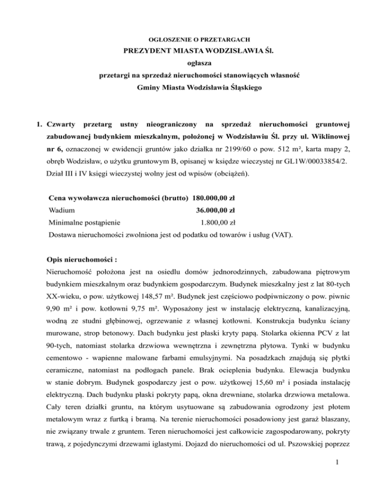 OGŁOSZENIE O PRZETARGACH PREZYDENT MIASTA WODZISŁAWIA Śl. ogłasza przetargi na sprzedaż nieruchomości stanowiących własność Gminy Miasta Wodzisławia Śląskiego 1. Czwarty przetarg ustny nieograniczony na sprzedaż nieruchomości gruntowej zabudowanej budynkiem mieszkalnym, położonej w Wodzisławiu Śl. przy ul. Wiklinowej nr 6, oznaczonej w ewidencji gruntów jako działka nr 2199/60 o pow. 512 m², karta mapy 2, obręb Wodzisław, o użytku gruntowym B, opisanej w księdze wieczystej nr GL1W/00033854/2. Dział III i IV księgi wieczystej wolny jest od wpisów (obciążeń). Cena wywoławcza nieruchomości (brutto) 180.000,00 zł Wadium Minimalne postąpienie 36.000,00 zł 1.800,00 zł Dostawa nieruchomości zwolniona jest od podatku od towarów i usług (VAT). Opis nieruchomości : Nieruchomość położona jest na osiedlu domów jednorodzinnych, zabudowana piętrowym budynkiem mieszkalnym oraz budynkiem gospodarczym. Budynek mieszkalny jest z lat 80-tych XX-wieku, o pow. użytkowej 148,57 m². Budynek jest częściowo podpiwniczony o pow. piwnic 9,90 m² i pow. kotłowni 9,75 m². Wyposażony jest w instalację elektryczną, kanalizacyjną, wodną ze studni głębinowej, ogrzewanie z własnej kotłowni. Konstrukcja budynku ściany murowane, strop betonowy. Dach budynku jest płaski kryty papą. Stolarka okienna PCV z lat 90-tych, natomiast stolarka drzwiowa wewnętrzna i zewnętrzna płytowa. Tynki w budynku cementowo - wapienne malowane farbami emulsyjnymi. Na posadzkach znajdują się płytki ceramiczne, natomiast na podłogach panele. Brak ocieplenia budynku. Elewacja budynku w stanie dobrym. Budynek gospodarczy jest o pow. użytkowej 15,60 m² i posiada instalację elektryczną. Dach budynku płaski pokryty papą, okna drewniane, stolarka drzwiowa metalowa. Cały teren działki gruntu, na którym usytuowane są zabudowania ogrodzony jest płotem metalowym wraz z furtką i bramą. Na terenie nieruchomości posadowiony jest garaż blaszany, nie związany trwale z gruntem. Teren nieruchomości jest całkowicie zagospodarowany, pokryty trawą, z pojedynczymi drzewami iglastymi. Dojazd do nieruchomości od ul. Pszowskiej poprzez 1 drogą osiedlową o nawierzchni asfaltowej. Budynek nie posiada świadectwa charakterystyki energetycznej. Oględzin nieruchomości można dokonywać po uprzednim uzgodnieniu terminu telefonicznie pod nr 32/4590525 lub 32/4590508. Przeznaczenie nieruchomości i sposób zagospodarowania : Dla terenu, na którym położona jest nieruchomość, miasto nie posiada miejscowego planu zagospodarowania przestrzennego miasta Wodzisławia Śl. Zgodnie ze studium uwarunkowań i kierunków zagospodarowania przestrzennego miasta Wodzisławia Śl., zatwierdzonym Uchwałą Rady Miejskiej Wodzisławia Śl., Nr XXIV/232/2012 z dnia 26.09.2012 r., nieruchomość położona jest w terenach o symbolu OZ - obszary zabudowane. Terminy przeprowadzenia poprzednich przetargów ustnych nieograniczonych zakończonych wynikiem negatywnym: - w dniu 27.03.2014 r. pierwszego przetargu, - w dniu 11.07.2014 r. drugiego przetargu, - w dniu 30.09.2014 r. trzeciego przetargu. 2. Pierwszy przetarg ustny nieograniczony na sprzedaż nieruchomości gruntowej niezabudowanej położonej w Wodzisławiu Śl. przy ul. Kokoszyckiej, oznaczonej w ewidencji gruntów jako działka nr 391/18 o pow. 1258 m², karta mapy 4, obręb Jedłownik, o użytku gruntowym RIIIa, opisanej w księdze wieczystej nr GL1W/00005682/0. Dział III i IV księgi wieczystej wolny jest od wpisów (obciążeń). Cena wywoławcza nieruchomości (netto) 86.071,00 zł Wadium 17.214,20 zł Minimalne postąpienie w przetargu 870,00 zł Dostawa gruntu podlega opodatkowaniu podatkiem od towarów i usług (VAT) wg stawki 23%. Przeznaczenie nieruchomości i sposób zagospodarowania : Zgodnie z miejscowym planem zagospodarowania przestrzennego miasta Wodzisławia Śląskiego zatwierdzonym Uchwałą Nr XLIX/449/2014 Rady Miejskiej Wodzisławia Śląski z dnia 26.08.2014 r. w sprawie miejscowego planu zagospodarowania przestrzennego miasta Wodzisławia Śl. ogłoszoną w Dz. Urz. Woj. Śląskiego, poz. 4509 z dnia 05.09.2014 r., 2 nieruchomość położona jest w terenach usług publicznych i komercyjnych o symbolu planu 29 - U1 z przeznaczeniem podstawowym : usługi publiczne i komercyjne, usługi związane z obsługą pojazdów. Opis nieruchomości: Nieruchomość jest niezabudowana położona poza strefą centralną miasta, w bezpośrednim sąsiedztwie terenów niezabudowanych oraz zabudowy jednorodzinnej szeregowej, wielorodzinnej i usługowo - handlowej. Nieruchomość jest kształtu regularnego porośnięta trawą. Położona jest w drugiej linii zabudowy. Dojazd do nieruchomości od strony ulicy Kokoszyckiej, poprzez drogę wewnątrzosiedlową utwardzoną o nawierzchni asfaltowej. Istnieje możliwość podłączenia do sieci wodociągowej, energetycznej, kanalizacyjnej, telekomunikacyjnej i gazowej. 3. Drugi przetarg ustny nieograniczony na sprzedaż nieruchomości gruntowej niezabudowanej położonej w Wodzisławiu Śl. przy ul. Grodzisko, karta mapy 8, obręb Wodzisław opisanej księdze wieczystej nr GL1W/00007340/5, oznaczonej w ewidencji gruntów jako działki : L.p. nr działki Powierzchnia Użytek Cena wywoławcza Wysokość Minimalne gruntowy (netto) wadium postąpienie 1. 2381/61 1168 m² RIVa 80.207,00 zł 16.041,40 zł 810,00 zł 2. 2383/61 1216 m² RIIIb, RIVa 83.503,00, zł 16.700,60 zł 840,00 zł 3. 2384/61 1214 m² RIIIb,RIVa 83.365,00 zł 16.673,00 zł 840,00 zł W dziale III księgi wieczystej wpisane jest ograniczone prawo rzeczowe, które nie obciąża działek, zaś dział IV wolny jest od wpisów (obciążeń). Dostawa gruntu podlega opodatkowaniu podatkiem od towarów i usług według stawki 23%. Przeznaczenie nieruchomości i sposób zagospodarowania: Zgodnie z miejscowym planem zagospodarowania przestrzennego miasta Wodzisławia Śląskiego zatwierdzonym Uchwałą Rady Miejskiej Wodzisławia Śląski