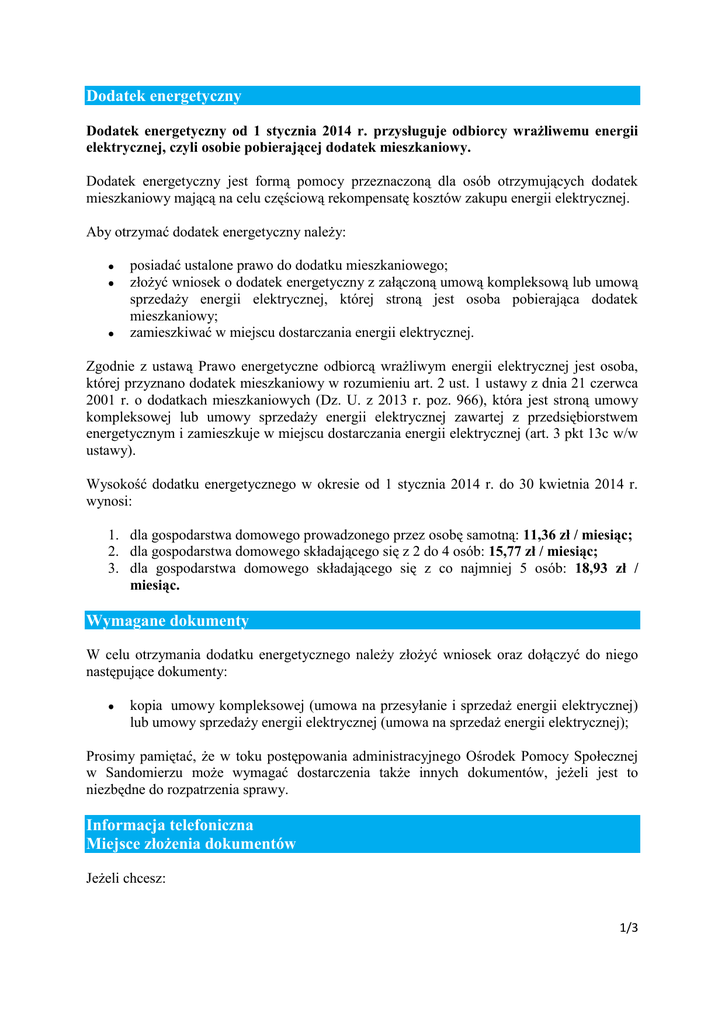 Dodatek energetyczny Dodatek energetyczny od 1 stycznia 2014 r. przysługuje odbiorcy wrażliwemu energii elektrycznej, czyli osobie pobierającej dodatek mieszkaniowy. Dodatek energetyczny jest formą pomocy przeznaczoną dla osób otrzymujących dodatek mieszkaniowy mającą na celu częściową rekompensatę kosztów zakupu energii elektrycznej. Aby otrzymać dodatek energetyczny należy: posiadać ustalone prawo do dodatku mieszkaniowego; złożyć wniosek o dodatek energetyczny z załączoną umową kompleksową lub umową sprzedaży energii elektrycznej, której stroną jest osoba pobierająca dodatek mieszkaniowy; zamieszkiwać w miejscu dostarczania energii elektrycznej. Zgodnie z ustawą Prawo energetyczne odbiorcą wrażliwym energii elektrycznej jest osoba, której przyznano dodatek mieszkaniowy w rozumieniu art. 2 ust. 1 ustawy z dnia 21 czerwca 2001 r. o dodatkach mieszkaniowych (Dz. U. z 2013 r. poz. 966), która jest stroną umowy kompleksowej lub umowy sprzedaży energii elektrycznej zawartej z przedsiębiorstwem energetycznym i zamieszkuje w miejscu dostarczania energii elektrycznej (art. 3 pkt 13c w/w ustawy). Wysokość dodatku energetycznego w okresie od 1 stycznia 2014 r. do 30 kwietnia 2014 r. wynosi: 1. dla gospodarstwa domowego prowadzonego przez osobę samotną: 11,36 zł / miesiąc; 2. dla gospodarstwa domowego składającego się z 2 do 4 osób: 15,77 zł / miesiąc; 3. dla gospodarstwa domowego składającego się z co najmniej 5 osób: 18,93 zł / miesiąc. Wymagane dokumenty W celu otrzymania dodatku energetycznego należy złożyć wniosek oraz dołączyć do niego następujące dokumenty: kopia umowy kompleksowej (umowa na przesyłanie i sprzedaż energii elektrycznej) lub umowy sprzedaży energii elektrycznej (umowa na sprzedaż energii elektrycznej); Prosimy pamiętać, że w toku postępowania administracyjnego Ośrodek Pomocy Społecznej w Sandomierzu może wymagać dostarczenia także innych dokumentów, jeżeli jest to niezbędne do rozpatrzenia sprawy. Informacja telefoniczna Miejsce złożenia dokumentów Jeżeli chcesz: 1/3 otrzymać informację na temat dodatku energetycznego; otrzymać wniosek o przyznanie dodatku energetycznego; złożyć wniosek o przyznanie dodatku energetycznego; zgłoś się do Ośrodka Pomocy Społecznej w Sandomierzu, ul. Żydowska 6c, pokój nr 12 Klienci obsługiwani są godzinach pracy Ośrodka tj: poniedziałek - czwartek piątek: od 7:00 do 15:00 od 8:00 do 16:00 Informacje udzielane są także drogą telefoniczną za pośrednictwem pod numerem telefonu 15 644-55-35 wew. 25. Druki wniosków można pobrać także ze strony internetowej Ośrodka. Termin i sposób załatwienia Postępowanie w sprawie ustalenia prawa do dodatku energetycznego kończy się wydaniem decyzji w terminie miesiąca od daty złożenia kompletu dokumentów. W przypadku konieczności przeprowadzenia szczegółowego postępowania administracyjnego termin załatwienia sprawy może ulec wydłużeniu. Dodatek energetyczny przyznawany jest na okres pobierania dodatku mieszkaniowego. Wypłata świadczeń Dodatek energetyczny wypłaca się do 10 dnia każdego miesiąca na wskazany we wniosku rachunek bankowy lub w kasie banku Spółdzielczego przy ul. Słowackiego 37 „B” z wyjątkiem miesiąca stycznia, w którym dodatek energetyczny wypłaca się do dnia 30 stycznia danego roku. Kiedy świadczenie nie przysługuje Dodatek energetyczny nie przysługuje gdy: osoba wnioskująca nie ma ustalonego prawa do dodatku mieszkaniowego; osoba wnioskująca nie zamieszkuje w miejscu dostarczania energii elektrycznej; osoba wnioskująca nie jest stroną umowy kompleksowej lub umowy sprzedaży energii elektrycznej. Dodatkowe informacje Opłaty Bez dodatkowych opłat zgodnie z Rozporządzeniem Ministra Finansów z dnia 13 lutego 2014r. w sprawie zaniechania poboru opłaty skarbowej (Dz. U. z 2014r. poz. 224). Tryb odwoławczy Od decyzji w sprawie ustalenia prawa do zryczałtowanego dodatku energetycznego przysługuje prawo wniesienia odwołania do Samorządowego Kolegium Odwoławczego 2/3 w Kielcach w terminie 14 dni od daty jej otrzymania. Odwołanie wnosi się za pośrednictwem Dyrektora Ośrodka Pomocy Społecznej w Sandomierzu. Podstawa prawna ustawa z dnia 10 kwietnia 1997 r. – Prawo energetyczne (t.j. Dz. U. z 2012 r. poz. 1059 z późn. zm.) ustawa z dnia 21 czerwca 2001 r. o dodatkach mieszkaniowych (t.j. Dz. U. z 2013 r. poz. 966); ustawa z dnia 14 czerwca 1960 r. – Kodeks postępowania administracyjnego (t.j. Dz. U. z 2013 r. poz. 267). 3/3