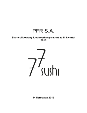 PFR S.A. Skonsolidowany i jednostkowy raport za III kwartał 2016 14 listopada 2016 PREMIUM FOOD RESTAURANTS S.A. SKONSOLIDOWANY I JEDNOSTKOWY RAPORT KWARTALNY ZA OKRES OD 01.01.2016 DO 30.09.2016 SPIS TREŚCI Przyjęte zasady (polityka) rachunkowości .................................................................. 3 Informacje o Grupie Kapitałowej Premium Food Restaurants .................................. 13 Kwartalne skonsolidowane dane finansowe ............................................................. 20 Skonsolidowany bilans .......................................................................................... 21 Skonsolidowany rachunek zysków i strat .............................................................. 22 Skonsolidowane zestawienie zmian w kapitale (funduszu) własnym .................... 23 Skonsolidowane sprawozdanie z przepływów środków pieniężnych .................... 24 Zatrudnienie w Grupie Kapitałowej PFR S.A. ........................................................ 25 Kwartalne jednostkowe dane finansowe ................................................................... 26 Jednostkowy bilans ............................................................................................... 26 Jednostkowy rachunek zysków i strat ................................................................... 27 Jednostkowe zestawienie zmian w kapitale własnym ........................................... 28 Jednostkowe sprawozdanie z przepływów środków pieniężnych ......................... 29 Zatrudnienie w PFR S.A........................................................................................ 30 Komentarz Zarządu Emitenta na temat czynników i zdarzeń mających wpływ na osiągnięte wyniki finansowe oraz stanowisko w zakresie publikowanych szacunków ................................................................................................................ 31 Oświadczenie Zarządu ............................................................................................. 32 2 PREMIUM FOOD RESTAURANTS S.A. SKONSOLIDOWANY I JEDNOSTKOWY RAPORT KWARTALNY ZA OKRES OD 01.01.2016 DO 30.09.2016 Przyjęte zasady (polityka) rachunkowości Metody konsolidacji oraz wyceny udziałów Dane jednostek zależnych konsoliduje się metodą konsolidacji pełnej. Metoda konsolidacji pełnej Przy konsolidacji metodą pełną sumowaniu podlegają, w pełnej wartości, poszczególne pozycje odpowiednich sprawozdań finansowych jednostki dominującej i jednostek zależnych. Po przeprowadzeniu sumowania dokonywane są wyłączenia i inne korekty zgodnie z ustawą. Wyłączeniu podlegają: wyrażona w cenie nabycia wartość udziałów posiadanych przez jednostkę dominującą i inne jednostki objęte konsolidacją w jednostkach zależnych z tą częścią, wycenionych według wartości godziwej aktywów netto jednostek zależnych, która odpowiada udziałowi jednostki dominującej i innych jednostek grupy kapitałowej objętych konsolidacją w jednostkach zależnych, na dzień rozpoczęcia sprawowania nad nimi kontroli; efekt wzajemnych transakcji pomiędzy jednostkami objętymi konsolidacją. Udziały w kapitale własnym jednostek zależnych, należące do osób lub jednostek innych niż objęte konsolidacją, wykazywane są w odrębnej pozycji pasywów skonsolidowanego bilansu, po kapitałach własnych jako kapitały mniejszości. Wartość firmy oraz ujemna wartość firmy Wartość firmy stanowi nadwyżka ceny nabycia udziałów nad odpowiadającą im częścią aktywów netto wycenionych według ich wartości godziwych. Wartość firmy wykazywana jest w aktywach skonsolidowanego bilansu, w odrębnej pozycji aktywów trwałych jako wartość firmy jednostek podporządkowanych. Ujemna wartość firmy stanowi nadwyżkę odpowiedniej części aktywów netto wycenionych według ich wartości godziwych nad ceną nabycia udziałów. Ujemna wartość firmy wykazywana jest w pasywach skonsolidowanego bilansu w odrębnej pozycji jako ujemna wartość firmy jednostek podporządkowanych. 3 PREMIUM FOOD RESTAURANTS S.A. SKONSOLIDOWANY I JEDNOSTKOWY RAPORT KWARTALNY ZA OKRES OD 01.01.2016 DO 30.09.2016 Od wartości firmy dokonuje odpisów amortyzacyjnych w okresie 5 lat natomiast od ujemnej wartości firmy przez okres będący średnią ważoną okresu ekonomicznej użyteczności nabytych i podlegających amortyzacji aktywów. W przypadku kwoty nieistotnej grupa dokonuje jednorazowego odpisu. Odpisy amortyzacyjne dokonywane są metodą liniową. Rzeczowe aktywa trwałe, wartości niematerialne i prawne Środki trwałe oraz wartości niematerialne i prawne wycenia się według cen nabycia lub kosztów wytworzenia, pomniejszonych o odpisy amortyzacyjne lub umorzeniowe, pomniejszonych o odpisy z tytułu trwałej utraty wartości. Cenę nabycia lub koszt wytworzenia środka trwałego powiększają koszty jego ulepszenia. Amortyzacja dokonywana jest metodą liniową. Przy ustalaniu okresu amortyzacji i rocznej stawki amortyzacyjnej uwzględnia się okres ekonomicznej użyteczności środka trwałego oraz składników wartości niematerialnych i prawnych. Poprawność przyjętych okresów oraz stawek amortyzacyjnych podlega okresowej weryfikacji. Grupa kapitałowa stosuje następujące roczne stawki amortyzacyjne dla podstawowych grup środków trwałych: urządzenia techniczne i maszyny 10% - 30% pozostałe środki trwałe 10% - 50% Roczne stawki amortyzacyjne dla wartości niematerialnych i prawnych są następujące: licencje 20% - 50% oprogramowania komputerowe 50% Środki trwałe oraz wartości niematerialne i prawne o niskiej jednostkowej cenie nabycia do 3.500 zł amortyzuje się jednorazowo, nie wcześniej niż w miesiącu przyjęcia ich do użytkowania. Grunty, w tym prawo wieczystego użytkowania gruntu nie są amortyzowane. 4 PREMIUM FOOD RESTAURANTS S.A. SKONSOLIDOWANY I JEDNOSTKOWY RAPORT KWARTALNY ZA OKRES OD 01.01.2016 DO 30.09.2016 Środki trwałe w budowie s