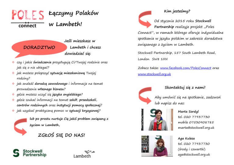 Łączymy Polaków w Lambeth! Kim jesteśmy? Od stycznia 2015 roku Stockwell Partnership realizyje projekt „Poles Connect”, w ramach którego oferuje indywidualne Jeśli mieszkasz w DORADZTWO Lambeth i chcesz dowiedzieć się: czy i jakie świadczenia przysługują Ci/Twojej rodzinie oraz jak się o nie ubiegać? jak możesz polepszyć sytuację mieszkaniową Twojej rodziny? jak znaleźć doradcę zawodowego i informacje na temat prowadzenia własnego biznesu? gdzie możesz uczyć się języka angielskiego? gdzie szukać informacji na temat szkół, przedszkoli, centrów rodzinnych oraz instytucji pomocy społecznej? jak uzyskać praktyczną pomoc w sytuacji kryzysowej? lub po prostu nurtuje Cię jakiś problem związany z życiem w Lambeth, ZGŁOŚ SIĘ DO NAS! spotkania w języku polskim w zakresie doradztwa związanego z życiem w Lambeth. Stockwell Partnership, 157 South Lambeth Road, London SW8 1XN Zobacz także: www.facebook.com/PolesConnect oraz www.stockwell.org.uk Skontaktuj się z nami! Aby umówić się na spotkanie, zadzwoń lub napisz do nas: Marta Sordyl tel. 020 77937730 mobile 07530908785 [email protected] Aga Kulesa tel. 020 77937730 (środy i czwartki) [email protected]