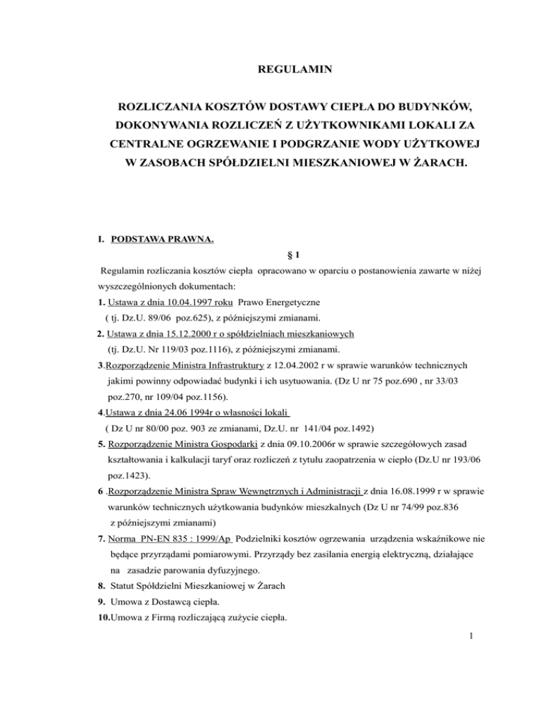REGULAMIN ROZLICZANIA KOSZTÓW DOSTAWY CIEPŁA DO BUDYNKÓW, DOKONYWANIA ROZLICZEŃ Z UŻYTKOWNIKAMI LOKALI ZA CENTRALNE OGRZEWANIE I PODGRZANIE WODY UŻYTKOWEJ W ZASOBACH SPÓŁDZIELNI MIESZKANIOWEJ W ŻARACH. I. PODSTAWA PRAWNA. §1 Regulamin rozliczania kosztów ciepła opracowano w oparciu o postanowienia zawarte w niżej wyszczególnionych dokumentach: 1. Ustawa z dnia 10.04.1997 roku Prawo Energetyczne ( tj. Dz.U. 89/06 poz.625), z późniejszymi zmianami. 2. Ustawa z dnia 15.12.2000 r o spółdzielniach mieszkaniowych (tj. Dz.U. Nr 119/03 poz.1116), z późniejszymi zmianami. 3.Rozporządzenie Ministra Infrastruktury z 12.04.2002 r w sprawie warunków technicznych jakimi powinny odpowiadać budynki i ich usytuowania. (Dz U nr 75 poz.690 , nr 33/03 poz.270, nr 109/04 poz.1156). 4.Ustawa z dnia 24.06 1994r o własności lokali ( Dz U nr 80/00 poz. 903 ze zmianami, Dz.U. nr 141/04 poz.1492) 5. Rozporządzenie Ministra Gospodarki z dnia 09.10.2006r w sprawie szczegółowych zasad kształtowania i kalkulacji taryf oraz rozliczeń z tytułu zaopatrzenia w ciepło (Dz.U nr 193/06 poz.1423). 6 .Rozporządzenie Ministra Spraw Wewnętrznych i Administracji z dnia 16.08.1999 r w sprawie warunków technicznych użytkowania budynków mieszkalnych (Dz U nr 74/99 poz.836 z późniejszymi zmianami) 7. Norma PN-EN 835 : 1999/Ap Podzielniki kosztów ogrzewania urządzenia wskaźnikowe nie będące przyrządami pomiarowymi. Przyrządy bez zasilania energią elektryczną, działające na zasadzie parowania dyfuzyjnego. 8. Statut Spółdzielni Mieszkaniowej w Żarach 9. Umowa z Dostawcą ciepła. 10.Umowa z Firmą rozliczającą zużycie ciepła. 1 §2 II. Wprowadzenie i postanowienia wstępne Dla potrzeb niniejszego regulaminu wprowadza się następująceokreślenia: 1. C.O. - centralne ogrzewanie. 2. C.C.W. - podgrzanie wody wodociągowej (centralna ciepła woda). 3. Użytkownik lokalu – właściciel lokalu, najemca lokalu, członek posiadający spółdzielcze lokatorskie prawo do lokalu lub własnościowe prawo do lokalu lub z wyodrębniona własnością. 4. Lokale opomiarowane w zakresie c.o. - lokale, w których zainstalowano na grzejnikach podzielniki kosztów ogrzewania oraz zawory termostatyczne ( z wyłączeniem łazienki). 5. Lokale opomiarowane w zakresie ccw – lokale do których ilość dostarczonej ciepłej wody określana jest wskazaniami wodomierza lokalowego 6. Lokale nieopomiarowane w zakresie c.o. - lokale, w których nie zainstalowano podzielników oraz zaworów termostatycznych, a także takie, w których stwierdzono chociażby jedno nie sprawne z tych urządzeń oraz lokale w których użytkownik uniemożliwił dostępu osobom upoważnionym do dokonania odczytu wskazań podzielników kosztów . 7.Powierzchnia ogrzewana – powierzchnia wszystkich pomieszczeń znajdujących się w lokalu bez względu na ich przeznaczenie i sposób użytkowania. a) w przypadku lokali mieszkalnych do pomieszczeń znajdujących się w lokalu należą: pokoje, kuchnia, przedpokój, łazienka, ubikacja. Do powierzchni zalicza się również meble wbudowane a nie wlicza się powierzchni balkonów, loggii, pralni, suszarni i piwnic. b) w przypadku lokali użytkowych – wszystkie pomieszczenia wyszczególnione w umowie najmu lub innej. 8. Układ pomiarowo-rozliczeniowy – zespól urządzeń służących do pomiaru ilości i parametrów nośnika energii cieplnej, których odczyty stanowią podstawę do określenia zużycia energii cieplnej. 9. Sezon grzewczy – okres , w którym warunki atmosferyczne powodują konieczność ciągłego dostarczania ciepła w celu ogrzewania obiektu. 10. Opłata stała – opłata za zamówiona moc cieplną i usługi przesyłowe, stanowi iloczyn mocy cieplnej zamówionej przez odbiorcę i ceny jednostkowej za zamówioną moc cieplną dla danej grupy odbiorców i jest pobierana w 12-tu ratach miesięcznych. 11. Opłata zmienna - opłata za dostarczoną energię cieplną ustaloną na podstawie odczytów wskazań układu pomiarowo-rozliczeniowego i ceny jednostkowej energii cieplnej dla danej grupy odbiorców – jest pobierana za każdy miesiąc, na potrzeby c.o. i c.c.w. w formie przedpłaty płaconej przez 12 m-cy danego roku. 12. Jednostka rozliczeniowa – budynek lub kilka budynków zasilanych z węzła cieplnego, wyposażonego w układ pomiarowo-rozliczeniowy. 13. Okres rozliczeniowy - przyjęty przez zarządzającego czasookres obejmujący 12 kolejnych miesięcy po zakończeniu którego następuje rozliczenie kosztów c.o zgodnie 2 z wniesionymi przedpłatami przez odbiorcę w trakcie okresu rozliczeniowego, a c.c.w. po zakończeniu kolejnego kwartału. 14. Taryfa dla ciepła - zbiór cen i stawek opłat oraz warunków ich stosowania opracowany przez Sprzedawcę energii cieplnej, zatwierdzonych przez Urząd Regulacji Energetyki. 15. Koszty dostarczonego ciepła – całkowite koszty dostarczonego ciepła, które rozliczane są z dostawcą na podstawie zawartej umowy. Ustala się je w oparciu: - moc zamówioną, - faktyczny pobór ciepła wg wskazań urządzeń pomiarowych – opłata za ciepło, - za usługi przesyłowe, - obowiązująca taryfę ciepła dla danej grupy odbiorców. 16. Opłata stała – stanowiąca iloczyn zamówionej mocy cieplnej na które składają się: - opłata za zamówioną moc cieplną, - opłata przesyłowa – składnik stały za zamówiona moc cieplną. 17. Koszty zmienne – na które składają się opłaty: - opłata za dostarczone ciepło wg liczników zamontowanych w węzłach cieplnych, - opłata przesyłowa – składnik zmienny wg wskazań urządzeń pomiarowych zamontowanych w węzłach cieplnych. 18. Jednostkowa opłata ryczałtowa - jednostkowa opłata w zł/m² stosowana do rozliczenia lokali nieopomiarowanych. 19. Współczynnik wyrównawczy – współczynnik korygujący jednostki zarejestrowane przez podzielniki uwzględniający niekorzystne położenie lokalu w bryle budynku. 20.Firma rozliczająca – Specjalistyczna 