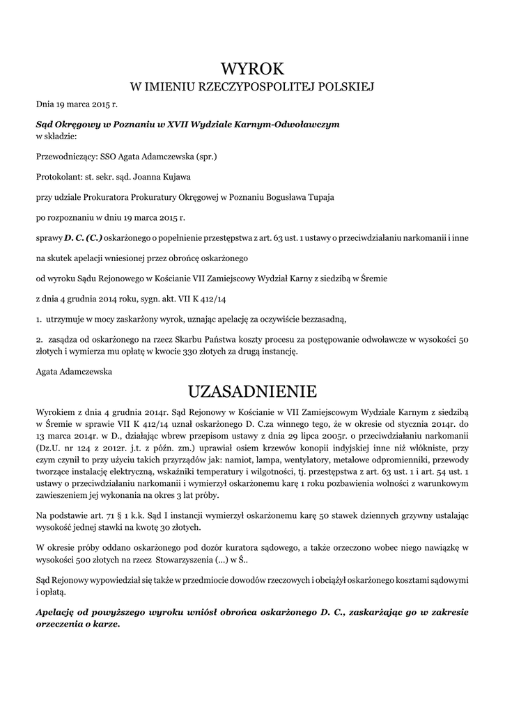 WYROK W IMIENIU RZECZYPOSPOLITEJ POLSKIEJ Dnia 19 marca 2015 r. Sąd Okręgowy w Poznaniu w XVII Wydziale Karnym-Odwoławczym w składzie: Przewodniczący: SSO Agata Adamczewska (spr.) Protokolant: st. sekr. sąd. Joanna Kujawa przy udziale Prokuratora Prokuratury Okręgowej w Poznaniu Bogusława Tupaja po rozpoznaniu w dniu 19 marca 2015 r. sprawy D. C. (C.) oskarżonego o popełnienie przestępstwa z art. 63 ust. 1 ustawy o przeciwdziałaniu narkomanii i inne na skutek apelacji wniesionej przez obrońcę oskarżonego od wyroku Sądu Rejonowego w Kościanie VII Zamiejscowy Wydział Karny z siedzibą w Śremie z dnia 4 grudnia 2014 roku, sygn. akt. VII K 412/14 1. utrzymuje w mocy zaskarżony wyrok, uznając apelację za oczywiście bezzasadną, 2. zasądza od oskarżonego na rzecz Skarbu Państwa koszty procesu za postępowanie odwoławcze w wysokości 50 złotych i wymierza mu opłatę w kwocie 330 złotych za drugą instancję. Agata Adamczewska UZASADNIENIE Wyrokiem z dnia 4 grudnia 2014r. Sąd Rejonowy w Kościanie w VII Zamiejscowym Wydziale Karnym z siedzibą w Śremie w sprawie VII K 412/14 uznał oskarżonego D. C.za winnego tego, że w okresie od stycznia 2014r. do 13 marca 2014r. w D., działając wbrew przepisom ustawy z dnia 29 lipca 2005r. o przeciwdziałaniu narkomanii (Dz.U. nr 124 z 2012r. j.t. z późn. zm.) uprawiał osiem krzewów konopii indyjskiej inne niż włókniste, przy czym czynił to przy użyciu takich przyrządów jak: namiot, lampa, wentylatory, metalowe odpromienniki, przewody tworzące instalację elektryczną, wskaźniki temperatury i wilgotności, tj. przestępstwa z art. 63 ust. 1 i art. 54 ust. 1 ustawy o przeciwdziałaniu narkomanii i wymierzył oskarżonemu karę 1 roku pozbawienia wolności z warunkowym zawieszeniem jej wykonania na okres 3 lat próby. Na podstawie art. 71 § 1 k.k. Sąd I instancji wymierzył oskarżonemu karę 50 stawek dziennych grzywny ustalając wysokość jednej stawki na kwotę 30 złotych. W okresie próby oddano oskarżonego pod dozór kuratora sądowego, a także orzeczono wobec niego nawiązkę w wysokości 500 złotych na rzecz Stowarzyszenia (...) w Ś.. Sąd Rejonowy wypowiedział się także w przedmiocie dowodów rzeczowych i obciążył oskarżonego kosztami sądowymi i opłatą. Apelację od powyższego wyroku wniósł obrońca oskarżonego D. C., zaskarżając go w zakresie orzeczenia o karze. Apelujący zarzucił rozstrzygnięciu: 1. rażącą niewspółmierność kary, poprzez wymierzenie kary łącznej 1 roku pozbawienia wolności z warunkowym zawieszeniem jej wykonania na okres próby trzech lat, która to kara nie jest adekwatna do stopnia winy oskarżonego i nie uwzględnia szczególnych okoliczności związanych z popełnieniem przez D. C. zarzucanych mu czynów, 2. naruszenie przepisów prawa materialnego poprzez pominięcie dyrektyw płynących z art. 53 § 1 i 2 k.k. Podnosząc powyższe zarzuty skarżący wniósł o zmianę zaskarżonego wyroku w zakresie wymierzonej oskarżonemu kary i orzeczenie wobec D. C. kary rodzajowo łagodniejszej. Sąd Okręgowy zważył, co następuje. Apelacja obrońcy oskarżonego okazała się bezzasadna i to w stopniu oczywistym. Apelacja oczywiście bezzasadna, o której mowa w art. 457 § 2 k.p.k., to taka apelacja, co do której w sposób oczywisty brak jest wątpliwości co do tego, że w sprawie nie wystąpiły uchybienia określone w art. 438 k.p.k. oraz art. 439 k.p.k., a ponadto nie zachodzi przesłanka z art. 440 k.p.k., a żadne z uchybień, które zostały podniesione w środku odwoławczym nie jest trafne. W pierwszej kolejności Sąd Okręgowy podnosi, że nie ma zastrzeżeń odnośnie pełności materiału dowodowego, który został w sprawie zgromadzony. W tej mierze nie można Sądowi I instancji poczynić żadnych zarzutów, albowiem przeprowadzając postępowanie dowodowe dążył on ze wszech miar do wykorzystania wszystkich źródeł dowodowych mogących rzutować na odpowiedzialność karną oskarżonego D. C.. Sąd Rejonowy w sposób staranny rozważył dowody i okoliczności ujawnione w toku przewodu sądowego i na ich podstawie dokonał prawidłowych ustaleń faktycznych, przy czym zaznaczenia wymaga, że stan faktyczny w niniejszej sprawie nie był nader skomplikowany. W obliczu zebranych i należycie ocenionych dowodów Sąd Rejonowy słusznie wykazał winę oskarżonego, a swoje stanowisko w sposób szczegółowy i przekonywujący umotywował w pisemnym uzasadnieniu. Przechodząc do analizy zaskarżonej części wyroku, tj. orzeczenia o karze, Sąd Odwoławczy pragnie przypomnieć, że dyrektywy wymiaru kary zostały sformułowane w art. 53 k.k., zgodnie z którymi sąd wymierza karę według swojego uznania, w granicach przewidzianych przez ustawę, bacząc by jej dolegliwość nie przekraczała stopnia winy, uwzględniając stopień społecznej szkodliwości czynu oraz biorąc pod uwagę cele zapobiegawcze i wychowawcze, które ma osiągnąć w stosunku do skazanego, a także potrzeby w zakresie kształtowania świadomości prawnej społeczeństwa. Wymierzając karę sąd uwzględnia w szczególności motywację i sposób zachowania się sprawcy, rodzaj i stopień naruszenia ciążących na sprawcy obowiązków, rodzaj i rozmiar ujemnych następstw przestępstwa, właściwości i warunki osobiste sprawcy, sposób życia przed popełnieniem przestępstwa i zachowanie się po jego popełnieniu, a zwłaszcza starania o naprawienie szkody lub zadośćuczynienie w innej formie społecznemu poczuciu sprawiedliwości. Zgodnie ze stanowiskiem Sądu Najwyższego rażąca niewspółmierność wymierzonej oskarżonemu kary w rozumieniu art. 438 pkt 4 k.p.k. zachodzi wtedy, gdy suma zastosowanych kar i środków karnych orzeczonych za przypisane oskarżonemu przestępstwo nie uwzględnia należycie stopnia społecznego niebezpieczeństwa tego czynu (obecne określenie ustawowe odnosi się do szkodliwości społecznej czynu sprawcy) oraz nie realizuje w w