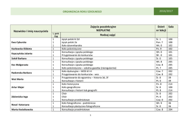 ORGANIZACJA ROKU SZKOLNEGO Nazwisko i imię nauczyciela Ewa Cyburska Kozłowska Elżbieta Kopczyńska Jolanta Sokół Barbara Koc Małgorzata Radomska Barbara Woś Marta Artur Majer Zdzienicka Inga Nosal Katarzyna Marta Kwiatkowska Zajęcia pozalekcyjne NIEPŁATNE L. godz /tyg 1 1 1 1 1 1 1 1 1 1 1 1 1 1 1 1 1 1 1 1 1 1 1 2016/2017 Dzień Sala nr lekcji Rodzaj zajęć Język polski kl 2d Język polski 2e Koło dziennikarskie Koło polonistyczne Konsultacje z języka polskiego Przygotowanie do konkursów Konsultacje z języka polskiego Konsultacje z języka polskiego Konsultacje z języka polskiego Koło polonistyczne – szkolna gazetka (nieregularnie) Koło dyskusyjne – WOS kl I-II Przygotowanie do konkursów - wos Przygotowanie do egzaminu – historia 3d, 3f Konsultacje z historii Koło historyczne Koło geograficzne Konsultacje z historii lub geografii Chór Chór Konsultacje przedmiotowe Koło fotograficzne - podróżnicze Konsultacje plastyczno-fotograficzne Konsultacje przedmiotowe 1 Śr. 1 Pon. 7 Wt. 0 Pn. 9 Wt. 0 ŚR . 0 Śr. 0 Wt. 8 Czw. 8 Pt. 7 Czw. 7 Czw. 8 Śr. 8 Pt. 0 Pn. 8 Śr. 8 Pt. 8 Śr. 8 Pt. 0 Czw. 0 Wt. 9 Śr. 0 Czw. 8 108 108 102 102 101 101 105 205 205 205 202 202 39 39 214 108 214 202 202 202 36 36 204 ORGANIZACJA ROKU SZKOLNEGO D.Hartleb-Wroczyńska Skrzypczak Irena Koniarz Emilia Kłyszejko Ewa Padlewska-Pasnikowska Maria Pietrzak-Majewska Beata Konstanciuk Agnieszka Banaszkiewicz Daniela Berezińska Anna Beata Kowalska Stańczewski Jarosław Dudziuk-Bańka Aneta 2016/2017 0,5 0,5 1 1 1 1 0,5 0,5 0,5 0,5 0,5 0,5 1 0,5 1 1 1 1 1 1 1 1 1 Przygotowanie do egzaminu 3a (co drugi tydz.) Przygotowanie do egzaminu/konkursów 3c/f (co drugi tydz.) Zajęcia wyrównawcze/konsultacje Przygotowanie do egzaminu 3a Przygotowanie do egzaminu 3c/f Zajęcia wyrównawcze z j. angielskiego Przygotowanie do egzaminu 3c/f (co drugi tydz.) Przygotowanie do egzaminu 3d (co drugi tydz.) Przygotowanie do egzaminu 3e (co drugi tydz.) Przygotowanie do egzaminu 3c/f (co drugi tydz.) Przygotowanie do egzaminu 3 d (co drugi tydz.) Przygotowanie do egzaminu 3 b (co drugi tydz.) Przygotowanie do egzaminu 3e Przygotowanie do egzaminu 3b (co drugi tydz.) Konsultacje z j. francuskiego Koło j. francuskiego Przygotowanie do egzaminu DELF Konsultacje z j. francuskiego Koło j. hiszpańskiego Konsultacje z j. hiszpańskiego Przygotowanie do konkursów/egzaminu z j. niemieckiego Konsultacje z j. niemieckiego Konsultacje z j. niemieckiego (każdy pierwszy wtorek m-ca) Pt. 8 Pt. 8 Pn. 8 Pt. 0 Czw. 0 Śr. 0 Pt. 8 Czw.8 Czw. 7 Pn. 8 Pn. 7 Pt. 8 Śr. 0 Pn. 8 Czw. 0 Śr. 0 Śr. 7 Śr. 8 Pn. 8 Wt. 0 Wt. 0 Pn. 0 Wt. 7 209 209 209 18 18 18 3 31 31 213a 213a 213a 207 207 24 24 31 31 30 30 19 19 31 1 1 1 1 1 Koło chemiczne CSI Koło chemiczne Konsultacje przedmiotowe Innowacja z matematyki 2e Koło matematyczne 3e (dodatkowa matematyka) Śr. 0 Pn. 0 Wt. 0 Pt. 1 Pn. 1 210 104 104 213 213 2 ORGANIZACJA ROKU SZKOLNEGO Pawlik Halina Dzbanuszkiewicz Anna Grzegorz Marciniak Brzóska Barbara Koszewska Karolina Omiecińska Beata Bieszyńska Anna Ciąćka Tomasz Wójcik Mariusz 1 1 1 1 1 1 1 1 1 0,5 1 1 1 1 1 1 1 1 2 Konsultacje przedmiotowe Konsultacje przedmiotowe Koło olimpijczyka Konsultacje przedmiotowe Koło matematyczne 2c Zajęcia wyrównawcze z fizyki Koło fizyczne Konsultacje przedmiotowe Koło chemiczne Koło chemiczne CSI (co drugi tydz.) Konsultacje przedmiotowe Koło gier planszowych (co drugi tydz.) Przygotowanie do egzaminu a-f Konsultacje przedmiotowe Wolontariat (nieregularnie – według potrzeb) Konsultacje przedmiotowe Koło komputerowe Konsultacje SKS/konsultacje 2 1 1 1 1 SKS (0d 28.11.16 do 31.01.17; od 29.05 do 23.06.17) SKS (0d 28.11.16 do 31.01.17; od 29.05 do 23.06.17) SKS Radiowęzeł ( dodatkowe spotkania w śr. i pt. po 5-ej lekcji) Radiowęzeł( dodatkowe spotkania w śr. i pt. po 5-ej lekcji) Wt. 0 Pt. 0 Czw. 8 Pon. 8-9 27.11.16 do 31.03.17 Śr. 8-9 Wt. 9-11 Czw. 7 Czw. 0 Czw. 0 1 Wolontariat Czw. 8 Kotecki Jacek Klaudia Jagusiak Kucharski Marek Kucharski Maciek Budkiewicz-Kowalska Justyna Garbarczyk - Nockowska Małgorzata Michał Stanikowski 2016/2017 3 Pn. 0 Czw. 0 Śr. 8 Wt. 0 Pt. 0 Wt. 0 Pn. 8 Pt. 7 Śr. 8 Czw. 8 Pn. 0 Czw.9-10 Pn. 0 Wt. 0 201 201 104 104 213 111 111 111 210 210 210 210 204 214 214 40 30 30 23 23 33 ORGANIZACJA ROKU SZKOLNEGO Kowalewska Elżbieta Jaksa Katarzyna Adamowska Alicja Słapczyńska Krystyna Fronczak Adrianna Posudziejewska Hanna Kondaszewski Bogusław 1 1 2 2 1 1 1 1 1 Koło biblijne Koło papieskie „Miłosierni i odważni” Porady bibliograficzne Porady bibliograficzne Trening ortograficzny Trening ortograficzny Trening ortograficzny Trening kreatywności EDB - strzelnica 4 2016/2017 Czw. 0 Pn. 0 Wt. Śr. 8 Pn.Czw.8 Śr. 7 Czw. 7 Wt. 8 Śr. 8 Śr. 8 33 33 115 114 24 104 39 31