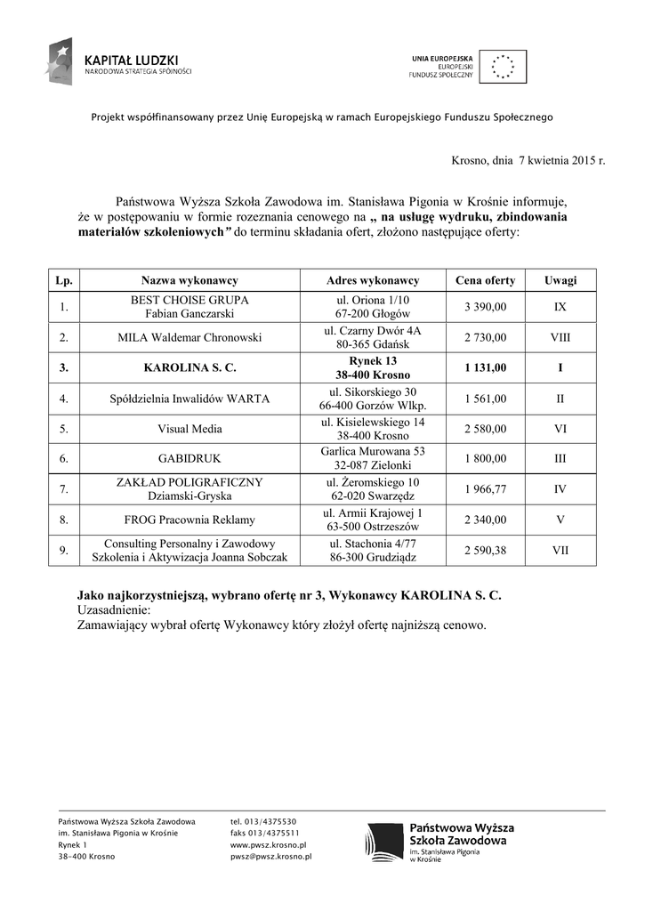 Projekt współfinansowany przez Unię Europejską w ramach Europejskiego Funduszu Społecznego Krosno, dnia 7 kwietnia 2015 r. Państwowa Wyższa Szkoła Zawodowa im. Stanisława Pigonia w Krośnie informuje, że w postępowaniu w formie rozeznania cenowego na ,, na usługę wydruku, zbindowania materiałów szkoleniowych” do terminu składania ofert, złożono następujące oferty: Lp. Nazwa wykonawcy Adres wykonawcy 1. BEST CHOISE GRUPA Fabian Ganczarski 2. MILA Waldemar Chronowski 3. KAROLINA S. C. 4. Spółdzielnia Inwalidów WARTA 5. Visual Media 6. GABIDRUK 7. ZAKŁAD POLIGRAFICZNY Dziamski-Gryska 8. FROG Pracownia Reklamy 9. Consulting Personalny i Zawodowy Szkolenia i Aktywizacja Joanna Sobczak ul. Oriona 1/10 67-200 Głogów ul. Czarny Dwór 4A 80-365 Gdańsk Rynek 13 38-400 Krosno ul. Sikorskiego 30 66-400 Gorzów Wlkp. ul. Kisielewskiego 14 38-400 Krosno Garlica Murowana 53 32-087 Zielonki ul. Żeromskiego 10 62-020 Swarzędz ul. Armii Krajowej 1 63-500 Ostrzeszów ul. Stachonia 4/77 86-300 Grudziądz Cena oferty Uwagi 3 390,00 IX 2 730,00 VIII 1 131,00 I 1 561,00 II 2 580,00 VI 1 800,00 III 1 966,77 IV 2 340,00 V 2 590,38 VII Jako najkorzystniejszą, wybrano ofertę nr 3, Wykonawcy KAROLINA S. C. Uzasadnienie: Zamawiający wybrał ofertę Wykonawcy który złożył ofertę najniższą cenowo. Państwowa Wyższa Szkoła Zawodowa tel. 013/4375530 im. Stanisława Pigonia w Krośnie faks 013/4375511 Rynek 1 www.pwsz.krosno.pl 38-400 Krosno [email protected]
