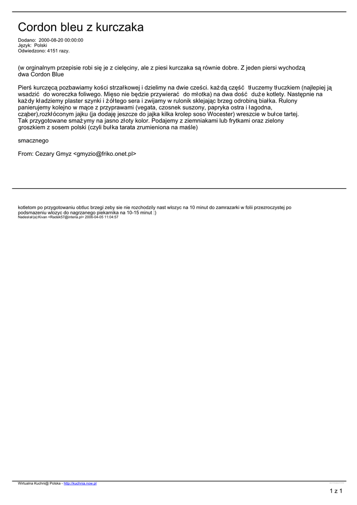 Cordon bleu z kurczaka Dodano: 2000-08-20 00:00:00 Język: Polski Odwiedzono: 4151 razy. (w orginalnym przepisie robi się je z cielęciny, ale z piesi kurczaka są równie dobre. Z jeden piersi wychodzą dwa Cordon Blue Pierś kurczęcą pozbawiamy kości strzałkowej i dzielimy na dwie cześci. każdą część tłuczemy tłuczkiem (najlepiej ją wsadzić do woreczka foliwego. Mięso nie będzie przywierać do młotka) na dwa dość duże kotlety. Następnie na każdy kładziemy plaster szynki i żółtego sera i zwijamy w rulonik sklejając brzeg odrobiną białka. Rulony panierujemy kolejno w mące z przyprawami (vegata, czosnek suszony, papryka ostra i łagodna, cząber),rozkłóconym jajku (ja dodaję jeszcze do jajka kilka krolep soso Wocester) wreszcie w bułce tartej. Tak przygotowane smażymy na jasno złoty kolor. Podajemy z ziemniakami lub frytkami oraz zielony groszkiem z sosem polski (czyli bułka tarata zrumieniona na maśle) smacznego From: Cezary Gmyz <[email protected]> kotletom po przygotowaniu obtluc brzegi zeby sie nie rozchodzily nast wlozyc na 10 minut do zamrazarki w folii przezroczystej po podsmazeniu wlozyc do nagrzanego piekarnika na 10-15 minut :) Nadesłał(a):Kivan <[email protected]> 2006-04-05 11:04:57 Wirtualna Kuchni@ Polska - http://kuchnia.now.pl przepis nr 1201, plik wygenerowano 2017.03.08 18:33 1z1