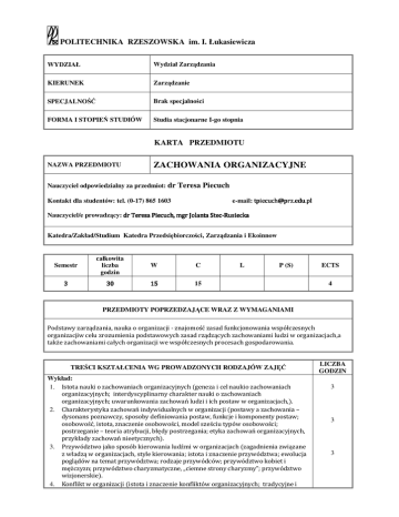POLITECHNIKA RZESZOWSKA im. I. Łukasiewicza WYDZIAŁ Wydział Zarządzania KIERUNEK Zarządzanie SPECJALNOŚĆ Brak specjalności FORMA I STOPIEŃ STUDIÓW Studia stacjonarne I-go stopnia KARTA PRZEDMIOTU NAZWA PRZEDMIOTU ZACHOWANIA ORGANIZACYJNE Nauczyciel odpowiedzialny za przedmiot: dr Teresa Piecuch Kontakt dla studentów: tel. (0-17) 865 1603 e-mail: [email protected] Nauczyciel/e prowadzący: dr Teresa Piecuch, mgr Jolanta StecStec-Rusiecka Katedra/Zakład/Studium Katedra Przedsiębiorczości, Zarządzania i Ekoinnow Semestr całkowita liczba godzin W C 3 30 15 15 L P (S) ECTS 4 PRZEDMIOTY POPRZEDZAJĄCE WRAZ Z WYMAGANIAMI Podstawy zarządzania, nauka o organizacji - znajomość zasad funkcjonowania współczesnych organizacjiw celu zrozumienia podstawowych zasad rządzących zachowaniami ludzi w organizacjach,a także zachowaniami całych organizacji we współczesnych procesach gospodarowania. TREŚCI KSZTAŁCENIA WG PROWADZONYCH RODZAJÓW ZAJĘĆ Wykład: 1. Istota nauki o zachowaniach organizacyjnych (geneza i cel naukio zachowaniach organizacyjnych; interdyscyplinarny charakter nauki o zachowaniach organizacyjnych; uwarunkowania zachowań ludzi i ich postaw w organizacjach,). 2. Charakterystyka zachowań indywidualnych w organizacji (postawy a zachowania – dysonans poznawczy, sposoby definiowania postaw, funkcje i komponenty postaw; osobowość, istota, znaczenie osobowości, model sześciu typów osobowości; postrzeganie – teoria atrybucji, błędy postrzegania; etyka zachowań organizacyjnych, przykłady zachowań nieetycznych). 3. Przywództwo jako sposób kierowania ludźmi w organizacjach (zagadnienia związane z władzą w organizacjach, style kierowania; istota i znaczenie przywództwa; ewolucja poglądów na temat przywództwa; rodzaje przywódców; przywództwo kobiet i mężczyzn; przywództwo charyzmatyczne, „ciemne strony charyzmy”; przywództwo wizjonerskie). 4. Konflikt w organizacji (istota i znaczenie konfliktów organizacyjnych; tradycyjne i LICZBA GODZIN 3 3 3 współczesne podejście do konfliktów; główne źródła konfliktóww organizacjach; rodzaje konfliktów; negocjacje jako jeden ze sposobów rozwiązywania konfliktów w organizacjach). 5. Kultura organizacyjna (istota, geneza, funkcje i znaczenie kultury organizacyjnej; elementy kultury organizacyjnej; uwarunkowania kultury organizacyjnej; wpływ kultury organizacyjnej na zachowania się ludzi w organizacjach). 6. Istota zachowań międzyorganizacyjnych (charakterystyka najważniejszych typów relacji między organizacjami oraz relacji organizacji z otoczeniem; nowoczesne koncepcje współdziałania organizacji; wpływ globalizacji i regionalizacjina stosunki między organizacjami; reakcje strategiczne organizacji na otoczenie). Ćwiczenia: 1. Zajęcia organizacyjne. 2. Geneza, przedmiot, cele nauki o zachowaniach organizacyjnych. Przedmiot nauki o zachowaniach organizacyjnych a przedmiot organizacji i zarządzania (model góry). Postawy a zachowania – dysonans poznawczy; istota postaw i zachowań 3. Przedsiębiorcze postawy, przedsiębiorcze zachowania, przedsiębiorczy proces. 4. Zagadnienia związane ze stresem. Stres i wypalenie zawodowe, a zachowania ludziw pracy. 5. Inteligencja emocjonalna i jej znaczenie w kreowaniu zachowań ludzi. 6. Charakterystyka zachowań grupowych w organizacji (istota i znaczenie grup, rodzaje grup i zespołów, przyczyny łączenia się ludzi w grupy, efekt synergii a efekt grupy). 7. Wpływ różnic kulturowych na zachowania ludzi w organizacjach. 8. Etyka zachowań organizacyjnych. 9. Kolokwium zaliczeniowe. Laboratoria: 1. Projekty: 1. Łącznie liczba godzin: 3 2 2 0,5 2 2 2,5 2 2 2 1 1 15/15 DyŜury dydaktyczne (konsultacje): w terminach podanych w harmonogramie pracy jednostki EFEKTY KSZTAŁCENIA - UMIEJĘTNOŚCI KSZTAŁCENIA Znajomość róŜnorodnych aspektów mających wpływ na zachowania ludzi w organizacjach, a przede wszystkim opanowanie wiedzy z zakresu uwarunkowań indywidualnych i grupowych oraz ich wpływu na zachowania poszczególnych osób i efektywność całej organizacji. FORMA I WARUNKI ZALICZENIA PRZEDMIOTU (RODZAJU ZAJĘĆ) Zaliczenie w formie pisemnej. Obowiązują zagadnienia prezentowane na wykładach i zajęciach ćwiczeniowych. Dla najlepszych studentów przewidziane są zwolnienia z zaliczenia końcowego na podstawie kolokwium zaliczeniowego (ew. dwóch kolokwium lub kartkówek pisanych na kaŜdych zajęciach - opcja do wyboru dla studentów), ocen z przygotowywanych przez studentów prezentacji, efektów ćwiczeń (studiów przypadków) rozwiązywanych przez studentów na zajęciach ćwiczeniowych, aktywności oraz zachowaniu na wykładzie. WYKAZ LITERATURY PODSTAWOWEJ 1. 2. 3. 4. 5. Galata S., Zachowania się ludzi w procesach zaspołowych: uwarunkowania, problemy, dylematy, Wyd. Difin, Warszawa 2008. Kożusznik B., Zachowania człowieka w organizacji, PWE, Warszawa, 2007. Kuc B. R., Moczydłowska J. M., Zachowania organizacyjne. Podręcznik akademicki, Wyd. Difin, Warszawa 2009. Robbins S. P., Zasady zachowania w organizacji, PWE, Warszawa 2004. Zachowania organizacyjne. Wybrane zagadnienia, pod red. A. Potockiego, Wyd. Difin, Warszawa 2005. WYKAZ LITERATURY UZUPEŁNIAJĄCEJ 1. 2. 3. 4. 5. Bugdol M., Gry i zachowania nieetyczne w organizacjach, Wyd. Difin, Warszawa 2007. Majecka B., Zachowania organizacyjne przedsiębiorstw, Wyd. Uniwersytetu Gdańskiego, Gdańsk 2002. Prace z zakresu zachowań organizacyjnych, Zeszyty Naukowe AE w Krakowie, nr 626, Kraków 2003. Radecki E. W., Zachowania organizacyjne. Pytania i odpowiedzi, Wyd. WyŜszej Szkoły Integracji Europejskiej w Szczecinie, Szczecin 2010. Tyrała P., Zachowania organizacyjne w procesach zarządzania. Współzależność czynników osobowościowych i prakseologicznych, Wyd. Adam Marszałek, Toruń 2003. Podpis nauczyciela odpowiedzialnego za przedmiot Podpis kierownika (zakładu/studium) katedry Data i podpis dziekana właściwego wydziału