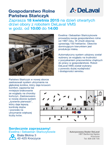 Gospodarstwo Rolne Państwa Stańczyk Zaprasza 18 kwietnia 2015 na dzień otwartych drzwi obory z robotem DeLaval VMS w godz. od 10:00 do 14:00 Ewelina i Sebastian Stańczykowie prowadzą swoje gospodarstwo rolne od 1997 roku. W chwili obecnej uprawiają 150 hektarów. Obecnie dominującym kierunkiem jest produkcja mleka. Automatyczny system udojowy został wybrany ze względu na trudności z pozyskaniem pracowników chętnych do pracy w gospodarstwie. Robot DeLaval VMS został wybrany z powodu dużej wydajności i dostępności serwisu. Państwo Stańczyk w nowej oborze zastosowali system utrzymania na głębokiej ściółce, który daje krowom komfort, zapewnia też mniejsze brakowanie ze względu na choroby kończyn. Zastosowano w nowej oborze system „żywienie pierwsze”, który daje lepszą kontrolę dojów i pozwala na utrzymanie większej liczby krów. Serdecznie zapraszamy! Ewelina i Sebastian Stańczykowie Biała Błotna 3 42-425 Kroczyce Autoryzowany Dealer DeLaval HBT Bartłomiej Nędza Kroczyce Tel. 609 236 105