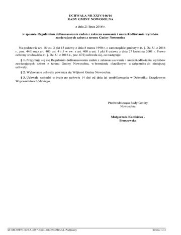 UCHWAŁA NR XXIV/146/16 RADY GMINY NOWOSOLNA z dnia 21 lipca 2016 r. w sprawie Regulaminu dofinansowania zadań z zakresu usuwania i unieszkodliwiania wyrobów zawierających azbest z terenu Gminy Nowosolna Na podstawie art. 18 ust. 2 pkt 15 ustawy z dnia 8 marca 1990 r. o samorządzie gminnym (t. j. Dz. U. z 2016 r., poz. 446) oraz art. 403 ust. 4 i 5 w zw. z art. 400 a ust. 1 pkt 8 ustawy z dnia 27 kwietnia 2001 r. Prawo ochrony środowiska (t. j. Dz. U. z 2016 r., poz. 672) uchwala się, co następuje: § 1. Przyjmuje się się Regulamin dofinansowania zadań z zakresu usuwania i unieszkodliwiania wyrobów zawierających azbest z terenu Gminy Nowosolna, w brzmieniu określonym w załączniku do niniejszej uchwały. § 2. Wykonanie uchwały powierza się Wójtowi Gminy Nowosolna. § 3. Uchwała wchodzi w życie po upływie 14 dni od dnia jej opublikowania w Dzienniku Urzędowym Województwa Łódzkiego. Przewodnicząca Rady Gminy Nowosolna Małgorzata Kamińska Bruszewska Id: 6BC03FF3-8CBA-4257-B623-396D5045BAA4. Podpisany Strona 1 z 4 Załącznik Nr 1 do Uchwały Nr XXIV/146/16 Rady Gminy Nowosolna z dnia 21 lipca 2016 r. Regulamin dofinansowania kosztów usuwania i unieszkodliwiania wyrobów zawierających azbest z terenu Gminy Nowosolna § 1. 1. Określa się zasady przyznawania dotacji celowej w ramach realizacji zadania polegającego na usunięciu i unieszkodliwieniu wyrobów zawierających azbest z terenu Gminy Nowosolna. 2. Udzielenie dotacji celowej ma na celu realizację założeń ujętych w „Programie usuwania wyrobów zawierających azbest z terenu Gminy Nowosolna na lata 2015 - 2020". § 2. 1. Dofinansowaniu podlegają koszty realizacji przedsięwzięć polegających na: 1) demontażu wyrobów zawierających azbest; 2) przygotowaniu do transportu i transporcie wyrobów zawierających azbest do miejsca unieszkodliwienia; 3) unieszkodliwieniu poprzez składowanie wyrobów zawierających azbest na składowisku odpadów niebezpiecznych. 2. Źródłem finansowania przedsięwzięć, wskazanych w ust. 1 będą środki własne, pochodzące z budżetu Gminy Nowosolna oraz środki pozyskane z Wojewódzkiego Funduszu Ochrony Środowiska i Gospodarki Wodnej w Łodzi. 3. Kwota przeznaczona na finansowanie zadań z zakresu usuwania i unieszkodliwiania wyrobów zawierających azbest określona będzie na każdy rok w budżecie Gminy Nowosolna. § 3. Wykonawcą zadań obejmujących usuwanie i unieszkodliwianie wyrobów zawierających azbest na terenie Gminy Nowosolna będzie podmiot wyłoniony z zastosowaniem przepisów ustawy Prawo zamówień publicznych oraz innych przepisów obowiązujących w danym zakresie. § 4. 1. Planujący usunięcie i unieszkodliwienie wyrobów zawierających azbest z nieruchomości występuje z wnioskiem do Wójta Gminy Nowosolna, którego wzór stanowi załącznik nr 2 do niniejszej uchwały. 2. Warunkiem ubiegania się o otrzymanie dotacji będzie: 1) prawidłowo wypełniony wniosek, stanowiący załącznik nr 2 do niniejszej uchwały; 2) kserokopia dokumentacji zgłoszenia robót budowlanych lub decyzji pozwolenia na budowę, zgodnie z ustawą z dnia 7 lipca 1994 r. - Prawo budowlane (t. j. Dz. U. z 2016 r., poz. 306). 3. Wnioski należy składać w terminie do dnia 29 lipca 2016 r., a w kolejnych latach, w terminie do dnia 30 kwietnia danego roku. W przypadku przekroczenia środków finansowych przewidzianych na dany rok budżetowy w budżecie Gminy Nowosolna, wnioski rozpatrywane będą według kolejności złożenia w siedzibie Urzędu Gminy Nowosolna. 4. W przypadku stwierdzenia uchybień formalnoprawnych lub innych wad we wniosku o otrzymanie dotacji, wzywa się Wnioskodawcę do ich usunięcia w terminie 7 dni od dnia doręczania wezwania. 5. Wnioski prawidłowo wypełnione złożone wraz z wymaganymi dokumentami, określonymi w niniejszym paragrafie, które nie zostały zakwalifikowane w danym roku z powodu limitu środków na dany rok w budżecie Gminy Nowosolna, będą rozpatrywane w pierwszej kolejności przy ponownym ogłoszeniu naboru, po uprzedniej ich aktualizacji. 6. Od procedury kwalifikowania wniosków i przyznawania dofinansowania nie przysługuje tryb odwoławczy. 7. Wnioskodawcy, którego wniosek nie został zatwierdzony do realizacji, nie przysługuje z tego tytułu żadne roszczenie wobec Gminy Nowosolna. 8. Termin wykonania prac wskazanych w umowie będzie każdorazowo ustalany pomiędzy przedstawicielem Wykonawcy a Wnioskującym o ich dofinansowanie do Gminy Nowosolna. Id: 6BC03FF3-8CBA-4257-B623-396D5045BAA4. Podpisany Strona 2 z 4 9. Usunięcie wyrobów zawierających azbest z nieruchomości oraz ich przekazanie na składowisko odpadów niebezpiecznych zostanie potwierdzone protokołem odbioru odpadu oraz kartą przekazania odpadu wydaną przez Wykonawcę, o którym mowa w § 3. § 5. Gmina Nowosolna zastrzega sobie prawo dokonania kontroli faktycznego wykonania inwestycji. § 6. Finansowanie nie obejmuje zwrotu kosztów demontażu, usuwania i unieszkodliwiania wyrobów zawierających azbest, jeżeli Wnioskujący we własnym zakresie zlecił uprawnionemu podmiotowi ich usunięcie i unieszkodliwienie, jak też prac wykraczających poza zakres umowy. Id: 6BC03FF3-8CBA-4257-B623-396D5045BAA4. Podpisany Strona 3 z 4 Załącznik Nr 2 do Uchwały Nr XXIV/146/16 Rady Gminy Nowosolna z dnia 21 lipca 2016 r. WNIOSEK O DEMONTAŻ I USUNIĘCIE WYROBÓW ZAWIERAJĄCYCH AZBEST Z TERENU NIERUCHOMOŚCI ORAZ SFINANSOWANIE TEJ USŁUGI Wnioskodawca ....................................................................... ....................................................................... (imię i nazwisko właściciela nieruchomości) Wójt Gminy Nowosolna Adres/siedziba .............................................. .................................................................... Telefon ......................................................... WNIOSEK O DEMONTAŻ I USUNIĘCIE WYROBÓW ZAWIERAJĄCYCH AZBEST Z TERENU NIERUCHOMOŚCI ORAZ SFINANSO