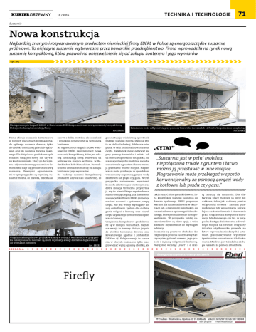 TECHNIKA I TECHNOLOGIE 10 / 2015 71 Suszarnie Nowa konstrukcja Najbardziej znanym i rozpoznawalnym produktem niemieckiej firmy EBERL w Polsce są energooszczędne suszarnie próżniowe. To niejedyne suszarnie wytwarzane przez bawarskie przedsiębiorstwo. Firma wprowadziła na rynek nową suszarnię kompaktową, która pozwoli na uniezależnienie się od zakupu kontenera i jego wymiarów. Opr. (br) Na tegorocznych targach LIGNA w Hanowerze EBERL zaprezentował nową suszarnię kompaktową, która jest własną konstrukcją firmy. Fot. EBERL Firma oferuje suszarnie kontenerowe w różnych wariantach przeznaczenia: do ogólnego suszenia drewna, tylko do obróbki termicznej palet lub opakowań oraz do suszenia drewna opałowego. Dla dotychczas produkowanych suszarni bazą jest nowy lub używany kontener morski, który po dociepleniu i odpowiednim wyposażeniu w firmie EBERL staje się pełnowartościową suszarnią. Pewnymi ograniczeniami w tym przypadku są wymiary. Suszarnie można, co prawda, przedłużać nawet o kilka metrów, ale szerokość i wysokość ograniczone są wielkością kontenera. Na tegorocznych targach LIGNA w Hanowerze EBERL zaprezentował nową suszarnię kompaktową, która jest własną konstrukcją firmy, budowaną od podstaw na miejscu w firmie, w Bodenkirchen koło Monachium. Pozwoliło to na uniezależnienie się od zakupu kontenera i jego wymiarów. Do budowy suszarni kompaktowej producent używa stali szlachetnej, co Urządzenia kompaktowe produkowane są w różnych wariantach. W przypadku każdej suszarni możliwe są różne wymiary, a więc dokładne dopasowanie do wymagań odbiorcy. Fot. EBERL Załadunek może odbywać się przy pomocy torowiska i wózka lub od frontu bezpośrednio sztaplarką. Fot. EBERL gwarantuje jej wieloletnią żywotność. Podłogę stanowi mocna, stabilna płyta ze stali szlachetnej, dokładnie ocieplona, w celu zminimalizowania strat ciepła. Załadunek może odbywać się przy pomocy torowiska i wózka lub od frontu bezpośrednio sztaplarką. Suszarnia jest w pełni mobilna, niepołączona trwale z gruntem i łatwo można ją przestawić w inne miejsce. Nagrzewanie może przebiegać w sposób konwencjonalny za pomocą gorącej wody z kotłowni lub prądu czy gazu. W tym przypadku zastosowane wymienniki ciepła odlotowego z wlotowym oraz dobra izolacja termiczna przyczyniają się do niewielkiego zapotrzebowania na energię cieplną. Dla firm nieposiadających kotłowni EBERL proponuje wariant suszarni z systemem pompy ciepła. Nie jest wtedy wymagany dostęp do kotłowni. System dba o odciąganie wilgoci z komory oraz odzysk ciepła używanego powtórnie do ogrzewania komory. Urządzenia kompaktowe produkowane są w różnych wariantach. Najtańsza wersja to komory służące jedynie do obróbki termicznej drewna opakowaniowego, zgodnie z protokołem IPSM nr 15. Kolejna wersja to suszarnie, w których można nie tylko przeprowadzać wyżej opisaną obróbkę, ale „cytat” „Suszarnia jest w pełni mobilna, niepołączona trwale z gruntem i łatwo można ją przestawić w inne miejsce. Nagrzewanie może przebiegać w sposób konwencjonalny za pomocą gorącej wody z kotłowni lub prądu czy gazu.” także suszyć różne gatunki drewna. Inną konstrukcję stanowi suszarnia do drewna opałowego. EBERL proponuje wariant dla suszenia drewna w skrzyniach lub, o nieco innej konstrukcji, do suszenia drewna opałowego ściśle ułożonego, które jest trudniejsze do napowietrzania. W przypadku każdej suszarni możliwe są różne opcje, a więc dokładne dopasowanie do wymagań odbiorcy. Suszarnie są proste w obsłudze. Do rozpoczęcia procesu suszenia wystarczy wpisać gatunek drewna, jego grubość i żądaną wilgotność końcową. Następnie wcisnąć „start” i o resz- tę troszczy się suszarnia. Dla ułatwienia pracy możliwe są opcje dodatkowe, takie jak: radiowy pomiar wilgotności drewna - zamiast przewodowego lub wizualizacja pozwalająca na kontrolowanie i sterowanie pracą urządzenia z komputera biurowego lub domowego czy też, w przypadku dostępu do internetu, z dowolnego miejsca na świecie. Przyjazny interfejs użytkownika pozwala na łatwe wprowadzanie danych i ustawień, przechowywanie wykresów i protokołów suszenia oraz ich drukowanie. Możliwa jest też zdalna obsługa suszarni za pomocą smartfona. REKLAMA Suszarnie próżniowe do drewna od 1 do100 m3 Firefly PFZ Kubiak - Wasilewski ul. Opolska 33 91-604 Łódź tel kom.: 601 299 933 lub 500 106 404 www. pfz.pol.pl e-mail: [email protected]