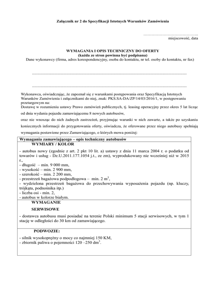 Załącznik nr 2 do Specyfikacji Istotnych Warunków Zamówienia ………………………………….. miejscowość, data WYMAGANIA I OPIS TECHNICZNY DO OFERTY (każda ze stron powinna być podpisana) Dane wykonawcy (firma, adres korespondencyjny, osoba do kontaktu, nr tel. osoby do kontaktu, nr fax) ......................................................................................................................................................... ......................................................................................................................................................... Wykonawca, oświadczając, że zapoznał się z warunkami postępowania oraz Specyfikacją Istotnych Warunków Zamówienia i załącznikami do niej, znak: PKS.SA-DA/ZP/14/03/2016/1, w postępowaniu przetargowym na: Dostawę w rozumieniu ustawy Prawo zamówień publicznych, tj. leasing operacyjny przez okres 5 lat licząc od dnia wydania pojazdu zamawiającemu 8 nowych autobusów, oraz nie wnosząc do nich żadnych zastrzeżeń, przyjmując warunki w nich zawarte, a także po uzyskaniu koniecznych informacji do przygotowania oferty, oświadcza, że oferowane przez niego autobusy spełniają wymagania postawione przez Zamawiającego, o których mowa poniżej: Wymagania zamawiającego – opis techniczny autobusów WYMIARY / KOLOR - autobus nowy (zgodnie z art. 2 pkt 10 lit. a) ustawy z dnia 11 marca 2004 r. o podatku od towarów i usług - Dz.U.2011.177.1054 j.t., ze zm), wyprodukowany nie wcześniej niż w 2015 r., - długość – min. 9 000 mm, - wysokość – min. 2 900 mm, - szerokość – min. 2 200 mm, - przestrzeń bagażowa podpodłogowa – min. 2 m3, - wydzielona przestrzeń bagażowa do przechowywania wyposażenia pojazdu (np. kluczy, trójkąta, podnośnika itp.) - liczba osi - min. 2, - autobus w kolorze białym. WYMAGANIE SERWISOWE - dostawca autobusu musi posiadać na terenie Polski minimum 5 stacji serwisowych, w tym 1 stację w odległości do 30 km od zamawiającego. PODWOZIE: - silnik wysokoprężny o mocy co najmniej 150 KM, - zbiornik paliwa o pojemności 120 –250 dm3. HAMULCE: - roboczy: tarcze na wszystkich osiach, z systemem ABS i ASR, - postojowy: pneumatyczny. NADWOZIE: - z materiałów nierdzewnych lub trudno korodujących, - poszycie boczne – z materiałów odpornych na korozję, stali nierdzewnej lub aluminium, - podłoga antypoślizgowa, - szyba przednia jednoczęściowa, panoramiczna klejona do nadwozia lub montowana na uszczelce, - dwudrzwiowe – drzwi usytuowane po prawej stronie autobusu, w tym jedne z przodu autobusu, wyposażone w uchwyty lub poręcze (w razie urządzenia oddzielnego przedziału kierowcy przedział ten powinien umożliwiać wyjście na zewnątrz autobusu), jednoskrzydłowe lub dwuskrzydłowe, napędzane pneumatycznie, z możliwością blokady tylnych drzwi, - wyjścia awaryjne (liczba wyjść awaryjnych nie może być mniejsza niż: a) przy liczbie miejsc dla pasażerów nie większej niż 35 - cztery; dwa z prawej i dwa z lewej strony albo dwa z prawej strony, jedno z lewej i jedno z tyłu; b) przy liczbie miejsc dla pasażerów większej niż 35 - pięć; dwa z prawej strony, dwa z lewej strony i jedno z tyłu albo trzy z prawej strony i dwa z lewej strony); jeżeli miejsce kierowcy znajduje się w pomieszczeniu niepołączonym drzwiami z pomieszczeniem dla pasażerów, pomieszczenie takie powinno być wyposażone w wyjście awaryjne w innej ścianie niż drzwi wejściowe niezależnie od wyjść awaryjnych dla pasażerów, o których mowa w poprzednim zdaniu, dostęp do wyjść awaryjnych nie powinien być niczym utrudniony, przy czym siedzenia z oparciem odchylanym nie uważa się za utrudnienie, - bagażnik otwierany minimum z prawej strony, urządzony w taki sposób, aby umieszczony w nim bagaż był zabezpieczony przed wypadnięciem, uszkodzeniem lub zanieczyszczeniem. WENTYLACJA: - automatyczny system klimatyzacji, - indywidualne nawiewy lub klimatyzacja z centralnym rozprowadzeniem nawiewu powietrza. OGRZEWANIE - niezależne ogrzewanie, - grzejnik z nadmuchem w miejscu pracy kierowcy, - nagrzewnica szyby przedniej. WYPOSAŻENIE PRZESTRZENI PASAŻERSKIEJ - co najmniej 40 foteli pasażerskich, - siedzenia pasażerskie, wyposażone w pasy bezpieczeństwa, - ogólna ilość pasażerów - co najmniej 50 (liczba miejsc dla pasażerów siedzących i stojących powinna być tak ustalona, aby nie nastąpiło przekroczenie dopuszczalnej masy całkowitej autobusu, przy czym przyjmuje się, że średnia masa jednego pasażera wraz z bagażem wynosi 71 kg), - materiały wnętrza pomieszczenia pasażerskiego o prędkości spalania nie większej niż 100 mm/min, zgodnie z przepisami o homologacji pojazdów, - urządzenie do oświetlania wnętrza (w szczególności oświetlenie przestrzeni pasażerskiej), - zasłony w bocznych oknach, jeżeli autobus nie jest wyposażony w szyby przeciwsłoneczne, - mikrofon dostępny dla kierowcy, zestaw głośników umiejscowiony w przedniej części autobusu i nad miejscami pasażerskimi, - urządzenie służące do dawania sygnałów z wnętrza autobusu do kierowcy, jeżeli znajduje się on w oddzielnym pomieszczeniu. WYPOSAŻENIE STANOWISKA KIEROWCY - fotel kierowcy na zawieszeniu pneumatycznym z pełną regulacją, z trzypunktowym pasem bezpieczeństwa, - żaluzje przeciwsłoneczne regulowane, - lusterko wewnętrzne zapewniające kierowcy widoczność wnętrza autobusu, - zasłona za miejscem kierowcy, zabezpieczająca przed pogorszeniem widoczności drogi w razie włączenia oświetlenia wnętrza autobusu. WYPOSAŻENIE POZOSTAŁE - wyposażony w ogranicznik prędkości do 90 km/godz., - tachograf cyfrowy z legalizacją, - wycieraczki o min. 3 prędkościach pracy, - sygnał dźwiękowy, sygnał dźwiękowy biegu wstecznego, - lusterka zewnętrzne zgodne z obowiązującym prawem, podgrzewane i sterowane elektrycznie, - immobilizer, - ogumione koło zapasowe, - 2 trójkąty ostrzegawcze, - aptecz