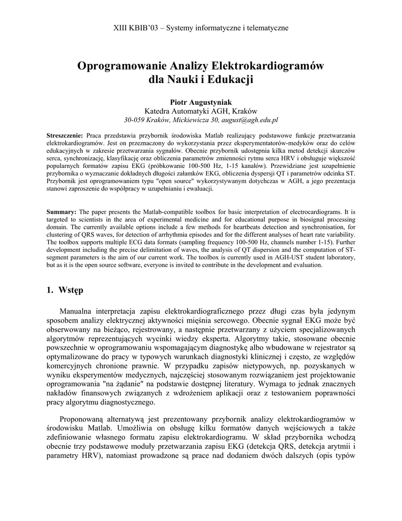 XIII KBIB’03 – Systemy informatyczne i telematyczne Oprogramowanie Analizy Elektrokardiogramów dla Nauki i Edukacji Piotr Augustyniak Katedra Automatyki AGH, Kraków 30-059 Kraków, Mickiewicza 30, [email protected] Streszczenie: Praca przedstawia przybornik środowiska Matlab realizujący podstawowe funkcje przetwarzania elektrokardiogramów. Jest on przeznaczony do wykorzystania przez eksperymentatorów-medyków oraz do celów edukacyjnych w zakresie przetwarzania sygnałów. Obecnie przybornik udostępnia kilka metod detekcji skurczów serca, synchronizację, klasyfikację oraz obliczenia parametrów zmienności rytmu serca HRV i obsługuje większość popularnych formatów zapisu EKG (próbkowanie 100-500 Hz, 1-15 kanałów). Przewidziane jest uzupełnienie przybornika o wyznaczanie dokładnych długości załamków EKG, obliczenia dyspersji QT i parametrów odcinka ST. Przybornik jest oprogramowaniem typu "open source" wykorzystywanym dotychczas w AGH, a jego prezentacja stanowi zaproszenie do współpracy w uzupełnianiu i ewaluacji. Summary: The paper presents the Matlab-compatible toolbox for basic interpretation of electrocardiograms. It is targeted to scientists in the area of experimental medicine and for educational purpose in biosignal processing domain. The currently available options include a few methods for heartbeats detection and synchronisation, for clustering of QRS waves, for detection of arrhythmia episodes and for the different analyses of heart rate variability. The toolbox supports multiple ECG data formats (sampling frequency 100-500 Hz, channels number 1-15). Further development including the precise delimitation of waves, the analysis of QT dispersion and the computation of STsegment parameters is the aim of our current work. The toolbox is currently used in AGH-UST student laboratory, but as it is the open source software, everyone is invited to contribute in the development and evaluation. 1. Wstęp Manualna interpretacja zapisu elektrokardiograficznego przez długi czas była jedynym sposobem analizy elektrycznej aktywności mięśnia sercowego. Obecnie sygnał EKG może być obserwowany na bieżąco, rejestrowany, a następnie przetwarzany z użyciem specjalizowanych algorytmów reprezentujących wycinki wiedzy eksperta. Algorytmy takie, stosowane obecnie powszechnie w oprogramowaniu wspomagającym diagnostykę albo wbudowane w rejestrator są optymalizowane do pracy w typowych warunkach diagnostyki klinicznej i często, ze względów komercyjnych chronione prawnie. W przypadku zapisów nietypowych, np. pozyskanych w wyniku eksperymentów medycznych, najczęściej stosowanym rozwiązaniem jest projektowanie oprogramowania "na żądanie" na podstawie dostępnej literatury. Wymaga to jednak znacznych nakładów finansowych związanych z wdrożeniem aplikacji oraz z testowaniem poprawności pracy algorytmu diagnostycznego. Proponowaną alternatywą jest prezentowany przybornik analizy elektrokardiogramów w środowisku Matlab. Umożliwia on obsługę kilku formatów danych wejściowych a także zdefiniowanie własnego formatu zapisu elektrokardiogramu. W skład przybornika wchodzą obecnie trzy podstawowe moduły przetwarzania zapisu EKG (detekcja QRS, detekcja arytmii i parametry HRV), natomiast prowadzone są prace nad dodaniem dwóch dalszych (opis typów XIII KBIB’03 – Systemy informatyczne i telematyczne pobudzeń, detekcja granic załamków). Dzięki przyjętej zasadzie publicznej dostępności kodu, istnieje możliwość uzupełnienia przybornika stosownie do potrzeb w przyszłości. Analiza zapisanego sygnału przebiega automatycznie, ale możliwe jest sterowanie nią przez ustawienie parametrów analizy. W poszczególnych fazach przetwarzania sygnału przybornik umożliwia podgląd wyników w postaci wykresów i odpowiednich współczynników. Wyniki przetwarzania na poszczególnych etapach można zapisać w plikach dyskowych w formacie ASCII, co umożliwia ich dalsze wykorzystanie w dowolnym programie. 2. Konstrukcja przybornika Analiza sygnału elektrokardiograficznego przebiega w następujących etapach [1, 4, 5]: - określenie jakości sygnału i ewentualnie przeprowadzenie filtracji, detekcja zespołów QRS, wykrycie poziomu izolinii i stosunku sygnału do szumu, wyznaczenie przybliżonych rozmiarów zespołów QRS i położenia punktu synchronizacji, wyliczenie częstości rytmu, klasyfikacja zespołów QRS i wybranie reprezentantów tych klas, określenie morfologii reprezentantów klas, wyznaczenie położenia załamków P, QRS i T, wyznaczenie parametrów odcinka ST, wyznaczenie dyspersji końca załamka T w poszczególnych kanałach, stwierdzenie występowania późnych potencjałów komorowych, obliczenie osi serca, W przypadku badania metodą Holtera oprócz analiz wymienionych powyżej dokonuje się dodatkowo [2, 4]: - oceny zmienności rytmu serca (ang. HRV) [3], detekcji arytmii, oceny pracy kardiostymulatora, detekcji alternansu załamka T. Celem autora było zaprojektowanie i implementacja modułowego przybornika automatycznego przetwarzania elektrokardiogramów przy użyciu pakietu MATLAB. Przybornik powinien się charakteryzować funkcjonalnością i walorami edukacyjnymi. Założono możliwość obsługi kilku formatów zapisu elektrokardiogramów, takich standardów jak: - MIT-BIH Arrhythmia Database - Massachussetts Institute of Technology - Beth Israel Hospital (2 kanały, 120-360 Hz) Stress EKG - badanie wysiłkowe EKG (12 kanałów, 400 Hz) CSE Multilead Database - Common Standard for Quantitative Electrocardiography (15 kanałów, 500 Hz) ASPEL - format zapisu EKG firmy Aspel (3 kanały, 128 Hz) OXFORD - format zapisu EKG firmy Oxford Instruments Medical (3 kanały, 128 Hz) XIII KBIB’03 – Systemy informatyczne i telematyczne Ponieważ zagadnienie automatycznego przetwarzania sygnału EKG jest bardzo obszerne, w opisywanym etapie prac uwzględniono jedynie wybrane aspekty automatycznej analizy elektrokardiogram