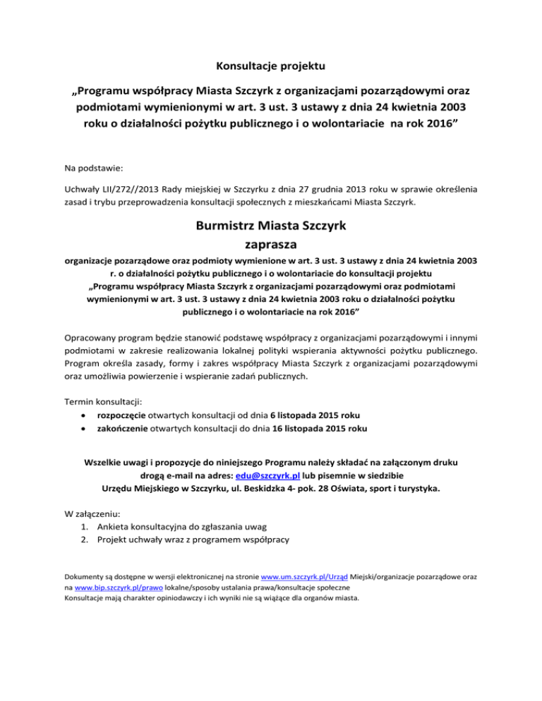 Konsultacje projektu „Programu współpracy Miasta Szczyrk z organizacjami pozarządowymi oraz podmiotami wymienionymi w art. 3 ust. 3 ustawy z dnia 24 kwietnia 2003 roku o działalności pożytku publicznego i o wolontariacie na rok 2016” Na podstawie: Uchwały LII/272//2013 Rady miejskiej w Szczyrku z dnia 27 grudnia 2013 roku w sprawie określenia zasad i trybu przeprowadzenia konsultacji społecznych z mieszkańcami Miasta Szczyrk. Burmistrz Miasta Szczyrk zaprasza organizacje pozarządowe oraz podmioty wymienione w art. 3 ust. 3 ustawy z dnia 24 kwietnia 2003 r. o działalności pożytku publicznego i o wolontariacie do konsultacji projektu „Programu współpracy Miasta Szczyrk z organizacjami pozarządowymi oraz podmiotami wymienionymi w art. 3 ust. 3 ustawy z dnia 24 kwietnia 2003 roku o działalności pożytku publicznego i o wolontariacie na rok 2016” Opracowany program będzie stanowić podstawę współpracy z organizacjami pozarządowymi i innymi podmiotami w zakresie realizowania lokalnej polityki wspierania aktywności pożytku publicznego. Program określa zasady, formy i zakres współpracy Miasta Szczyrk z organizacjami pozarządowymi oraz umożliwia powierzenie i wspieranie zadań publicznych. Termin konsultacji: rozpoczęcie otwartych konsultacji od dnia 6 listopada 2015 roku zakończenie otwartych konsultacji do dnia 16 listopada 2015 roku Wszelkie uwagi i propozycje do niniejszego Programu należy składać na załączonym druku drogą e-mail na adres: [email protected] lub pisemnie w siedzibie Urzędu Miejskiego w Szczyrku, ul. Beskidzka 4- pok. 28 Oświata, sport i turystyka. W załączeniu: 1. Ankieta konsultacyjna do zgłaszania uwag 2. Projekt uchwały wraz z programem współpracy Dokumenty są dostępne w wersji elektronicznej na stronie www.um.szczyrk.pl/Urząd Miejski/organizacje pozarządowe oraz na www.bip.szczyrk.pl/prawo lokalne/sposoby ustalania prawa/konsultacje społeczne Konsultacje mają charakter opiniodawczy i ich wyniki nie są wiążące dla organów miasta. ANKIETA KONSULTACYJNA 1. Przedmiot i zakres konsultacji: Projekt „PROGRAMU WSPÓŁPRACY MIASTA ŻYWCA Z ORGANIZACJAMI POZARZĄDOWYMI ORAZ PODMIOTAMI, O KTÓRYCH MOWA W ART. 3 UST. 3 USTAWY Z DNIA 24 KWIETNIA 2003 R. O DZIAŁALNOŚCI POŻYTKU PUBLICZNEGO I O WOLONTARIACIE NA ROK 2016” 2. Termin konsultacji: Od dnia 06.11. do dnia 16.11.2015 roku 3. Zasięg konsultacji: środowiskowy 4. Forma konsultacji: Pisemna z wykorzystaniem ankiety konsultacyjnej ZGŁASZANE PROPOZYCJE ZMIAN ( opinie, wnioski, uwagi) Paragraf (§)pkt. Obecny zapis w projekcie Proponowany zapis zgłaszany przez Podmiot Uzasadnienie DANE PODMIOTU Nazwa Podmiotu Adres Podmiotu Imię i nazwisko przedstawiciela Podmiotu zgłaszającego opinię... Tel./fax. Podmiotu Adres e-mail Podmiotu Tel. kontaktowy lub adres e-mail osoby zgłaszającej opinię w imieniu Podmiotu ………………………………………………………………….. Data ……………………………………………………………………………….. Podpis osoby reprezentującej Podmiot Ankietę należy wysłać do dnia 16.11.2015 r. na adres e-mail: [email protected] lub złożyć w pok. 28 w Urzędzie Miejskim w Szczyrku, ul. Beskidzka 4