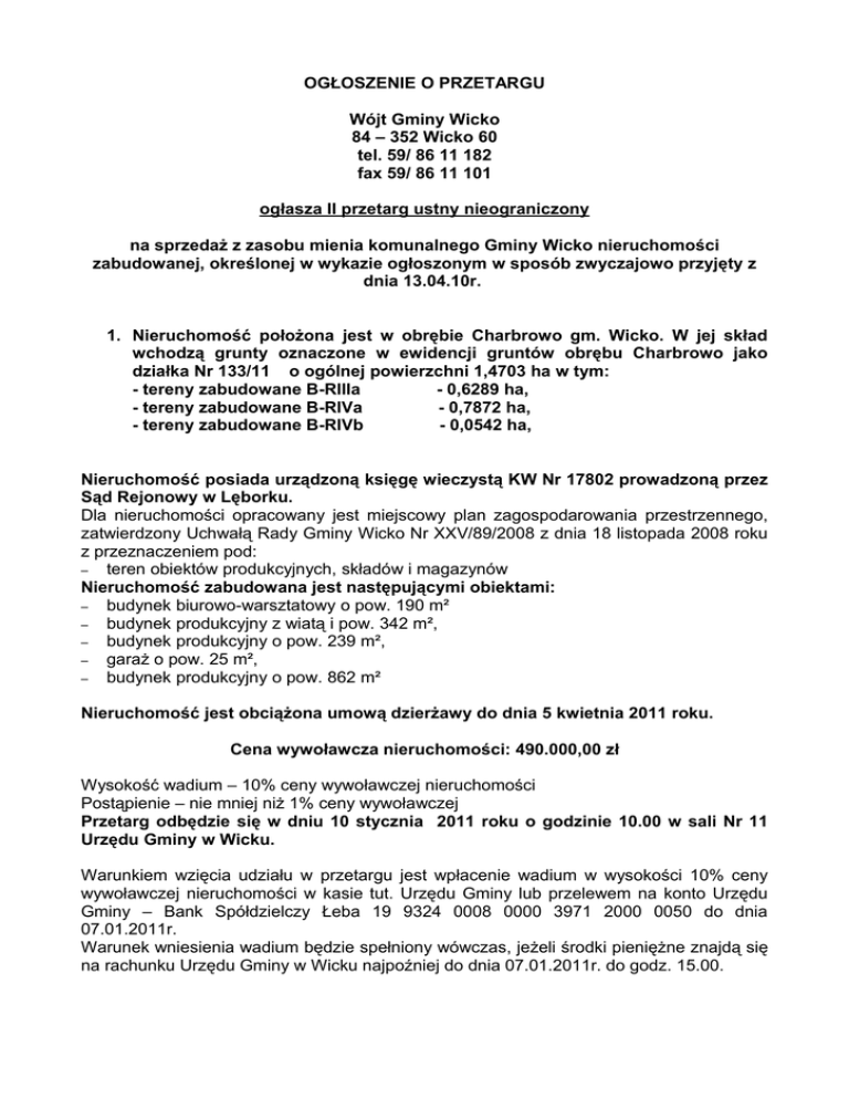 OGŁOSZENIE O PRZETARGU Wójt Gminy Wicko 84 – 352 Wicko 60 tel. 59/ 86 11 182 fax 59/ 86 11 101 ogłasza II przetarg ustny nieograniczony na sprzedaż z zasobu mienia komunalnego Gminy Wicko nieruchomości zabudowanej, określonej w wykazie ogłoszonym w sposób zwyczajowo przyjęty z dnia 13.04.10r. 1. Nieruchomość położona jest w obrębie Charbrowo gm. Wicko. W jej skład wchodzą grunty oznaczone w ewidencji gruntów obrębu Charbrowo jako działka Nr 133/11 o ogólnej powierzchni 1,4703 ha w tym: - tereny zabudowane B-RIIIa - 0,6289 ha, - tereny zabudowane B-RIVa - 0,7872 ha, - tereny zabudowane B-RIVb - 0,0542 ha, Nieruchomość posiada urządzoną księgę wieczystą KW Nr 17802 prowadzoną przez Sąd Rejonowy w Lęborku. Dla nieruchomości opracowany jest miejscowy plan zagospodarowania przestrzennego, zatwierdzony Uchwałą Rady Gminy Wicko Nr XXV/89/2008 z dnia 18 listopada 2008 roku z przeznaczeniem pod: – teren obiektów produkcyjnych, składów i magazynów Nieruchomość zabudowana jest następującymi obiektami: – budynek biurowo-warsztatowy o pow. 190 m² – budynek produkcyjny z wiatą i pow. 342 m², – budynek produkcyjny o pow. 239 m², – garaż o pow. 25 m², – budynek produkcyjny o pow. 862 m² Nieruchomość jest obciążona umową dzierżawy do dnia 5 kwietnia 2011 roku. Cena wywoławcza nieruchomości: 490.000,00 zł Wysokość wadium – 10% ceny wywoławczej nieruchomości Postąpienie – nie mniej niż 1% ceny wywoławczej Przetarg odbędzie się w dniu 10 stycznia 2011 roku o godzinie 10.00 w sali Nr 11 Urzędu Gminy w Wicku. Warunkiem wzięcia udziału w przetargu jest wpłacenie wadium w wysokości 10% ceny wywoławczej nieruchomości w kasie tut. Urzędu Gminy lub przelewem na konto Urzędu Gminy – Bank Spółdzielczy Łeba 19 9324 0008 0000 3971 2000 0050 do dnia 07.01.2011r. Warunek wniesienia wadium będzie spełniony wówczas, jeżeli środki pieniężne znajdą się na rachunku Urzędu Gminy w Wicku najpoźniej do dnia 07.01.2011r. do godz. 15.00. Wpłata wadium jest równoznaczna z zapoznaniem się ze stanem przedmiotu przetargu jak i uwarunkowaniami planistycznymi i urbanistycznymi dotyczącymi zbywanej nieruchomości. Wadium wpłacone przez uczestnika, który przetarg wygra zostanie zaliczone na poczet nabycia nieruchomości. Uczestnikom, którzy przetargu nie wygrali wadium zostanie zwrócone niezwłocznie po zakończeniu przetargu. Wadium przepada na rzecz Gminy w przypadku uchylenia sie uczestnika, który przetarg wygrał i odstąpił od zawarcia umowy kupna. 2. Dowód wpłaty wadium należy przedłożyć komisji przetargowej przed rozpoczęciem przetargu. 3. Osoby przystępujące do przetargu zobowiązane są do przedstawienia Komisji Przetargowej następujących dokumentów: 1) osoby fizyczne – dokument potwierdzający tożsamość (dowód osobisty lub paszport), 2) przedsiębiorcy wpisani do ewidencji działalności gospodarczej – dokument potwierdzający tożsamość oraz aktualne zaświadczenie o wpisie do ewidencji działalności gospodarczej, 3) reprezentanci osoby prawnej – dokument potwierdzający tożsamość i aktualny odpis z właściwego rejestru , wykazujący umocowanie do reprezentowania danej osoby prawnej, 4) pełnomocnicy – dokument potwierdzający tożsamość i pisemne pełnomocnictwo, oraz - w przypadku osoby prawnej – aktualny odpis z właściwego rejestru, wykazujący umocowanie osób, które podpisały pełnomocnictwo do reprezentowania danej osoby prawnej, - w przypadku przedsiębiorcy wpisanego do ewidencji działalności gospodarczej – aktualne zaświadczenie o wpisie do ewidencji działalności gospodarczej. Nabywca nieruchomości ponosi w całości koszty notarialne i sądowe. Zastrzega sie prawo unieważnienia przetargu w przypadku zaistnienia uzasadnionych przyczyn. Ogłoszenie podaje się do publicznej wiadomości poprzez wywieszenie na tablicy ogłoszeń w tut. Urzędzie Gminy na okres od 25.10.2010r. do 10.01.2011r,. umieszczenie na stronie internetowej Urzędu www.bip.wicko.pl , w prasie lokalnej i codziennej ogólnokrajowej. WÓJT GMINY WICKO /-/ Dariusz Waleśkiewicz