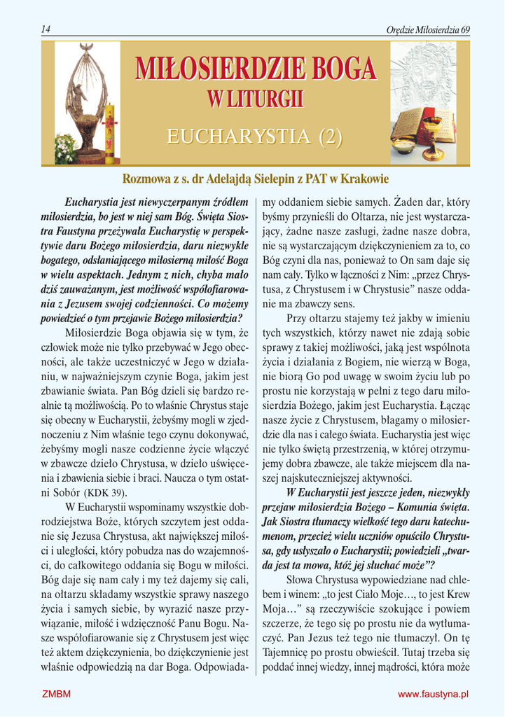 14 Orędzie Miłosierdzia 69 MIŁOSIERDZIE BOGA W LITURGII EUCHARYSTIA (2) Rozmowa z s. dr Adelajdą Sielepin z PAT w Krakowie Eucharystia jest niewyczerpanym źródłem miłosierdzia, bo jest w niej sam Bóg. Święta Siostra Faustyna przeżywała Eucharystię w perspektywie daru Bożego miłosierdzia, daru niezwykle bogatego, odsłaniającego miłosierną miłość Boga w wielu aspektach. Jednym z nich, chyba mało dziś zauważanym, jest możliwość współofiarowania z Jezusem swojej codzienności. Co możemy powiedzieć o tym przejawie Bożego miłosierdzia? Miłosierdzie Boga objawia się w tym, że człowiek może nie tylko przebywać w Jego obecności, ale także uczestniczyć w Jego w działaniu, w najważniejszym czynie Boga, jakim jest zbawianie świata. Pan Bóg dzieli się bardzo realnie tą możliwością. Po to właśnie Chrystus staje się obecny w Eucharystii, żebyśmy mogli w zjednoczeniu z Nim właśnie tego czynu dokonywać, żebyśmy mogli nasze codzienne życie włączyć w zbawcze dzieło Chrystusa, w dzieło uświęcenia i zbawienia siebie i braci. Naucza o tym ostatni Sobór (KDK 39). W Eucharystii wspominamy wszystkie dobrodziejstwa Boże, których szczytem jest oddanie się Jezusa Chrystusa, akt największej miłości i uległości, który pobudza nas do wzajemności, do całkowitego oddania się Bogu w miłości. Bóg daje się nam cały i my też dajemy się cali, na ołtarzu składamy wszystkie sprawy naszego życia i samych siebie, by wyrazić nasze przywiązanie, miłość i wdzięczność Panu Bogu. Nasze współofiarowanie się z Chrystusem jest więc też aktem dziękczynienia, bo dziękczynienie jest właśnie odpowiedzią na dar Boga. OdpowiadaZMBM my oddaniem siebie samych. Żaden dar, który byśmy przynieśli do Ołtarza, nie jest wystarczający, żadne nasze zasługi, żadne nasze dobra, nie są wystarczającym dziękczynieniem za to, co Bóg czyni dla nas, ponieważ to On sam daje się nam cały. Tylko w łączności z Nim: „przez Chrystusa, z Chrystusem i w Chrystusie” nasze oddanie ma zbawczy sens. Przy ołtarzu stajemy też jakby w imieniu tych wszystkich, którzy nawet nie zdają sobie sprawy z takiej możliwości, jaką jest wspólnota życia i działania z Bogiem, nie wierzą w Boga, nie biorą Go pod uwagę w swoim życiu lub po prostu nie korzystają w pełni z tego daru miłosierdzia Bożego, jakim jest Eucharystia. Łącząc nasze życie z Chrystusem, błagamy o miłosierdzie dla nas i całego świata. Eucharystia jest więc nie tylko świętą przestrzenią, w której otrzymujemy dobra zbawcze, ale także miejscem dla naszej najskuteczniejszej aktywności. W Eucharystii jest jeszcze jeden, niezwykły przejaw miłosierdzia Bożego – Komunia święta. Jak Siostra tłumaczy wielkość tego daru katechumenom, przecież wielu uczniów opuściło Chrystusa, gdy usłyszało o Eucharystii; powiedzieli „twarda jest ta mowa, któż jej słuchać może”? Słowa Chrystusa wypowiedziane nad chlebem i winem: „to jest Ciało Moje…, to jest Krew Moja…” są rzeczywiście szokujące i powiem szczerze, że tego się po prostu nie da wytłumaczyć. Pan Jezus też tego nie tłumaczył. On tę Tajemnicę po prostu obwieścił. Tutaj trzeba się poddać innej wiedzy, innej mądrości, która może www.faustyna.pl styczeń, luty, marzec 2009 przyjść wraz Duchem Świętym. Pan Jezus mówi, że Duch Święty przyjdzie i nas pouczy, bo litera, same sformułowania, wyjaśnienia po prostu są niewystarczające, gdyż jest to zupełnie inny poziom wiedzy. Na szczęście nie musimy polegać tylko na wyjaśnieniach. W sakramencie chrztu i bierzmowania otrzymaliśmy Ducha Świętego, który od wnętrza odsłania nam głębię tej tajemnicy, o której mówi Chrystus. Dzięki uległości Duchowi Świętemu możemy przejść z poziomu doczesnego, widzialnego, z poziomu ludzkiej logiki na poziom nadprzyrodzony, na poziom mądrości Bożej, tej „z góry”. To jest zupełnie nowa jakość, bo choć posługujemy się tymi samymi znakami widzialnymi, jakimi są chleb i wino, to przecież dotykamy już Ciała i Krwi Chrystusa. Tylko wiara i to światło Ducha Świętego może przenieść nas na nadprzyrodzony poziom myślenia i przeżywania Eucharystii. Kiedy przyjmujemy Komunię świętą, to zapraszamy Chrystusa do swojego życia, by je przemieniał, uświęcał, czynił je pięknym w człowieczeństwie i chrześcijańskim powołaniu. Choć Eucharystia ma w sobie moc przebóstwiającą życie człowieka, to wiemy z obserwacji, że ten proces nie dokonuje się w tak wielu chrześcijanach, Komunia święta nie owocuje w ich życiu, nie zmienia go. Dlaczego? Czymś najgorszym w naszym życiu chrześcijańskim jest brak wiary. Działa jak ślepota. Przyjmujemy Chrystusa w Komunii świętej, a postępujemy tak, jakby Go nie było w naszej codzienności. Nie potrafimy uwierzyć, że Chrystus żyje w nas i że powinniśmy Mu po prostu robić miejsce w swoim życiu, stawać się przezroczystymi, czytelnymi świadkami Jego obecności. Dzieje się tak przypuszczalnie dlatego, że nie ma w ludziach wierzących świadomości realnej obecności Jezusa w ich życiu, Jego miłosiernej miłości i mocy. Tej świadomości nie da się osiągnąć tylko przy pomocy jakichś zewnętrznych praktyk, nawet przez bierne uczestnictwo w Eucharystii. Tu trzeba po prostu rozwijać dary ZMBM 15 otrzymane na chrzcie świętym, przede wszystkim wiarę, nadzieję i miłość, trzeba przejąć się tą prawdą, że Chrystus żyje w nas i że On może wszystko. Wtedy nie będziemy się bali przekraczać siebie, bo tę możliwość zapewnia Bóg. I dopiero wtedy nasze życie będzie się zmieniało. Po to Chrystus z nami został, żebyśmy mogli zrobić więcej niż tylko po ludzku jesteśmy w stanie osiągnąć. Brak współpracy z Jezusem, z Jego łaską, jest powodem, że Eucharystia tak mało nas zmienia. Pamiętajmy, że Bóg nie chce nas wyręczać w niczym, On chce z nami wspó