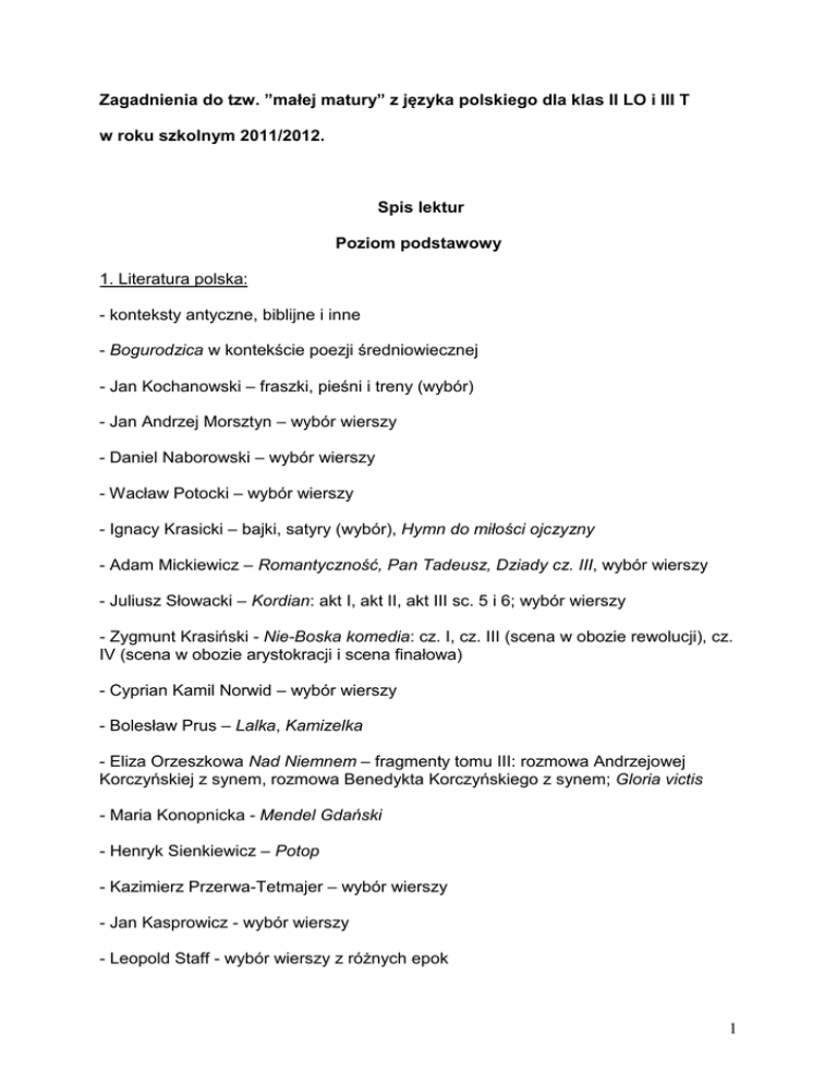 Zagadnienia do tzw. ”małej matury” z języka polskiego dla klas II LO i III T w roku szkolnym 2011/2012. Spis lektur Poziom podstawowy 1. Literatura polska: - konteksty antyczne, biblijne i inne - Bogurodzica w kontekście poezji średniowiecznej - Jan Kochanowski – fraszki, pieśni i treny (wybór) - Jan Andrzej Morsztyn – wybór wierszy - Daniel Naborowski – wybór wierszy - Wacław Potocki – wybór wierszy - Ignacy Krasicki – bajki, satyry (wybór), Hymn do miłości ojczyzny - Adam Mickiewicz – Romantyczność, Pan Tadeusz, Dziady cz. III, wybór wierszy - Juliusz Słowacki – Kordian: akt I, akt II, akt III sc. 5 i 6; wybór wierszy - Zygmunt Krasiński - Nie-Boska komedia: cz. I, cz. III (scena w obozie rewolucji), cz. IV (scena w obozie arystokracji i scena finałowa) - Cyprian Kamil Norwid – wybór wierszy - Bolesław Prus – Lalka, Kamizelka - Eliza Orzeszkowa Nad Niemnem – fragmenty tomu III: rozmowa Andrzejowej Korczyńskiej z synem, rozmowa Benedykta Korczyńskiego z synem; Gloria victis - Maria Konopnicka - Mendel Gdański - Henryk Sienkiewicz – Potop - Kazimierz Przerwa-Tetmajer – wybór wierszy - Jan Kasprowicz - wybór wierszy - Leopold Staff - wybór wierszy z różnych epok 1 - Stanisław Wyspiański – Wesele - Władysław Stanisław Reymont – Chłopi (t. I) 2. Literatura powszechna: - Sofokles - Król Edyp - Horacy – wybór pieśni - William Szekspir – Makbet - Molier - Świętoszek - Johann Wolfgang Goethe – Cierpienia młodego Wertera - Fiodor Dostojewski – Zbrodnia i kara ZAGADNIENIA DO POWTÓRKI STAROŻYTNOŚĆ 1. Co to jest mit? Najsłynniejsze mity i postacie z mitologii greckiej, ich symbolika (np. mit o Dedalu i Ikarze, o Syzyfie, o labiryncie, o Narcyzie, mit kosmogoniczny, mity o stworzeniu człowieka, mit trojański i mity tebańskie, bogowie olimpijscy). Pojęcia sacrum i profanum. 2. Cechy eposu homeryckiego. Ideał greckiego herosa (np. Achilles, Hektor) 3. Tragedia grecka: - geneza - cechy tragedii - budowa teatru greckiego - konflikt tragiczny, ironia tragiczna, *katharsis, *mimesis, zasada decorum - tragizm postaci w Królu Edypie Sofoklesa (mit o Labdakidach). Rola Fatum w życiu człowieka. Wina tragiczna. 4. Horacjański pogląd na świat: (teksty Horacego z podręcznika) - carpe diem i filozofie greckie - motyw non omnis moriar (oda Exegi monumentum...) 5. Filozofie : stoicyzm, epikureizm, Sokrates, Platon, Arystoteles 7. Biblia – źródło kultury europejskiej. Świat wartości – np. miłość, sens cierpienia. - czas powstania, tłumaczenia (Septuaginta, Wulgata), podział ksiąg - styl biblijny – cechy - gatunki - znajomość 3 wybranych przypowieści, np. O miłosiernym Samarytaninie, O synu marnotrawnym, O siewcy 2 - Księga Hioba (fragm.), Księga Psalmów( wybrane psalmy), Księga Rodzaju – stworzenie świata i człowieka), - Apokalipsa (fragm.) - Symbolika biblijna. Inspiracje biblijne w literaturze i sztuce epok późniejszych. ŚREDNIOWIECZE 1. Ogólny charakter epoki: Granice czasowe (Europa – Polska). Tło historyczne (feudalizm, powstawanie państw chrześcijańskich, dwuwładza: cesarstwo – papiestwo, wyprawy krzyżowe, itd.) 2. Średniowieczny uniwersalizm: społeczno – polityczna dominacja Kościoła, rola łaciny, stosunek do Antyku, hierarchia i pośrednictwo. - *podstawy filozofii chrześcijańskiej: Tomasz z Akwinu, św. Augustyn, św. Franciszek, scholastyka, teocentryzm 3. Sztuka średniowieczna – sakralny charakter architektury, rzeźby i malarstwa. Styl romański i gotycki, przykłady zabytków. 4. Kultura krzyża: wzorce religijnego postępowania: święty i asceta – Legenda o św. Aleksym i Kwiatki św. Franciszka (fragmenty poznane w gimnazjum) – cechy świętego, schemat życia. Hagiografia, kult świętych, ich funkcja 5. Etos rycerski - Pieśń o Rolandzie (fragm.) – treść, tło historyczne, cechy Rolanda, śmierć bohatera zgodna z „ars moriendi” – jej symbolika - ideał władcy - Kronika polska Galla Anonima (fragment), Karol Wielki z Pieśni o Rolandzie 6. Śmierć w średniowieczu – alegoryczność obrazowania - memento mori i motyw marności / vanitas / - ars moriendi – sztuka umierania - dance macabre – „ Rozmowa Mistrza Polikarpa ze Śmiercią ”(fragm.) 7. Polska liryka średniowieczna. Liryka maryjna. *Średniowieczny wiersz zdaniowy. - Bogurodzica – temat, kompozycja, czas powstania , archaizmy w pieśni, *Deesis - Lament świętokrzyski – wizerunek Maryi, kompozycja, adresaci liryczni, *plankt 8. Dziejopisarstwo – historiografia: kronika, rocznik, gesta Najważniejsze polskie kroniki: np. Galla Anonima, podstawowe informacje o czasie powstania i treści. 9. Najstarsze zabytki piśmiennictwa polskiego. 10. *Teatr średniowieczny: dramat liturgiczny ( XIIw.), mirakle, misteria, moralitety. RENESANS I Renesans europejski 1. Italia : – *Boccaccio, Dekameron – kompozycja zbioru, cechy noweli, nowela Sokół – Wielcy artyści: np. Leonardo da Vinci, Michał Anioł, Tycjan, Rafael - cechy ich sztuki. 2. Główne prądy umysłowe i hasła epoki: humanizm, antropocentryzm, reformacja. Renesansowa koncepcja człowieka jako twórcy samego siebie. Godność i wolność człowieka (zob. np.* pisma Mirandoli) Nowa wizja świata – świat jako pole ekspansji człowieka. Odkrycia naukowe – np. teoria Kopernika, wynalazek druku – znaczenie. 3 Sens nazwy epoki i czas trwania. 3. Związki kultury odrodzenia z tradycją antyczną: - gatunki lit. – np. *epigramat, fraszka, hymn, pieśń, *elegia, tren, sielanka – przykłady. - światopogląd humanistyczny, filozofie – stoicyzm, epikureizm, *nepolatonizm renesans. - aluzje i nawiązania do mitologii, postaci i wydarzeń ze starożytności itp. 4. Sztuka renesansu: - styl – prostota, harmonia, umiar, proporcje, „złoty środek”, realizm (mimetyzm) II Renesans w Polsce – złoty wiek kultury polskiej – dlaczego? 1. Modele życia ludzkiego w twórczości pisarzy XVI w. – p