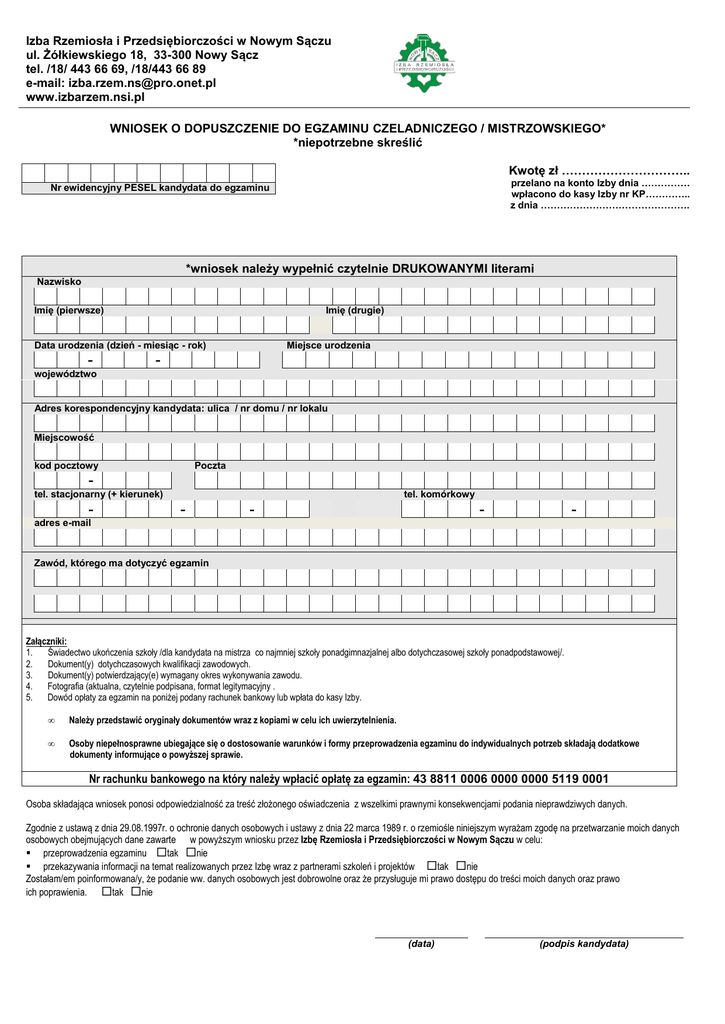Izba Rzemiosła i Przedsiębiorczości w Nowym Sączu ul. Żółkiewskiego 18, 33-300 Nowy Sącz tel. /18/ 443 66 69, /18/443 66 89 e-mail: [email protected] www.izbarzem.nsi.pl WNIOSEK O DOPUSZCZENIE DO EGZAMINU CZELADNICZEGO / MISTRZOWSKIEGO* *niepotrzebne skreślić Kwotę zł ………………………….. przelano na konto Izby dnia …………… wpłacono do kasy Izby nr KP………….. z dnia ………………………………………. Nr ewidencyjny PESEL kandydata do egzaminu *wniosek należy wypełnić czytelnie DRUKOWANYMI literami Nazwisko Imię (pierwsze) Imię (drugie) Data urodzenia (dzień - miesiąc - rok) - Miejsce urodzenia - województwo Adres korespondencyjny kandydata: ulica / nr domu / nr lokalu Miejscowość kod pocztowy Poczta tel. stacjonarny (+ kierunek) - tel. komórkowy - - - - adres e-mail Zawód, którego ma dotyczyć egzamin Załączniki: 1. Świadectwo ukończenia szkoły /dla kandydata na mistrza co najmniej szkoły ponadgimnazjalnej albo dotychczasowej szkoły ponadpodstawowej/. 2. Dokument(y) dotychczasowych kwalifikacji zawodowych. 3. Dokument(y) potwierdzający(e) wymagany okres wykonywania zawodu. 4. Fotografia (aktualna, czytelnie podpisana, format legitymacyjny . 5. Dowód opłaty za egzamin na poniżej podany rachunek bankowy lub wpłata do kasy Izby. • Należy przedstawić oryginały dokumentów wraz z kopiami w celu ich uwierzytelnienia. • Osoby niepełnosprawne ubiegające się o dostosowanie warunków i formy przeprowadzenia egzaminu do indywidualnych potrzeb składają dodatkowe dokumenty informujące o powyższej sprawie. Nr rachunku bankowego na który należy wpłacić opłatę za egzamin: 43 8811 0006 0000 0000 5119 0001 Osoba składająca wniosek ponosi odpowiedzialność za treść złożonego oświadczenia z wszelkimi prawnymi konsekwencjami podania nieprawdziwych danych. Zgodnie z ustawą z dnia 29.08.1997r. o ochronie danych osobowych i ustawy z dnia 22 marca 1989 r. o rzemiośle niniejszym wyrażam zgodę na przetwarzanie moich danych osobowych obejmujących dane zawarte w powyższym wniosku przez Izbę Rzemiosła i Przedsiębiorczości w Nowym Sączu w celu: przeprowadzenia egzaminu tak nie przekazywania informacji na temat realizowanych przez Izbę wraz z partnerami szkoleń i projektów tak nie Zostałam/em poinformowana/y, że podanie ww. danych osobowych jest dobrowolne oraz że przysługuje mi prawo dostępu do treści moich danych oraz prawo ich poprawienia. tak nie (data) (podpis kandydata) Wypełnia Izba Na podstawie złożonych dokumentów Izba stwierdza, iż w/w osoba spełnia poniższy warunek dopuszczający do egzaminu czeladniczego (rozporządzenie MEN w sprawie egz. czeladniczego, egz. mistrzowskiego oraz egz. sprawdzającego, przeprowadzanych przez komisje egzaminacyjne izb rzemieślniczych (Dz.U. z 2012 r., poz. 1117, § 6): posiada świadectwo ukończenia gimnazjum albo ośmioletniej szkoły podstawowej oraz ukończyła kształcenie ustawiczne w formie pozaszkolnej, dotyczące umiejętności zawodowych wchodzących w zakres zawodu, w którym zdaje egzamin; jest uczestnikiem praktycznej nauki zawodu dorosłych, o której mowa w art. 53c ustawy z dnia 20 kwietnia 2004 r. o promocji zatrudnienia i instytucjach rynku pracy; posiada świadectwo ukończenia gimnazjum albo ośmioletniej szkoły podstawowej i co najmniej trzyletni okres wykonywania zawodu, w którym zdaje egzamin; posiada świadectwo ukończenia szkoły ponadgimnazjalnej albo dotychczasowej szkoły ponadpodstawowej, prowadzącej kształcenie zawodowe o kierunku związanym z zawodem, w którym zdaje egzamin; posiada tytuł zawodowy w zawodzie wchodzącym w zakres zawodu, w którym zdaje egzamin, oraz co najmniej półroczny okres wykonywania zawodu, w którym zdaje egzamin; posiada świadectwo ukończenia gimnazjum albo ośmioletniej szkoły podstawowej oraz zaświadczenie o zdaniu egzaminu sprawdzającego lub świadectwo potwierdzające kwalifikację w zawodzie, a także co najmniej roczny okres wykonywania zawodu, w którym zdaje egzamin, po uzyskaniu zaświadczenia o zdaniu egzaminu sprawdzającego lub świadectwa potwierdzającego kwalifikację w zawodzie. Decyzja Izby o dopuszczeniu do egzaminu czeladniczego: Na podstawie złożonych dokumentów Izba stwierdza, iż w/w osoba spełnia poniższy warunek dopuszczający do egzaminu mistrzowskiego (rozporządzenie MEN w sprawie egz. czeladniczego, egz. mistrzowskiego oraz egz. sprawdzającego, przeprowadzanych przez komisje egzaminacyjne izb rzemieślniczych (Dz.U. z 2012 r., poz. 1117, § 7): posiada świadectwo ukończenia szkoły ponadgimnazjalnej albo dotychczasowej szkoły ponadpodstawowej oraz tytuł czeladnika lub równorzędny w zawodzie, w którym zdaje egzamin, a także: co najmniej trzyletni okres wykonywania zawodu, w którym zdaje egzamin, po uzyskaniu tytułu zawodowego, albo co najmniej sześcioletni okres wykonywania zawodu, w którym zdaje egzamin, łącznie przed i po uzyskaniu tytułu zawodowego; posiada świadectwo ukończenia szkoły ponadgimnazjalnej albo dotychczasowej szkoły ponadpodstawowej oraz co najmniej sześcioletni okres wykonywania zawodu, w którym zdaje egzamin, w ramach samodzielnie prowadzonej działalności gospodarczej; posiada świadectwo ukończenia szkoły ponadgimnazjalnej albo dotychczasowej szkoły ponadpodstawowej oraz tytuł czeladnika lub równorzędny w zawodzie wchodzącym w zakres zawodu, w którym zdaje egzamin, a także co najmniej trzyletni okres wykonywania zawodu, w którym zdaje egzamin, po uzyskaniu tytułu zawodowego; posiada świadectwo ukończenia szkoły ponadgimnazjalnej albo dotychczasowej szkoły ponadpodstawowej oraz tytuł mistrza w zawodzie wchodzącym w zakres zawodu, w którym zdaje egzamin, a także co najmniej roczny okres wykonywania zawodu, w którym zdaje egzamin, po uzyskaniu tytułu mistrza; posiada świadectwo ukończenia szkoły ponadgimnazjalnej albo dotychczasowej szkoły ponadpodstawowej, dających wykształcenie 