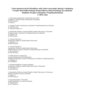 Lista macierzystych Ośrodków osób, które otrzymały dotację z funduszy Urzędu Marszałkowskiego Województwa Mazowieckiego na szkolenie Studium Terapii Uzależnień i Współuzależnienia w 2016 roku 1. Wojewódzki Samodzielny Zespół Publicznych ZOZ Całodobowy Oddział Terapii Uzależnienia od Alkoholu 09-500 Gostynin ul. Zalesie 1 2. Poradnia Terapii Uzależnienia od Alkoholu i Współuzależnienia od Alkoholu 05-500 Piaseczno ul. Tadeusza Gerbera 14 3. Samodzielny Publiczny Zespół Zakładów Opieki Zdrowotnej w Żurominie Poradnia Terapii Uzależnienia i Współuzależnienia od Alkoholu ul. Szpitalna 56 09-300 Żuromin 4. Centrum Odwykowe Samodzielny Publiczny Zakład Opieki Zdrowotnej ul. Zgierska 18 A 04-092 Warszawa 5. Centrum Odwykowe Samodzielny Publiczny Zakład Opieki Zdrowotnej Oddział Dzienny Terapii Uzależnień i Współuzależnienia od Alkoholu ul. Wł. Łokietka 11 03-590 Warszawa 6. NZOZ Żaneta Ewa Żukowska Centrum Diagnostyczno-Psychologiczne Niepubliczna Poradnia Leczenia Uzależnienia od Alkoholu i Współuzależnienia ul. Traugutta 23 06-100 Pułtusk 7. Ośrodek Profilaktyki i Terapii Uzależnień Samodzielny Publiczny Zakład Opieki Zdrowotnej w Wołominie ul. Powstańców 12 05-200 Wołomin 8. Samodzielny Publiczny Zespół Zakładów Opieki Zdrowotnej w Przasnyszu Oddział/ Ośrodek Leczenia Uzależnień ul. Sadowa 8 05-300 Przasnysz 9. Instytut Psychiatrii i Neurologii Zespół Profilaktyki i Leczenia Uzależnień ul. Sobieskiego 9 02-957 Warszawa