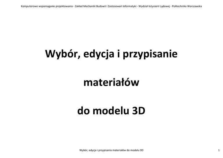 Wybór edycja i przypisania materialow do modelu 3D
