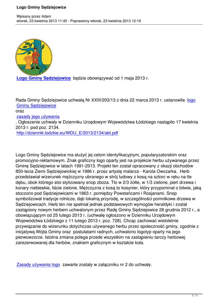 Logo Gminy Sędziejowice Wpisany przez Adam wtorek, 23 kwietnia 2013 11:45 - Poprawiony wtorek, 23 kwietnia 2013 12:19 Logo Gminy Sędziejowice będzie obowiązywać od 1 maja 2013 r. Rada Gminy Sędziejowice uchwałą Nr XXIII/203/13 z dnia 22 marca 2013 r. ustanowiła logo Gminy Sędziejowice oraz zasady jego używania . Ogłoszenie uchwały w Dzienniku Urzędowym Województwa Łódzkiego nastąpiło 17 kwietnia 2013 r. pod poz. 2134. http://dziennik.lodzkie.eu/WDU_E/2013/2134/akt.pdf Logo Gminy Sędziejowice ma służyć jej celom identyfikacyjnym, popularyzatorskim oraz promocyjno-reklamowym. Znak graficzny logo oparty jest na projekcie herbu używanego przez Gminę Sędziejowice w latach 1991-2013. Projekt ten został opracowany z okazji obchodów 850-lecia Ziemi Sędziejowickiej w 1986 r. przez artystę malarza - Karola Owczarka. Herb przedstawiał wizerunek mężczyzny ubranego w strój ludowy z kosą na sztorc w ręku na tle dębu, obok którego stoi stylizowany snop zboża. Tło w 2/3 żółte, w 1/3 zielone, pień drzewa i konary niebieskie, liście zielone. Mężczyzna z kosą to kosynier, który przypominał o bitwie, jaką stoczono pod Sędziejowicami w 1863 r. pomiędzy Powstańcami i Rosjanami. Snop symbolizował tradycje rolnicze, dąb lokalną przyrodę, w szczególności pomnikowe drzewa w Sędziejowicach. Herb ten nie spełniał jednak podstawowych wymogów heraldyki i został zastąpiony nowym herbem uchwalonym przez Radę Gminy Sędziejowice 28 grudnia 2012 r., a obowiązującym od 25 lutego 2013 r. (uchwałę ogłoszono w Dzienniku Urzędowym Województwa Łódzkiego z 11 lutego 2013 r. poz. 728). Chcąc zachować wieloletnie przywiązanie do wizerunku dotychczas używanego herbu przez społeczność gminy, zgodnie z inicjatywą Wójta Gminy oraz postulatami radnych, uchwalono logotyp oparty na jego pierwowzorze. Istotna zmiana polega przede wszystkim na zastąpieniu tarczy herbowej zarezerwowanej dla herbów, znakiem graficznym w kształcie koła. Zasady używania logo zawarte zostały w załączniku nr 2 do uchwały. 1/1