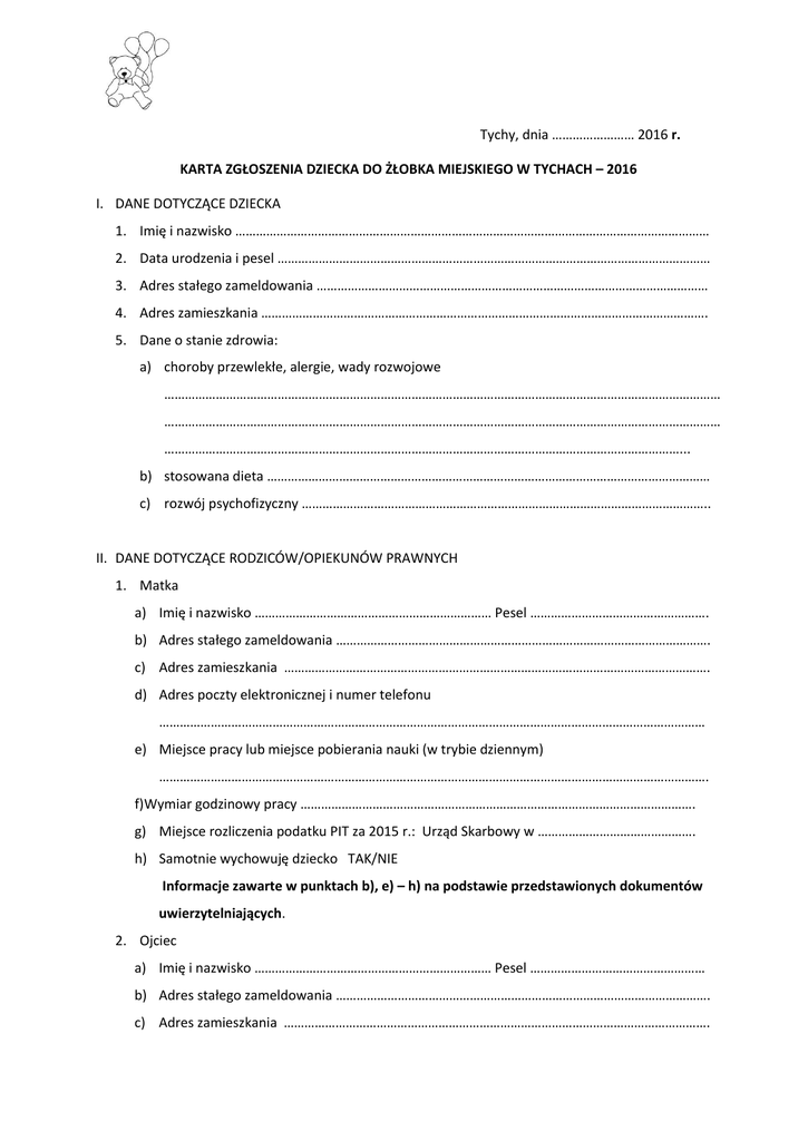 Tychy, dnia …………………… 2016 r. KARTA ZGŁOSZENIA DZIECKA DO ŻŁOBKA MIEJSKIEGO W TYCHACH – 2016 I. DANE DOTYCZĄCE DZIECKA 1. Imię i nazwisko ………………………………………………………………………………………………………………………… 2. Data urodzenia i pesel ……………………………………………………………………………………………………………… 3. Adres stałego zameldowania …………………………………………………………………………………………………… 4. Adres zamieszkania …………………………………………………………………………………………………………………. 5. Dane o stanie zdrowia: a) choroby przewlekłe, alergie, wady rozwojowe ……………………………………………………………………………………………………………………………………………… ……………………………………………………………………………………………………………………………………………… ……………………………………………………………………………………………………………………………………... b) stosowana dieta ………………………………………………………………………………………………………………… c) rozwój psychofizyczny ……………………………………………………………………………………………………….. II. DANE DOTYCZĄCE RODZICÓW/OPIEKUNÓW PRAWNYCH 1. Matka a) Imię i nazwisko …………………………………………………………… Pesel ……………………………………………. b) Adres stałego zameldowania ………………………………………………………………………………………………. c) Adres zamieszkania ……………………………………………………………………………………………………………. d) Adres poczty elektronicznej i numer telefonu …………………………………………………………………………………………………………………………………………… e) Miejsce pracy lub miejsce pobierania nauki (w trybie dziennym) ……………………………………………………………………………………………………………………………………………. f)Wymiar godzinowy pracy ……………………………………………………………………………………………………. g) Miejsce rozliczenia podatku PIT za 2015 r.: Urząd Skarbowy w ………………………………………. h) Samotnie wychowuję dziecko TAK/NIE Informacje zawarte w punktach b), e) – h) na podstawie przedstawionych dokumentów uwierzytelniających. 2. Ojciec a) Imię i nazwisko …………………………………………………………… Pesel …………………………………………… b) Adres stałego zameldowania ………………………………………………………………………………………………. c) Adres zamieszkania ……………………………………………………………………………………………………………. d) Adres poczty elektronicznej i numer telefonu ……………………………………………………………………………………………………………………………………………. e) Miejsce pracy lub miejsce pobierania nauki (w trybie dziennym) …………………………………………………………………………………………………………………………………………… f) Wymiar godzinowy pracy …………………………………………………………………………………………………… g) Miejsce rozliczenia podatku PIT za 2015 r.: Urząd Skarbowy w ………………………………………. h) Samotnie wychowuję dziecko - TAK/NIE Informacje zawarte w punktach b), e) – h) na podstawie przedstawionych dokumentów uwierzytelniających. III. INNE 1. Rodzeństwo aktualnie uczęszczające do Żłobka Miejskiego w Tychach - TAK/NIE 2. Rodzina 3+ - TAK/NIE 3. Niepełnosprawność rodzica/opiekuna/rodzeństwa (orzeczony znaczny lub umiarkowany stopień niepełnosprawności) – TAK/NIE 4. Inne niż wyżej wymienione przypadki ( w szczególności objęcie nadzorem lub świadczeniami z MOPS bądź innej instytucji, posiadanie opinii o konieczności objęcia dziecka opieką żłobkową) …………………………………………………………………………………………………………………………………………… …………………………………………………………………………………………………………………………………………… ……………………………………………………………………………………………………………………………………. Informacje zawarte w punktach 2 - 4 na podstawie przedstawionych dokumentów uwierzytelniających. Oświadczam, że jest mi znana treść Zarządzenia nr 3/2014 Dyrektora Żłobka Miejskiego w Tychach z dnia 25 lutego 2014 r. w sprawie procedury i zasad przyjęć dzieci do ŻM oraz Regulaminu porządkowego placówki. Zgodnie z ustawą o ochronie danych osobowych (Dz.U. z 2002 r. Nr 101, poz.926 z późn. zm.) wyrażam zgodę na przetwarzanie moich danych osobowych na potrzeby Żłobka Miejskiego w Tychach, w szczególności w celu przeprowadzania procesu rekrutacji oraz objęcia dziecka opieką Żłobka. Świadoma/y odpowiedzialności karnej, w tym za wyłudzenie świadczenia (art. 286 kodeksu karnego (Dz.U. z 1977 r. Nr 88, poz. 533 z późn. zm.)) oświadczam, że dane podane przeze mnie powyżej oraz złożone oświadczenia dotyczące spełnienia war