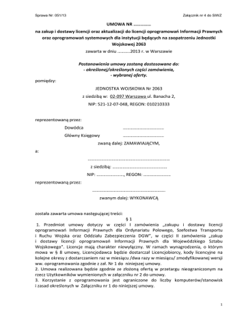Sprawa Nr: 051/13 Załącznik nr 4 do SIWZ UMOWA NR …………… na zakup i dostawy licencji oraz aktualizacji do licencji oprogramowań Informacji Prawnych oraz oprogramowań systemowych dla instytucji będących na zaopatrzeniu Jednostki Wojskowej 2063 zawarta w dniu ………..2013 r. w Warszawie Postanowienia umowy zostaną dostosowane do: - określonej/określonych części zamówienia, - wybranej oferty. pomiędzy: JEDNOSTKA WOJSKOWA Nr 2063 z siedzibą w: 02-097 Warszawa ul. Banacha 2, NIP: 521-12-07-048, REGON: 010210333 reprezentowaną przez: Dowódca ……………………………… Główny Księgowy ……………………………… zwaną dalej: ZAMAWIAJĄCYM, a: ……………………………………………………………… z siedzibą: ………………………………………… NIP: ……………………, REGON: …………………… reprezentowaną przez: ………………………………………………………. zwanym dalej: WYKONAWCĄ została zawarta umowa następującej treści: §1 1. Przedmiot umowy dotyczy w części I zamówienia „zakupu i dostawy licencji oprogramowań Informacji Prawnych dla Ordynariatu Polowego, Szefostwa Transportu i Ruchu Wojska oraz Oddziału Zabezpieczenia DGW”, w części II zamówienia „zakup i dostawy licencji oprogramowań Informacji Prawnych dla Wojewódzkiego Sztabu Wojskowego”. Licencje mają charakter niewyłączny. W ramach wynagrodzenia, o którym mowa w § 8 umowy, Licencjodawca będzie dostarczał Licencjobiorcy, kody licencyjne na kolejne okresy z dostarczaniem raz w miesiącu /dwa razy w miesiącu/ zmodyfikowanej wersji ww. oprogramowania zgodnie z zał. Nr 1 do niniejszej umowy. 2. Umowa realizowana będzie zgodnie ze złożoną ofertą w przetargu nieograniczonym na rzecz Użytkowników wymienionych w załączniku nr 2 do umowy. 3. Korzystanie z oprogramowania jest ograniczone do liczby komputerów/stanowisk i zasad określonych w Załączniku nr 1 do niniejszej umowy. 1 Sprawa Nr: 051/13 Załącznik nr 4 do SIWZ 4. Zleceniobiorca zobowiązany jest do przeprowadzenia szkolenia w zakresie oferowanego systemu w terminie do 3 tygodni od daty dostarczenia przedmiotu zamówienia do poszczególnych Użytkowników. Szkolenie to zostanie zorganizowane w siedzibie Zamawiającego, tj. ul. Banacha 2 w Warszawie. Długość szkolenia nie będzie krótsza niż 2 godziny zegarowe, wykonana zostanie w formie prezentacji multimedialnej. §2 1. Na termin wykonania zamówienia składają się terminy wykonania poszczególnych zamówień, dla poszczególnych instytucji, które ujęto i zapisano oddzielnie dla każdej instytucji, zwanej dalej Użytkownikiem licencji w znaczeniu Licencjobiorca zawiera załącznik Nr 1 do niniejszej umowy. 2. Licencjodawca dostarczać będzie zamówione uaktualnienia oprogramowań z zachowaniem nieprzerwanej możliwości korzystania z nich przez poszczególne instytucje wymienione w załączniku Nr 2 do niniejszej umowy. Licencjodawca udzieli licencji Użytkownikowi na użytkowanie oprogramowania Systemu Informacji Prawnej, dostarczy certyfikaty potwierdzające udzielenie licencji, dostarczy nośniki z oprogramowaniem Systemu Informacji Prawnej na płytach CD/DVD, zainstaluje i uruchomi system w terminie 14 dni od dnia rozpoczęcia umowy. Licencjodawca dostarczy aktualizacje programu na płytach CD/DVD, zwanych dalej „Nośnikami”, do 14 dnia każdego miesiąca kalendarzowego w okresie ograniczonym terminem – oznaczonym jako termin realizacji umowy, dostarczy potrzebne do eksploatacji klucze HASP w terminie 14 dni od dnia rozpoczęcia realizacji umowy. 3. Licencjodawca zobowiązuje się do doręczenia, instalacji i wdrożenia wersji „Programów” u Użytkownika licencji. §3 1. Umowa zostaje zawarta na okres od dnia podpisania umowy do 31 grudnia 2014 r., jej realizacja przebiegać będzie zgodnie harmonogramem z załącznika nr 1 do umowy. 2. Strony uznają za datę podpisania umowy dzień jej podpisania przez Zamawiającego. §4 1. Licencjobiorca może korzystać z praw do oprogramowania poprzez wprowadzenie do pamięci komputera, przechowywanie, wyświetlanie, uruchamianie i używanie zgodnie z przeznaczeniem oprogramowania. 2. Licencjobiorca nie może upoważniać osób trzecich do korzystania z oprogramowania w jakimkolwiek zakresie. Dotyczy to w szczególności nieodpłatnego udostępniania oprogramowania oraz jego nośników, zawierania umów najmu, dzierżawy i innych podobnych umów. Nie uważa się za osoby trzecie osób pozostających z Licencjobiorcą w stosunku pracy lub świadczących pracę na innej podstawie, w tym na podstawie umowy o dzieło, umowy zlecenia lub innej umowy o świadczenie usług, jeżeli osoby te korzystają z oprogramowania zainstalowanego na komputerach, będących we wyłącznym władaniu Licencjobiorcy a oprogramowanie to wykorzystywane jest dla celów lub potrzeb Licencjobiorcy. 3. Licencjobiorca zobowiązuje się, że nie będzie odtwarzał, ani też udzielał pomocy innym osobom w odtwarzaniu kodu źródłowego oprogramowania. Licencjobiorca zobowiązuje się, że nie będzie odkodowywać lub dekompilować, ani też w jakikolwiek inny sposób zmieniać oprogramowania za wyjątkiem przypadków, gdy zezwalają na to bezwzględnie obowiązujące przepisy prawa. §5 1. W przypadku, w którym Licencjodawca wydaje Licencjobiorcy w wykonaniu umowy nośniki lub KOD/Klucz dostępu, Licencjodawca przenosi na Licencjobiorcę własność tych 2 Sprawa Nr: 051/13 Załącznik nr 4 do SIWZ nośników z chwilą ich wydania. Wykaz nośników i KODU/Klucza dostępu oprogramowań, zostanie wskazany w odrębnym zestawieniu sporządzonym przez Licencjodawcę i doręczony Licencjobiorcy. 2. Przeniesienie KODU/Klucz dostępu nie powoduje przeniesienia praw autorskich lub upoważnienia do korzystania z tych praw. Kopiowanie nośników nie jest dopuszczalne, za wyjątkiem przypadków, w których pozwalają na to bezwzględnie obowiązujące pr