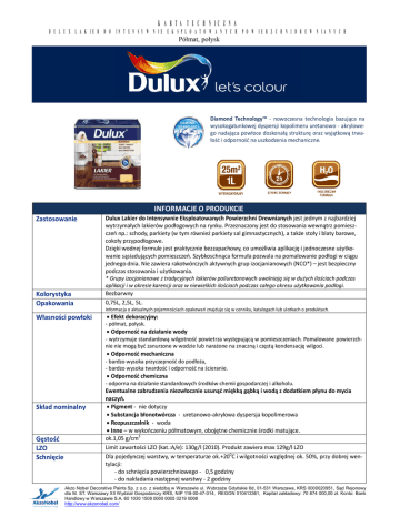 KARTA TECHNICZNA DULUX LAKIER DO INTENSYWNIE EKSPLOATOWANYCH POWIERZCHNI DREWNIANYCH Pó mat, po ysk Diamond Technology™ - nowoczesna technologia bazuj ca na wysokogatunkowej dyspersji kopolimeru uretanowo - akrylowego nadaj ca pow oce doskona struktur oraz wyj tkow trwai odporno na uszkodzenia mechaniczne. INFORMACJE O PRODUKCIE Zastosowanie Dulux Lakier do Intensywnie Eksploatowanych Powierzchni Drewnianych jest jednym z najbardziej wytrzyma ych lakierów pod ogowych na rynku. Przeznaczony jest do stosowania wewn trz pomieszcze np.: schody, parkiety (w tym równie parkiety sal gimnastycznych), a tak e sto y i blaty barowe, coko y przypod ogowe. Dzi ki wodnej formule jest praktycznie bezzapachowy, co umo liwia aplikacj i jednoczesne u ytkowanie s siaduj cych pomieszcze . Szybkoschn ca formu a pozwala na pomalowanie pod ogi w ci gu jednego dnia. Nie zawiera rakotwórczych aktywnych grup izocjanianowych (NCO*) – jest bezpieczny podczas stosowania i u ytkowania. * Grupy izocjanianowe z tradycyjnych lakierów poliuretanowych uwalniaj si w du ych ilo ciach podczas aplikacji i w okresie karencji oraz w niewielkich ilo ciach podczas ca ego okresu u ytkowania pod ogi. Kolorystyka Opakowania asno ci pow oki Bezbarwny 0,75L, 2,5L, 5L. Informacja o aktualnych pojemno ciach opakowa znajduje si w cenniku, katalogach lub ulotkach o produktach. Efekt dekoracyjny: - pó mat, po ysk. Odporno na dzia anie wody - wytrzymuje standardow wilgotno powietrza wyst puj w pomieszczeniach. Pomalowane powierzchnie nie mog by zanurzone w wodzie lub nara one na znaczn i cz st kondensacj wilgoci. Odporno mechaniczna - bardzo wysoka przyczepno do pod a, - bardzo wysoka twardo i odporno na cieranie. Odporno chemiczna - odporna na dzia anie standardowych rodków chemii gospodarczej i alkoholu. Sk ad nominalny sto LZO Schni cie Ewentualne zabrudzenia niezw ocznie usun mi kk g bk i wod z dodatkiem p ynu do mycia naczy . Pigment - nie dotyczy Substancja b onotwórcza - uretanowo-akrylowa dyspersja kopolimerowa Rozpuszczalnik - woda Inne – w wyko czeniu pó matowym, oboj tne chemicznie rodki matuj ce. ok.1,05 g/cm3 Limit zawarto ci LZO (kat.:A/e): 130g/l (2010). Produkt zawiera max 129g/l LZO Dla pojedynczej warstwy, w temperaturze ok.+200C i wilgotno ci wzgl dnej ok. 50%, przy dobrej wentylacji: - do schni cia powierzchniowego - 0,5 godziny - do nak adania nast pnej warstwy - 2 godziny Akzo Nobel Decorative Paints Sp. z o.o. z siedzib w Warszawie ul. Wybrze e Gdy skie 6d, 01-531 Warszawa, KRS 0000020951, S d Rejonowy dla M. ST. Warszawy XII Wydzia Gospodarczy KRS, NIP 118-00-47-014, REGON 010413361, Kapita zak adowy: 70 874 000,00 z . Konto: Bank Handlowy w Warszawie S.A. 60 1030 1508 0000 0005 0219 0008 http://www.akzonobel.com/ KARTA TECHNICZNA DULUX LAKIER DO INTENSYWNIE EKSPLOATOWANYCH POWIERZCHNI DREWNIANYCH Pó mat, po ysk Obni enie temperatury i/lub wzrost wilgotno ci oraz rodzaj i gatunek malowanego drewna mog wyd czas schni cia. Rozcie czalnik Okres wa no ci 2-3 warstwy Do 25m2/l przy jednokrotnym malowaniu na g adkiej, równej i odpowiednio przygotowanej powierzchni pod a. Nie stosuje si . Produkt gotowy do u ycia. Okres przydatno ci: 4 lata od daty produkcji. Certyfikaty Pracujemy zgodnie z systemem zarz dzania jako ci ISO 9001:2008 Przygotowanie wyrobu Dok adnie wymiesza przed stosowaniem, niedopuszczaj c do napowietrzenia produktu, Nie dodawa obcych sk adników. Nie rozcie cza produktu Powierzchnie musz by czyste, suche, zwarte, odt uszczone, adko oszlifowane, pozbawione nalotów organicznych. 1. Najlepsze efekty uzyskasz: • usuwaj c ca kowicie (najlepiej poprzez cyklinowanie lub zeszlifowanie) stare, zniszczone pow oki lakiernicze; • za ywiczone miejsca, t uszcz, substancje oleiste oraz preparaty woskowe – usuwaj c benzyn lako, natomiast brud i kurz – myj c wod z dodatkiem rodka myj cego; • naloty organiczne – usuwaj c i kolejno zabezpieczaj c odpowiednim rodkiem grzybobójczym; • p kni cia i ubytki w drewnie – wype niaj c mas szpachlow do drewna. 2. Gruntowanie pod a: • Surowe powierzchnie drewna (np. wcze niej nielakierowane, po cyklinowaniu): - nale y zagruntowa jedn warstw Dulux Lakier do Intensywnie Eksploatowanych Powierzchni Drewnianych o wyko czeniu po yskowym, poprzez mocne i dok adne wtarcie lakieru w drewno, • Pod a wcze niej pokryte lakierem tego samego rodzaju: - oczy ci z zanieczyszcze i zmatowi papierem ciernym, odpyli , - przetestowa : wykonuj c próbne wymalowanie. Je eli po wyschni ciu lakieru powstanie niepo dany efekt nale y stare pow oki usun ca kowicie i na nowo przygotowa pod e do malowania. Warunki lakierowania: Ilo warstw Wydajno Dane identyfikuj ce wyrób oraz termin up ywu wa no ci wyrobu podawany jest na opakowaniu jednostkowym. STOSOWANIE PRODUKTU Przygotowanie poda Lakierowanie temperatura otoczenia i lakierowanej powierzchni powinna by pomi dzy +100C a +280C wilgotno wzgl dna powietrza powinna by ni sza ni 80% wilgotno lakierowanego drewna nie powinna przekracza 9%. Warunki lakierowania decyduj o czasie schni cia warstwy wyrobu i w ciwo ciach uzyskanej pow oki. Zalecane metody lakierowania: dzle: najlepszy efekt uzyskasz stosuj c p dzle o mi kkim, naturalnym w osiu. Wa ki: najlepszy efekt uzyskasz stosuj c wa ki o d ugo ci runa 2 – 10 mm Parametry lakierowania nawierzchniowego (ostatecznego): rozprowadzaj cienkimi warstwami, równomiernie (najlepiej) wzd s ojów drewna, uwa aj c aby nie dopu ci do wyschni cia kraw dzi nak adanej warstwy przed zako czeniem lakierowania (zachowanie tzw. ci ci prac malarskich), przed na eniem kolejnej warstwy poprzedni , po jej wyschni ciu (najwcze niej po 2 godzinach) nale y delikatnie przeszlifowa drobnoziarnistym papierem ciernym, nak adaj 2 lub 3 warstwy lakieru, w odst pie, co najmniej 2 godzin od naniesienia poprzedniej warstwy, pomalowane powierzchnie mog by oddane do eksploatacji po ca kowitym wyschni ciu pow oki oraz po zaniku zapachu wyrobu tj. najwcze niej po 5-7 dniach. Uwaga! Nie u ywaj lakieru na powierzchni