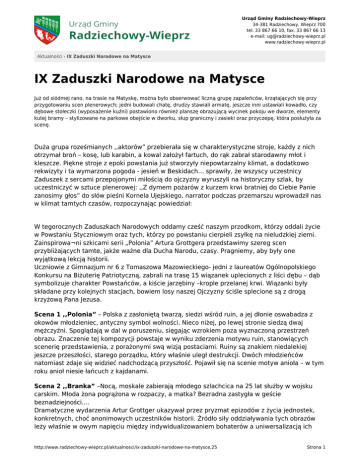 Urząd Gminy Radziechowy-Wieprz 34-381 Radziechowy, Wieprz 700 tel. 33 867 66 10, fax. 33 867 66 13 e-mail: [email protected] www.radziechowy-wieprz.pl Aktualności › IX Zaduszki Narodowe na Matysce IX Zaduszki Narodowe na Matysce Już od siódmej rano, na trasie na Matyskę, można było obserwować liczną grupę zapaleńców, krzątających się przy przygotowaniu scen plenerowych; jedni budowali chatę, drudzy stawiali armatę, jeszcze inni ustawiali kowadło, czy dębowe stołeczki (wyposażenie kuźni) postawiono również planszę obrazującą wycinek pokoju we dworze, elementy kutej bramy – stylizowane na parkowe obejście w dworku, słup graniczny i zasieki oraz przyczepę, która posłużyła za scenę. Duża grupa roześmianych ,,aktorów” przebierała się w charakterystyczne stroje, każdy z nich otrzymał broń – kosę, lub karabin, a kowal założył fartuch, do rąk zabrał starodawny młot i kleszcze. Piękne stroje z epoki powstania już stworzyły niepowtarzalny klimat, a dodatkowo rekwizyty i ta wymarzona pogoda - jesień w Beskidach… sprawiły, że wszyscy uczestnicy Zaduszek z sercami przepojonymi miłością do ojczyzny wyruszyli na historyczny szlak, by uczestniczyć w sztuce plenerowej: ,,Z dymem pożarów z kurzem krwi bratniej do Ciebie Panie zanosimy głos” do słów pieśni Kornela Ujejskiego, narrator podczas przemarszu wprowadził nas w klimat tamtych czasów, rozpoczynając powiedział: W tegorocznych Zaduszkach Narodowych oddamy cześć naszym przodkom, którzy oddali życie w Powstaniu Styczniowym oraz tych, którzy po powstaniu cierpieli zsyłkę na nieludzkiej ziemi. Zainspirowa¬ni szkicami serii „Polonia” Artura Grottgera przedstawimy szereg scen przybliżających tamte, jakże ważne dla Ducha Narodu, czasy. Pragniemy, aby były one wyjątkową lekcją historii. Uczniowie z Gimnazjum nr 6 z Tomaszowa Mazowieckiego- jedni z laureatów Ogólnopolskiego Konkursu na Biżuterię Patriotyczną, zabrali na trasę 15 wiązanek uplecionych z liści dębu – dąb symbolizuje charakter Powstańców, a kiście jarzębiny –krople przelanej krwi. Wiązanki były składane przy kolejnych stacjach, bowiem losy naszej Ojczyzny ściśle splecione są z drogą krzyżową Pana Jezusa. Scena 1 ,,Polonia” – Polska z zasłoniętą twarzą, siedzi wśród ruin, a jej dłonie oswabadza z okowów młodzieniec, antyczny symbol wolności. Nieco niżej, po lewej stronie siedzą dwaj mężczyźni. Spoglądają w dal w poruszeniu, sięgając wzrokiem poza wyznaczoną przestrzeń obrazu. Znaczenie tej kompozycji powstaje w wyniku zderzenia motywu ruin, stanowiących scenerię przedstawienia, z porażonymi swą wizją postaciami. Ruiny są znakiem niedalekiej jeszcze przeszłości, starego porządku, który właśnie uległ destrukcji. Dwóch młodzieńców natomiast zdaje się widzieć nadchodzącą przyszłość. Pojawił się na scenie motyw anioła – w tym roku anioł niesie łańcuch z kajdanami. Scena 2 ,,Branka” –Nocą, moskale zabierają młodego szlachcica na 25 lat służby w wojsku carskim. Młoda żona pogrążona w rozpaczy, a matka? Bezradna zastygła w geście beznadziejności…. Dramatyczne wydarzenia Artur Grottger ukazywał przez pryzmat epizodów z życia jednostek, konkretnych, choć anonimowych uczestników historii. Źródło siły oddziaływania tych obrazów leży właśnie w owym napięciu między indywidualizowaniem bohaterów a uniwersalizacją ich http://www.radziechowy-wieprz.pl/aktualnosci/ix-zaduszki-narodowe-na-matysce,25 Strona 1 Urząd Gminy Radziechowy-Wieprz 34-381 Radziechowy, Wieprz 700 tel. 33 867 66 10, fax. 33 867 66 13 e-mail: [email protected] www.radziechowy-wieprz.pl Aktualności › IX Zaduszki Narodowe na Matysce doświadczeń i przeżyć. Koncentracja na jednostce, jej emocjonalnej i psychologicznej charakterystyce, umożliwiała odbiorcy identyfikację z przedstawianą sceną, a przez to z historią. Nie bez znaczenia była też realistyczna konwencja prac Grottgera, która ułatwiała szybkie odczytanie ich treści i pozwalała skupić się na odkrywaniu ich możliwych znaczeń. Historie przedstawiane na obrazach są czytelne i łatwo zrozumiałe dzięki wyrazistym gestom i pozom postaci, sugestywnej mimice ich twarzy. Scena 3 ,,Kucie kos” w kuźni Powstańcy nocą przygotowują broń, tylko nieliczni mieli pistolety, lub karabiny. W większości jedyną bronią była kosa ustawiona na sztorc… lub siekiera. W powstaniu osiągnięcie poważniejszych sukcesów było niemożliwe wobec wyraźnej przewagi oddziałów rosyjskich. W Królestwie Polskim stacjonowała stutysięczna armia rosyjska, przeciw niej w nocy z 22 na 23 stycznia wystąpiło tylko 6 tys. powstańców. Garnizony rosyjskie zaatakowano w 33 miejscach. W części miejscowości (np. w Płocku) atak powstańców w ogóle się nie powiódł, w innych miejscach - zwłaszcza na Podlasiu - udało się rozbroić kilka garnizonów. Wybuch powstania zaalarmował jednak dowództwo rosyjskie, które zarządziło koncentrację wojsk w większych miastach. Liczba miejsc, w których stacjonowali Rosjanie, zmniejszyła się 3 razy. Było to korzystne dla powstańców, którzy zyskali większą swobodę ruchów na prowincji oraz swobodny dostęp do granic królestwa. Scena 4 ,,Pożegnanie Powstańca”, szlachcianka w żałobnej sukni żegna szlachcica idącego do powstania. Scena 5 ,,Bitwa” scena batalistyczna, Powstańcy walczą z przeważającą siłą wojsk rosyjskich pod Ciołkowem. Oddział powstańców pod dowództwem Aleksandra Rogalińskiego kierujący się z Warszawy w stronę Płocka starł się pod wsią Ciołkowo (obecnie Ciółkowo) z kompanią rosyjskiego pułku muromskiego, którą dowodził płk Kozlaninow. W ataku kosynierów zginęli rosyjscy piechurzy i Kozlaninow. Rekonstruktorzy bardzo realistycznie przedstawili to wydarzenie. Moskale wprawdzie spalili chatę, ale i tak był to ich pierwszy i ostatni bój. Scena 6 ,,Na pobojowisku