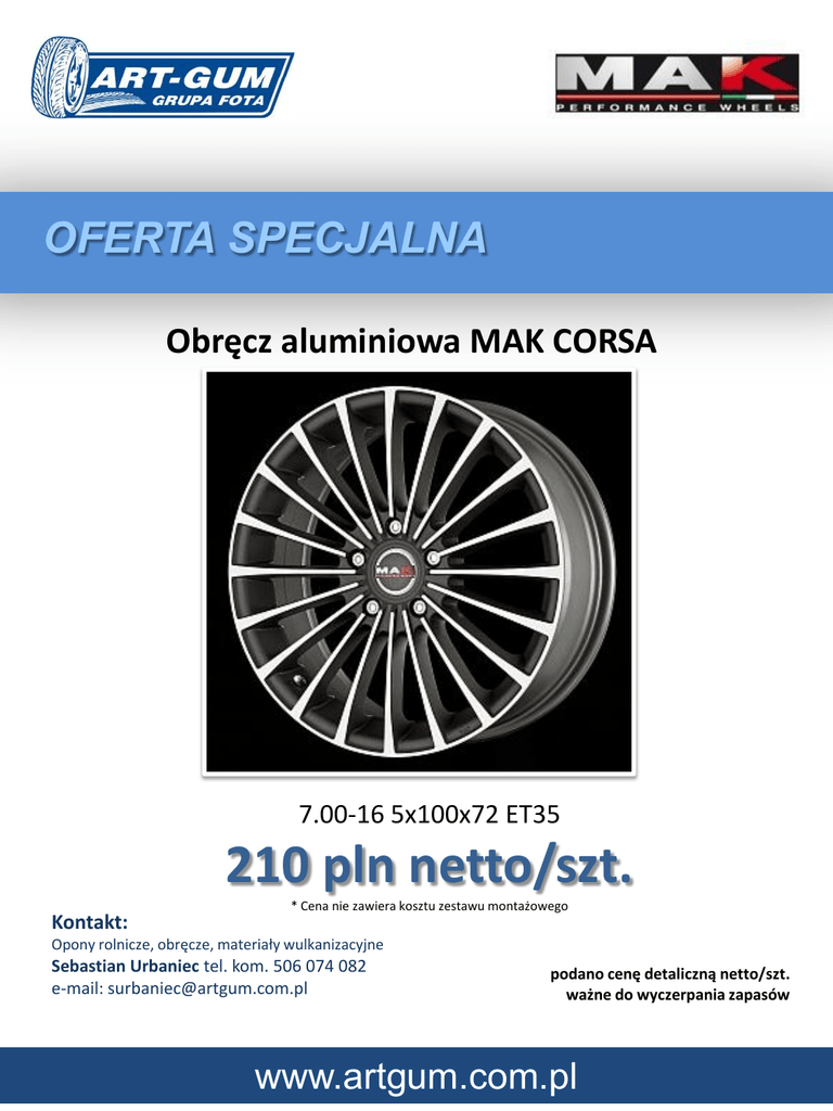 OFERTA SPECJALNA Obręcz aluminiowa MAK CORSA 7.00-16 5x100x72 ET35 210 pln netto/szt. Kontakt: * Cena nie zawiera kosztu zestawu montażowego Opony rolnicze, obręcze, materiały wulkanizacyjne Sebastian Urbaniec tel. kom. 506 074 082 e-mail: [email protected] podano cenę detaliczną netto/szt. ważne do wyczerpania zapasów www.artgum.com.pl