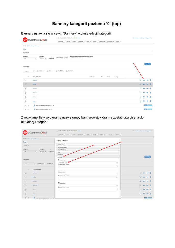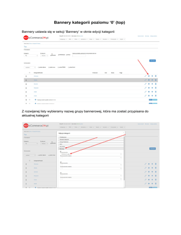 Bannery kategorii poziomu ‘0’ (top) Bannery ustawia się w sekcji ‘Bannery’ w oknie edycji kategorii Z rozwijanej listy wybieramy nazwę grupy bannerowej, która ma zostać przypisana do aktualnej kategorii Istniejące grupy bannerowe można przeglądać na stronie ‘Zarządzanie bannerami’ Po wejściu w edycję danej grupy możemy dodawać nowe bannery oraz układać je w narzędziu flowTool (w sposób analogiczny jak wszystkie inne w systemie). Jednak dla bannerów kategorii ‘0’ zaleca się, aby był to jeden wiersz z dwiema kolumnami. Aby edytować konkretny banner, należy kliknąć w niego na liście, a następnie w przycisk ‘Edytuj’ po prawej stronie. W oknie edycji bannera możemy zmieniać jego nazwę, adres URL, oraz krótki tekst który wyświetla się pod nazwą. Ten krótki tekst wpisujemy po prostu w pole ‘Kod HTML’. Następnie klikamy ‘Zapisz’, czyścimy cache sklepu (Narzędzia > Pamięć podręczna) i zmiany powinny być widoczne. Jeśli mamy potrzebę stworzyć nową grupę bannerów, klikamy w przycisk “Dodaj grupę bannerów” na głównej stronie zarządzania bannerami. Po prawej stronie pojawi się wtedy okno z prośbą o wpisanie nazwy warto unikać polskich znaków oraz spacji, oraz trzymać się konwencji poprzez dodawanie postfixu _PL_large.