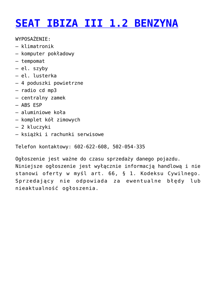 SEAT IBIZA III 1.2 BENZYNA WYPOSAŻENIE: – klimatronik – komputer pokładowy – tempomat – el. szyby – el. lusterka – 4 poduszki powietrzne – radio cd mp3 – centralny zamek – ABS ESP – – – – aluminiowe koła komplet kół zimowych 2 kluczyki książki i rachunki serwisowe Telefon kontaktowy: 602-622-608, 502-054-335 Ogłoszenie jest ważne do czasu sprzedaży danego pojazdu. Niniejsze ogłoszenie jest wyłącznie informacją handlową i nie stanowi oferty w myśl art. 66, § 1. Kodeksu Cywilnego. Sprzedający nie odpowiada za ewentualne błędy lub nieaktualność ogłoszenia.