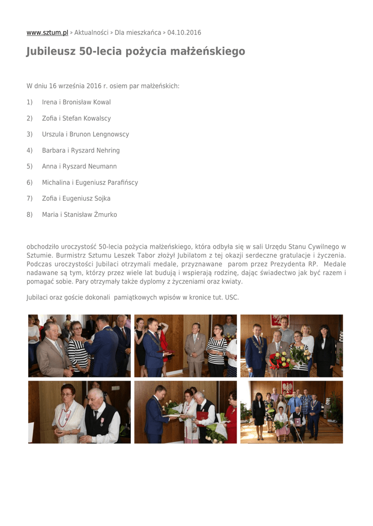 www.sztum.pl Aktualności Dla mieszkańca 04.10.2016 Jubileusz 50-lecia pożycia małżeńskiego W dniu 16 września 2016 r. osiem par małżeńskich: 1) Irena i Bronisław Kowal 2) Zofia i Stefan Kowalscy 3) Urszula i Brunon Lengnowscy 4) Barbara i Ryszard Nehring 5) Anna i Ryszard Neumann 6) Michalina i Eugeniusz Parafińscy 7) Zofia i Eugeniusz Sojka 8) Maria i Stanisław Żmurko obchodziło uroczystość 50-lecia pożycia małżeńskiego, która odbyła się w sali Urzędu Stanu Cywilnego w Sztumie. Burmistrz Sztumu Leszek Tabor złożył Jubilatom z tej okazji serdeczne gratulacje i życzenia. Podczas uroczystości Jubilaci otrzymali medale, przyznawane parom przez Prezydenta RP. Medale nadawane są tym, którzy przez wiele lat budują i wspierają rodzinę, dając świadectwo jak być razem i pomagać sobie. Pary otrzymały także dyplomy z życzeniami oraz kwiaty. Jubilaci oraz goście dokonali pamiątkowych wpisów w kronice tut. USC.