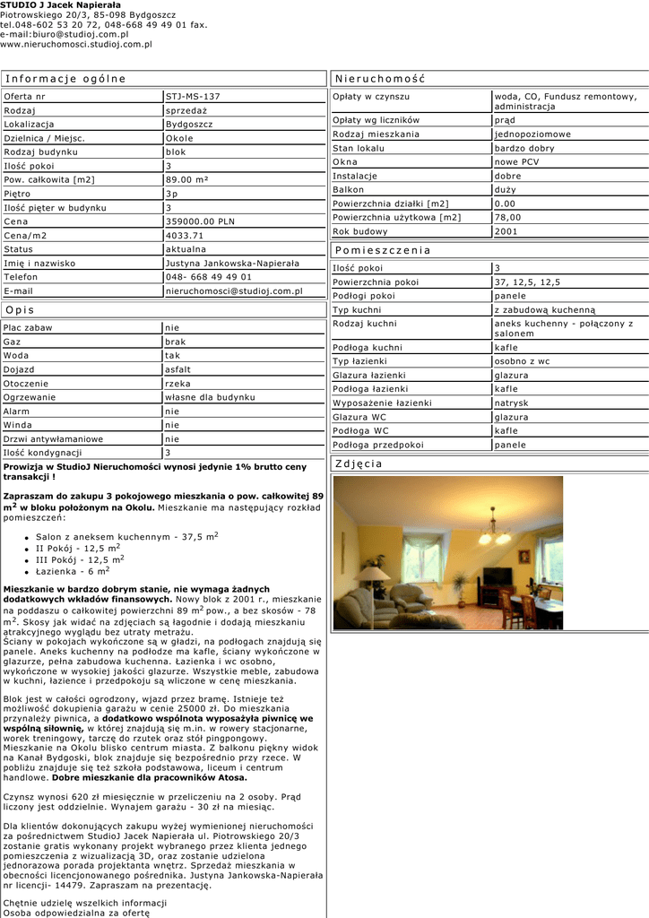 STUDIO J Jacek Napierała Piotrowskiego 20/3, 85-098 Bydgoszcz tel.048-602 53 20 72, 048-668 49 49 01 fax. e-mail:[email protected] www.nieruchomosci.studioj.com.pl Informacje ogólne Nieruchomość Oferta nr STJ-MS-137 Opłaty w czynszu woda, CO, Fundusz remontowy, administracja Rodzaj sprzedaż Lokalizacja Bydgoszcz Opłaty wg liczników prąd Okole Rodzaj mieszkania jednopoziomowe blok Stan lokalu bardzo dobry Ilość pokoi 3 Okna nowe PCV Pow. całkowita [m2] 89.00 m² Instalacje dobre 3p Balkon duży 3 Powierzchnia działki [m2] 0.00 359000.00 PLN Powierzchnia użytkowa [m2] 78,00 Cena/m2 4033.71 Rok budowy 2001 Status aktualna Pomieszczenia Imię i nazwisko Justyna Jankowska-Napierała Telefon 048- 668 49 49 01 E-mail [email protected] Dzielnica / Miejsc. Rodzaj budynku Piętro Ilość pięter w budynku Cena Opis Plac zabaw nie Gaz brak Woda tak Dojazd asfalt Otoczenie rzeka Ogrzewanie własne dla budynku Alarm nie Winda nie Drzwi antywłamaniowe nie Ilość kondygnacji 3 Prowizja w StudioJ Nieruchomości wynosi jedynie 1% brutto ceny transakcji ! Zapraszam do zakupu 3 pokojowego mieszkania o pow. całkowitej 89 m 2 w bloku położonym na Okolu. Mieszkanie ma następujący rozkład pomieszczeń: Salon z aneksem kuchennym - 37,5 m2 II Pokój - 12,5 m2 III Pokój - 12,5 m2 Łazienka - 6 m2 Mieszkanie w bardzo dobrym stanie, nie wymaga żadnych dodatkowych wkładów finansowych. Nowy blok z 2001 r., mieszkanie na poddaszu o całkowitej powierzchni 89 m2 pow., a bez skosów - 78 m 2. Skosy jak widać na zdjęciach są łagodnie i dodają mieszkaniu atrakcyjnego wyglądu bez utraty metrażu. Ściany w pokojach wykończone są w gładzi, na podłogach znajdują się panele. Aneks kuchenny na podłodze ma kafle, ściany wykończone w glazurze, pełna zabudowa kuchenna. Łazienka i wc osobno, wykończone w wysokiej jakości glazurze. Wszystkie meble, zabudowa w kuchni, łazience i przedpokoju są wliczone w cenę mieszkania. Blok jest w całości ogrodzony, wjazd przez bramę. Istnieje też możliwość dokupienia garażu w cenie 25000 zł. Do mieszkania przynależy piwnica, a dodatkowo wspólnota wyposażyła piwnicę we wspólną siłownię, w której znajdują się m.in. w rowery stacjonarne, worek treningowy, tarczę do rzutek oraz stół pingpongowy. Mieszkanie na Okolu blisko centrum miasta. Z balkonu piękny widok na Kanał Bydgoski, blok znajduje się bezpośrednio przy rzece. W pobliżu znajduje się też szkoła podstawowa, liceum i centrum handlowe. Dobre mieszkanie dla pracowników Atosa. Czynsz wynosi 620 zł miesięcznie w przeliczeniu na 2 osoby. Prąd liczony jest oddzielnie. Wynajem garażu - 30 zł na miesiąc. Dla klientów dokonujących zakupu wyżej wymienionej nieruchomości za pośrednictwem StudioJ Jacek Napierała ul. Piotrowskiego 20/3 zostanie gratis wykonany projekt wybranego przez klienta jednego pomieszczenia z wizualizacją 3D, oraz zostanie udzielona jednorazowa porada projektanta wnętrz. Sprzedaż mieszkania w obecności licencjonowanego pośrednika. Justyna Jankowska-Napierała nr licencji- 14479. Zapraszam na prezentację. Chętnie udzielę wszelkich informacji Osoba odpowiedzialna za ofertę Ilość pokoi 3 Powierzchnia pokoi 37, 12,5, 12,5 Podłogi pokoi panele Typ kuchni z zabudową kuchenną Rodzaj kuchni aneks kuchenny - połączony z salonem Podłoga kuchni kafle Typ łazienki osobno z wc Glazura łazienki glazura Podłoga łazienki kafle Wyposażenie łazienki natrysk Glazura WC glazura Podłoga WC kafle Podłoga przedpokoi panele Zdjęcia Doradca ds. rynku nieruchomości Justyna Napierała tel. 668494901 Powyższy opis ma charakter informacyjny i nie stanowi oferty w rozumieniu Kodeksu cywilnego. © Wszelkie prawa zastrzeżone - STUDIO J Jacek Napierała