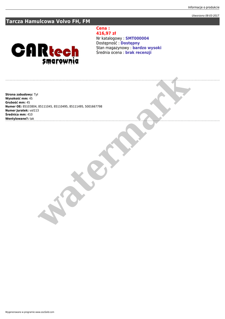 Informacje o produkcie Utworzono 08-03-2017 Tarcza Hamulcowa Volvo FH, FM Cena : 416,97 zł er m ar k Nr katalogowy : SMT000004 Dostępność : Dostępny Stan magazynowy : bardzo wysoki Średnia ocena : brak recenzji w at Strona zabudowy: Tył Wysokość mm: 45 Grubość mm: 45 Numer OE: 85103804, 85111045, 85110495, 85111495, 5001667798 Numer Juratek: vol113 Średnica mm: 410 Wentylowane?: tak Wygenerowano w programie www.oscGold.com