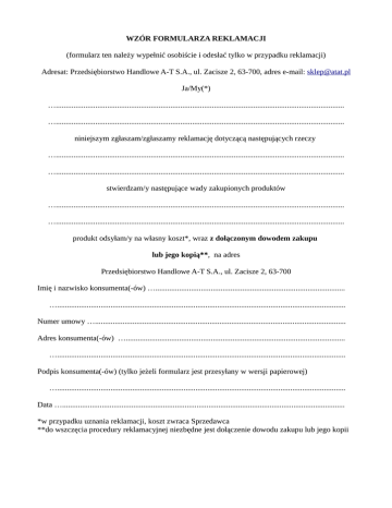 WZÓR FORMULARZA REKLAMACJI (formularz ten należy wypełnić osobiście i odesłać tylko w przypadku reklamacji) Adresat: Przedsiębiorstwo Handlowe A-T S.A., ul. Zacisze 2, 63-700, adres e-mail: [email protected] Ja/My(*) ….................................................................................................................................................. ….................................................................................................................................................. niniejszym zgłaszam/zgłaszamy reklamację dotyczącą następujących rzeczy ….................................................................................................................................................. ….................................................................................................................................................. stwierdzam/y następujące wady zakupionych produktów ….................................................................................................................................................. ….................................................................................................................................................. produkt odsyłam/y na własny koszt*, wraz z dołączonym dowodem zakupu lub jego kopią**, na adres Przedsiębiorstwo Handlowe A-T S.A., ul. Zacisze 2, 63-700 Imię i nazwisko konsumenta(-ów) …................................................................................................ ….................................................................................................................................................. Numer umowy …............................................................................................................................... Adres konsumenta(-ów) …............................................................................................................... ….................................................................................................................................................. Podpis konsumenta(-ów) (tylko jeżeli formularz jest przesyłany w wersji papierowej) ….................................................................................................................................................. Data …............................................................................................................................................... *w przypadku uznania reklamacji, koszt zwraca Sprzedawca **do wszczęcia procedury reklamacyjnej niezbędne jest dołączenie dowodu zakupu lub jego kopii
