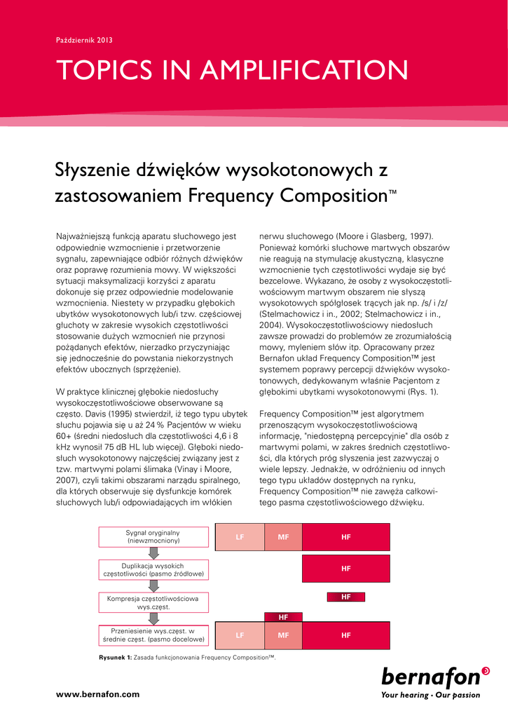 Październik 2013 TOPICS IN AMPLIFICATION Słyszenie dźwięków wysokotonowych z zastosowaniem Frequency Composition™ Najważniejszą funkcją aparatu słuchowego jest odpowiednie wzmocnienie i przetworzenie sygnału, zapewniające odbiór różnych dźwięków oraz poprawę rozumienia mowy. W większości sytuacji maksymalizacji korzyści z aparatu dokonuje się przez odpowiednie modelowanie wzmocnienia. Niestety w przypadku głębokich ubytków wysokotonowych lub/i tzw. częściowej głuchoty w zakresie wysokich częstotliwości stosowanie dużych wzmocnień nie przynosi pożądanych efektów, nierzadko przyczyniając się jednocześnie do powstania niekorzystnych efektów ubocznych (sprzężenie). W praktyce klinicznej głębokie niedosłuchy wysokoczęstotliwościowe obserwowane są często. Davis (1995) stwierdził, iż tego typu ubytek słuchu pojawia się u aż 24 % Pacjentów w wieku 60+ (średni niedosłuch dla częstotliwości 4,6 i 8 kHz wynosił 75 dB HL lub więcej). Głęboki niedosłuch wysokotonowy najczęściej związany jest z tzw. martwymi polami ślimaka (Vinay i Moore, 2007), czyli takimi obszarami narządu spiralnego, dla których obserwuje się dysfunkcje komórek słuchowych lub/i odpowiadających im włókien Sygnał oryginalny (niewzmocniony) nerwu słuchowego (Moore i Glasberg, 1997). Ponieważ komórki słuchowe martwych obszarów nie reagują na stymulację akustyczną, klasyczne wzmocnienie tych częstotliwości wydaje się być bezcelowe. Wykazano, że osoby z wysokoczęstotliwościowym martwym obszarem nie słyszą wysokotowych spółgłosek trących jak np. /s/ i /z/ (Stelmachowicz i in., 2002; Stelmachowicz i in., 2004). Wysokoczęstotliwościowy niedosłuch zawsze prowadzi do problemów ze zrozumiałością mowy, myleniem słów itp. Opracowany przez Bernafon układ Frequency Composition™ jest systemem poprawy percepcji dźwięków wysokotonowych, dedykowanym właśnie Pacjentom z głębokimi ubytkami wysokotonowymi (Rys. 1). Frequency Composition™ jest algorytmem przenoszącym wysokoczęstotliwościową informację, "niedostępną percepcyjnie" dla osób z martwymi polami, w zakres średnich częstotliwości, dla których próg słyszenia jest zazwyczaj o wiele lepszy. Jednakże, w odróżnieniu od innych tego typu układów dostępnych na rynku, Frequency Composition™ nie zawęża całkowitego pasma częstotliwościowego dźwięku. LF MF HF Duplikacja wysokich częstotliwości (pasmo źródłowe) HF Kompresja częstotliwościowa wys.częst. HF HF Przeniesienie wys.częst. w średnie częst. (pasmo docelowe) LF Rysunek 1: Zasada funkcjonowania Frequency Composition™. www.bernafon.com MF HF 30 Średnie wzmocnienie funkcjonalne dla Frequency CompositionTM Średnie wzmocnienie funkcjonalne bez Frequnecy CompositionTM Wzmocnienie funkcjonalne [dB] 25 20 15 10 5 0 1000 1500 2000 3000 4000 6000 8000 Częstotliwość [Hz] Rysunek 2: Porównanie wzmocnienia funkcjonalnego otrzymanego w pomiarze z włączonym i wyłączonym Frequency Composition™. Dzięki temu, Frequency CompositionTM zwiększa znacznie rozumienie mowy, minimalizując jednocześnie niepożądane zniekształcenia sygnału. Poprawa percepcji dźwięków wysokoczęstotliwościowych Korzyści wynikające ze stosowania Frequency Composition™ przeanalizowano wykorzystując pomiar tzw. funkcjonalnego wzmocnienia. W odróżnieniu od typowo “obiektywnego” REM (real ear measurements – akustyka ucha rzeczywistego), pomiar wzmocnienia funkcjonalnego ma charakter o wiele bardziej “subiektywny” oraz lepiej charakteryzuje percepcję dźwięku przez Klienta. Procedura określenia wzmocnienia funkcjonalnego bazuje na pomiarze progów słyszenia w polu swobodnym. W ogólności można przyjąć, iż wzmocnienie funkcjonalne jest różnicą progów detekcji wyznaczonych z aparatem i bez aparatu. Im większe wzmocnienie funkcjonalne, tym większa korzyść z aparatu słuchowego. W niniejszym przypadku wzmocnienie funkcjonalne oznaczało różnicę progów detekcji z włączonym i wyłączonym Frequency Composition™. Rys. 2 przedstawia uśrednione krzywe wzmocnienia funkcjonalnego otrzymane dla grupy 15 Użytkowników aparatów słuchowych. Wypełnione oraz niewypełnione symbole przedstawiają - odpowiednio - dane otrzymane dla włączonego i BERNAFON wyłączonego układu Frequency Composition™. W przypadku najwyższych częstotliwości wzmocnienie funkcjonalne otrzymane dla Frequency Composition™ jest większe. Dla niskich częstotliwości (czyli w paśmie, na które nie ma wpływu Frequnecy Composition™) nie stwierdzono statystycznie istotnych różnic pomiędzy wartościami wzmocnienia funkcjonalnego. Jakość i barwa dźwięku Przesunięcie składowych wysokotonowych w pasmo średnich częstotliwości zmienia znacznie strukturę widmową sygnału. W ogólnym przypadku modyfikacja tego typu powinna wpłynąć na percypowaną barwę dźwięku. Frequency Composition™ zaprojektowano w ten sposób, iż wprowadzane zniekształcenia sygnału są zaniedbywalnie małe. Pasmo docelowe zostało ograniczone “oddolnie” tak, że informacja wysokotonowa nie może być przeniesiona w zakres poniżej 1,5 kHz. Dzięki temu uniknięto zniekształceń struktury formantowej mowy, bardzo istotnej dla rozpoznawania głosek (Dillion, 2012). Wysokoczęstotliwościowa informacja jest dodawana do pasma średnich częstotliwości, lecz nie niższych niż 1,5 kHz. Ponadto, oryginalna informacja wysokoczęstotliwościowa nie jest usuwana z sygnału, tak więc pasmo dźwięku przetworzonego Frequency Composition™ nie zostaje zawężone, czego dowodzi analiza tzw. spektrogramów różnicowych. TOPICS IN AMPLIFICATION Spektrogram różnicowy wyznacza się w oparciu o dwa “standardowe” spektrogramy obrazujące czasowe zmiany widma dźwięku. Spektrogram różnicowy przedstawia różnicę spektrogramów określonych w tym samym przedziale czasu, przy czym w omawianym przypadku każdy z nich zawierał