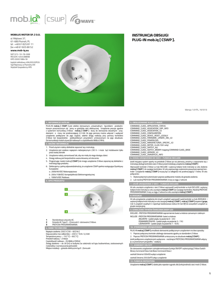 INSTRUKCJA OBSŁUGI PLUG-IN mob.iq [ CSWP ]. MOBILUS MOTOR SP. Z O.O. ul. Miętowa 37, 61-680 Poznań, PL tel. +48 61 825 81 11 fax +48 61 825 80 52 www.mob-iq.eu NIP 972-10-78-008 REGON 634538898 KRS 0000188418 kapitał zakładowy 496,000.00PLN Sąd Rejonowy w Poznaniu XXI Wydział Gospodarczy KRS Wersja 1.01PL, 161013 1. INFORMACJE OGÓLNE 5. OBSŁUGIWANE KLASY Z-WAVE PLUG-IN mob.iq [ CSWP ] jest zdalnie sterowanym, uniwersalnym łącznikiem przekaźnikowym przeznaczonym do pracy w gnieździe sieci elektrycznej. Urządzenie pracuje zgodnie z systemem komunikacj Z-Wave. mob.iq [ CSWP ] służy do sterowania dowolnymi urządzeniami o mocy nie przekraczającej 2,3 kW. Za jego pomocą można włączać i wyłączać urządzenia podłączone do jego wyjścia, zdalnie drogą radiową przy pomocy kontrolera Z-Wave lub bezpośrednio podświetlanym przyciskiem umieszczonym na jego obudowie. Do komunikacji moduł używa fal radiowych o częstotliwości 868,42 MHz. COMMAND_CLASS_APPLICATION_STATUS COMMAND_CLASS_ASSOCIATION_GRP_INFO COMMAND_CLASS_ASSOCIATION_V2 COMMAND_CLASS_CONFIGURATION COMMAND_CLASS_DEVICE_RESET_LOCALLY COMMAND_CLASS_FIRMWARE_UPDATE_MD_V2 COMMAND_CLASS_POWERLEVEL COMMAND_CLASS_MANUFACTURER_SPECIFIC_V2 COMMAND_CLASS_METER_V4 (ZL7261 only) COMMAND_CLASS_SWITCH_ALL COMMAND_CLASS_SWITCH_BINARY mapping COMMAND-CLASS_BASIC COMMAND_CLASS_VERSION_V2 COMMAND_CLASS_ZWAVEPLUS_INFO 2. WAŻNE INFORMACJE 1. Przed użyciem należy dokładnie zapoznać się z instrukcją. 2. Urządzenie jest zasilane napięciem niebezpiecznym 230 V~ i może być instalowane tylko przez osoby dorosłe 3. Urządzenie należy zamontować tak, aby nie miały do niego dostępu dzieci. 4. Zasięg radiowy jest bezpośrednio uwarunkowany od otoczenia. 5. Programując moduł mob.iq [ CSWP ] do innego urządzenia Z-Wave zapoznaj się dokładnie z instrukcją tego produktu. 6. Deklarujemy z pełną odpowiedzialnością, że urządzenie CSWP spełnia następujące Dyrektywy Europejskie: a. 2006/95/EEC Niskonapięciowa b. 2004/108/EEC Kompatybilności Elektromagnetycznej c. 1999/5/EEC Radiowa. 3. OPIS PRODUKTU 6. DODAJ URZĄDZENIE DO SIECI - FUNKCJA INCLUDE Jeżeli inicjujesz system oparty na protokole Z-Wave po raz pierwszy, prosimy o zapoznanie się z instrukcją obsługi kontrolera sieci Z-Wave przed instalacją urządzenia mob.iq [ CSWP ] Wprowadź kontroler Z-Wave w tryb INCLUDE i wykonuj kolejne kroki instrukcji w celu dodania mob.iq [ CSWP ] do swojego kontrolera. W celu poprawnego wykonania powyższej operacji kontroler i urządzenie mob.iq [ CSWP ] muszą być w odległości nie przekraczającej 1 metra. W celu połączenia : 1. Wykorzystaj tryb autoinclusion poprzez podłączenie modułu do gniazda zasilania. 2. Lub naciśnij PRZYCISK PROGRAMOWANIA 3 razy w ciągu 2 sekund. 7. USUŃ URZĄDZENIE Z SIECI - FUNKCJA EXCLUDE 1 2 W celu usunięcia urządzenia z sieci Z-Wave wprowadź swój kontroler w tryb EXCLUDE i wykonuj kolejne kroki instrukcji w celu usunięcia mob.iq [ CSWP ] ze swojego kontrolera. Naciśnij PRZYCISK PROGRAMOWANIA 3 razy w ciągu 2 sekund w celu usunięcia mob.iq [ CSWP ]. 8. ASOCJACJE W celu przypisania urządzenia do innych urządzeń wprowadź swój kontroler w tryb ASOCJACJI i wykonuj kolejne kroki instrukcji w celu asocjacji mob.iq [ CSWP ] . mob.iq [ CSWP ] wspiera I grupę ( do 5 urządzeń zwykłych ) i raportuje każdorazowo status On lub Off do wszystkich urządzeń w grupie asocjacyjnej. 3 1 2 3 Standardowa wtyczka AC. Gniazdo AC Type E - ( francuski )- sterowane Z-Wave. PRZYCISK PROGRAMOWANIA. 4. DANE TECHNICZNE Napięcie zasilania: 230 [ V ] 50 – 60 [ Hz ] Dopuszczalna moc odbiornika – 230 V / 10 A / 2,3 kW Temperatura pracy – -15 [°C] – 60 [°C] Protokół radiowy – Z-Wave Częstotliwość radiowa – EU 868,42 [MHz] Zasięg działania – do 30 [m] w budynku (w zależności od typu budownictwa, zastosowanych materiałów i rozmieszczenia jednostek) Miejsce instalacji – gniazdo elektryczne typ E - francuski 9. OZNACZENIE TRYBÓW ŚWIECENIA DIODY LED EXCLUDE - PRZYCISK PROGRAMOWANIA naprzemiennie świeci w kolorze czerwonym i zielonym INCLUDE - PRZYCISK PROGRAMOWANIA świeci w kolorze: ZIELONYM - ( pobór prądu na poziomie 0 - 3 A ) POMARAŃCZOWYM - ( pobór prądu na poziomie 3 - 7 A ) CZERWONYM - ( pobór prądu na poziomie 7 - 10 A ) 10. STEROWANIE URZĄDZENIEM PLUG-IN mob.iq [ CSWP ] umożliwia sterowanie podłączonym urządzeniem na dwa sposoby: 1. Poprzez połączony kontroler zdalnego sterowania zgodny ze standardem Z-Wave. 2. Poprzez PRZYCISK PROGRAMOWANIA umieszczony na obudowie mob.iq [ CSWP ]. Jeżeli podłączone urządzenie jest wyłączone - naciśnięcie PRZYCISKU PROGRAMOWANIA włączy je, w przeciwnym przypadku - wyłączy. 11. KOMENDY ON/OFF Do sterowania urządzeniem zaimplementowane funkcje ON/OFF wykorzystują Z-Wave Switch Binary Command Class ( lub Basic Command Class ) wartość binarna 0 (0x00) wyłącz urządzenie wartość binarna 255 (0xFF) włącz urządzenie 12. FUNKCJA REPEATERA Urządzenie mob.iq [ CSWP ] działa jako repeater sygnału dla funkcjonalności sieci mesh Z-Wave. 1 MOBILUS MOTOR SP. Z O.O. ul. Miętowa 37, 61-680 Poznań, PL tel. +48 61 825 81 11 fax +48 61 825 80 52 www.mob-iq.eu NIP 972-10-78-008 REGON 634538898 KRS 0000188418 kapitał zakładowy 496,000.00PLN Sąd Rejonowy w Poznaniu XXI Wydział Gospodarczy KRS 13. RESETOWANIE URZĄDZENIA W celu zresetowania modułu mob.iq [ CSWP ] należy: 1. Naciśnij PRZYCISK PROGRAMOWANIA 2. Podłącz urządzenie do sieci. 3. Przytrzymaj PRZYCISK PROGRAMOWANIA przez co najmniej 5 sekund. Sugerujemy użycie tej funkcji tylko wówczas, gdy kontroler PRIMARY zostanie zagubiony. 14. ZABEZPIECZENIE PRZED PRZECIĄŻENIEM Moduł mob.iq [ CSWP ] wyposażony jest w zabezpieczenie przed przeciążeniem. W momencie kiedy nastąpi przekroczenie 10,5 A przekaźnik zostanie automatycznie odcięty. Aby przywrócić normalny tryb pracy, należy odłączyć i podłączyć urządzenie ponownie. 15. GWA